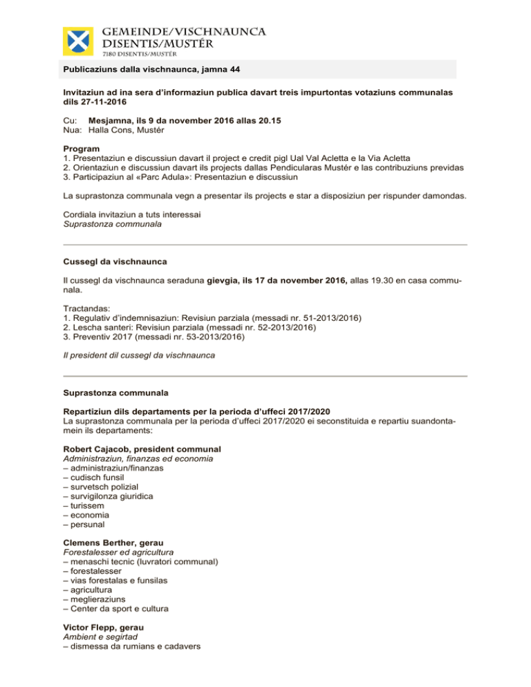 Publicaziuns dalla vischnaunca, jamna 44 Invitaziun ad ina sera d’informaziun publica davart treis impurtontas votaziuns communalas dils 27-11-2016 Cu: Mesjamna, ils 9 da november 2016 allas 20.15 Nua: Halla Cons, Mustér Program 1. Presentaziun e discussiun davart il project e credit pigl Ual Val Acletta e la Via Acletta 2. Orientaziun e discussiun davart ils projects dallas Pendicularas Mustér e las contribuziuns previdas 3. Participaziun al «Parc Adula»: Presentaziun e discussiun La suprastonza communala vegn a presentar ils projects e star a disposiziun per rispunder damondas. Cordiala invitaziun a tuts interessai Suprastonza communala Cussegl da vischnaunca Il cussegl da vischnaunca seraduna gievgia, ils 17 da november 2016, allas 19.30 en casa communala. Tractandas: 1. Regulativ d’indemnisaziun: Revisiun parziala (messadi nr. 51-2013/2016) 2. Lescha santeri: Revisiun parziala (messadi nr. 52-2013/2016) 3. Preventiv 2017 (messadi nr. 53-2013/2016) Il president dil cussegl da vischnaunca Suprastonza communala Repartiziun dils departaments per la perioda d’uffeci 2017/2020 La suprastonza communala per la perioda d’uffeci 2017/2020 ei seconstituida e repartiu suandontamein ils departaments: Robert Cajacob, president communal Administraziun, finanzas ed economia – administraziun/finanzas – cudisch funsil – survetsch polizial – survigilonza giuridica – turissem – economia – persunal Clemens Berther, gerau Forestalesser ed agricultura – menaschi tecnic (luvratori communal) – forestalesser – vias forestalas e funsilas – agricultura – meglieraziuns – Center da sport e cultura Victor Flepp, gerau Ambient e segirtad – dismessa da rumians e cadavers Publicaziuns ufficialas – deponias ed explotaziun da glera – purificaziun dallas auas – santeri – militar – polizia da fiug – protecziun civila – pumpiers Jris Lombris, geraua Sanadad, scolaziun, cultura e sport – Center da sanadad Puntreis – Spital regiunal Surselva – tgira ambulonta – ovras socialas – Seniora-Ca – scolas – formaziun professiunala – temps liber – cultura – sport Iso Mazzetta, gerau Baghegiar ed infrastructura – uffeci da baghegiar – vias, illuminaziun publica – punts e rempars – traffic – edifecis communals – provediment e canalisaziun auas Administraziun communala Elecziuns communalas 2016: Secund scrutini La suprastonza communala ha giu fixau il termin dils 27 d’october 2016 per inoltrar propostas per l’elecziun d’ina ulteriura persuna el cussegl da vischnaunca. Il termin pil secund scrutini ei vegnius fixaus sin ils 27 da november 2016. Per l’elecziun d’in ulteriur commember pil cussegl da vischnaunca ei vegniu inoltrau suandonta proposta: Num: Jasarevic Prenum: Admir Onn da naschientscha: 1986 Adressa: Via Acletta 13, Disentis/Mustér Relaziuns familiaras: maridaus, dus affons Professiun: menader da construcziun Sebasond sin art. 33 dalla lescha davart ils dretgs politics ei in’elecziun tgeua pusseivla tier elecziuns cumplementaras ed el secund scrutini. Damai ch’igl ei buca vegniu annunziau dapli candidats che posts vacants enteifer il termin fixau, ha la suprastonza communala eligiu ils 31 d’october 2016 en in’elecziun tgeua Admir Jasarevic sco commember dil cussegl da vischnaunca per la perioda d’uffeci 2017–2020. Dretg da recuors Sebasond sin art. 37 dalla lescha communala davart ils dretgs politics sa vegnir recurriu encunter sura elecziun enteifer treis dis dapi ch’il motiv da recuors ei vegnius constataus, sil pli tard denton il tierz di suenter la publicaziun ufficiala. Il recuors ei d’inoltrar alla suprastonza communala. Suprastonza communala Publicaziuns ufficialas Jamna 44 2 Publicaziuns ufficialas Cussegl da vischnaunca Ual Val Acletta, projects Pendicularas Mustér e Parc Adula En sia seduta dils 25 d’october 2016 ha il cussegl da vischnaunca sut il tgamun da Livio Zanetti decidiu pliras fatschentas. A caschun dalla sera d’informaziun da gliendisdis, ils 24 d’october 2016 ei la populaziun vegnida informada davart ils projects impurtonts da turissem dallas Pendicularas Mustér e dil Catrina Resort. La gronda participaziun dalla populaziun da Tujetsch e Mustér ha documentau il grond interess. Ils resuns ein stai fetg positivs. Ual Val Acletta/Via Acletta La cumissiun cantunala da prighel ha stuiu surluvrar ils plans da prighel ella vischnaunca da Mustér. Quella revisiun ha giu per consequenza che grondas surfatschas ella zona da baghegiar per liung dils uals ein vegnidas attribuidas da niev ella zona da prighel. Plinavon ein las ustonzas per liung digl ual Acletta buca sufficientas e corrispundan buca allas pretensiuns che sedattan entras il giudichament dalla cumissiun da prighel. Plinavon ei igl uor sin l’altezia dalla staziun da val a Sontga Catrina en in schliet stan. Ina sanaziun dils uors ei muort ils projects turistics dil Catrina Resort vegnida anticipada. Cass cuntrari stuess la sanaziun succeder independent dil svilup turistic enteifer ils proxims onns. Las sbuccadas ella Via Acletta corrispundan buca allas pretensiuns dalla segirtad da traffic. La vesta ei memia cuorta e munta in prighel pils automobilists. Perquei renviescha il cantun quellas sbuccadas. Cun la correctura dalla Via Acletta agl ur digl uor vegn la segirtad da traffic e dil traffic plaun meglieraus. La correctura dalla Via Acletta ei necessaria pil Catrina Resort e vegn finanziada cumpleinamein entras l’interessenza privata. Perencunter ein ton il passapei sco era las fermadas dil bus local incaricas publicas che vegnan era finanziadas independentamein dalla correctura dalla via entras la vischnaunca ed il cantun. Ils cuosts per il rempar ein calculai cun frs. 4 679 390.– e la correctura dalla Via Acletta cun frs. 1 000 000.–. La confederaziun sco era il cantun han mess contribuziuns da frs. 1 807 000.– vid la sanaziun dil rempar Val Acletta en mira. Plinavon separticipescha il cantun vid ils cuosts per las fermad