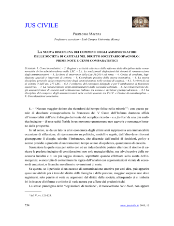 JUS CIVILE PIERLUIGI MATERA Professore associato – Link Campus University (Roma) LA NUOVA DISCIPLINA DEI COMPENSI DEGLI AMMINISTRATORI DELLE SOCIETÀ DI CAPITALI NEL DIRITTO SOCIETARIO SPAGNOLO: PRIME NOTE E CENNI COMPARATISTICI SUMARIO: 1. Cenni introduttivi. – 2. Ragioni e criticità alla base della riforma della disciplina della remuneración de los administradores nella LSC. – 2.1. Le tradizionali disfunzioni dei sistemi di remunerazione degli amministratori. – 3. Le linee di intervento della Ley 31/2014 sul tema. – 4. Codici di condotta, legislazione speciali e interventi di settore. – 5. Coordinate positive della nuova normativa. – 6. La nuova disciplina generale della remunerazione degli amministratori nelle società di capitali. – 6.1. I criteri di cui al comma 4 dell’art. 217 LSC. – 6.2. I compensi del consejero delegado e per l’attribuzione di funciones ejecutivas. – 7. La remunerazione degli amministratori nella sociedad cotizada. – 8. La remunerazione degli amministratori di società nell’ordinamento italiano tra norma e decisioni giurisprudenziali. – 8.1 La disciplina dei compensi degli amministratori nelle società quotate tra T.U.F. e Codice di autodisciplina. – 9. Considerazioni conclusive. 1. – “Nessun maggior dolore che ricordarsi del tempo felice nella miseria” 1: con queste parole di desolante consapevolezza la Francesca del V Canto dell’Inferno dantesco affida all’immortalità dell’arte il disagio derivante dal semplice ricordo – e a fortiori da una più analitica indagine – di una realtà florida in un momento quantomeno non agevole o comunque lontano dalla prosperità. In tal senso, se da un lato la crisi economica degli ultimi anni rappresenta una immancabile occasione di riflessione, di ripensamento su politiche, modelli e regole, dall’altro deve rilevarsi giustappunto il disagio, talvolta l’imbarazzo, che discende dall’analisi di decisioni, policy e norme presidio o prodotto di un tramontato tempo se non di opulenza, quantomeno di crescita. Sensazione la quale reca per solito con sé un indesiderabile portato ulteriore: il rischio di caricare la predetta indagine di considerazioni non solo metagiuridiche, ma talvolta prive della necessaria lucidità e di un più saggio distacco, soprattutto quando effettuate sulla scorta dell’emergenza; o ancor più di contaminare la logica dell’analisi con argomentazioni viziate da eccesso di emozioni, o finanche moralismi e revanscismi di sorta. Se questo, se il pericolo di un eccesso di contaminazione emotiva per così dire, può apparire quasi inevitabile per i temi del diritto della famiglia e delle persone, maggior sorpresa non deve registrarsi, solo perché si verta su argomenti del diritto delle società, allorquando ci si imbatta ivi in istanze di riforma o critiche di varia natura pur affette dai predetti rischi. Lo stesso paradigma delle “legislazioni di reazione”, il rooseveltiano New Deal, non appare 1 754 Inf. V, vv. 121-123. www. juscivile. it, 2015, 12 JUS CIVILE scevro almeno in parte da scelte non del tutto fondate su ragioni giuridiche o economiche, anzi talvolta collegate a motivazioni politiche – se non finanche istintive o populistiche ed elettoralistiche, secondo un’autorevole quanto accattivante lettura 2. Il che ovviamente non significa che ogni riforma che, in tempo di crisi, verta in tema di trasparenza o imponga dei limiti di sorta possa tacciarsi di populismo: chiaramente gli interventi di riforma o l’introduzione di limitazioni non possono sempre accogliersi con sospetto o derubricarsi a provvedimenti di facciata. Tout simplement, ponderazione, equilibrio sistematico ed efficacia di tali interventi vanno accuratamente valutati, con atteggiamenti di distacco, se non temporale, quantomeno emotivo, sia in sede di riforma che in sede di commento alla medesima; e, quindi, vuoi per rigore scientifico che per reale volontà di non introdurre regole in grado di sortire effetti peggiori rispetto ai mali da curare – quali ad esempio una paralisi nelle scelte gestionali o altri esiti paradossali che influiscano negativamente sulle performance del management. Proprio in quest’ambito, invero, possono rinvenirsi tematiche che più di altre prestano il fianco ai menzionati rischi, in linea generale e ancor più nei venti (di riforma) che soffiano forti nella burrasca di una crisi economica. E ciò perché la modifica introdotta sull’onda di una reazione non composta può creare uno squilibrio nel modello in cui tale regola è posta – tessera di un mosaico che di poi non restituisce più un’immagine compiuta –, tanto più a fronte di un legislatore – quello italiano – che da almeno due decadi denuncia una pericolosa disaffezione verso le ricostruzioni dogmatiche; ma anche perché si muovono (tali tematiche) su terreni delicati, di per sé oggetto di facile indignazione e di agevoli quanto strumentali campagne di bandiera 3. Costituisce un limpido esempio di tanto l’ormai spinoso argomento dei compensi degli amministratori delle società di capitali, e in specie – com’è naturale – di quelle quotate – ove si manifesta generalmente quella separazione tra proprietà e controllo che riduce sostanzialmente la capacità di controllo, e in generale di decisione, dell’organo assembleare. 2 M.J. ROE, Strong managers, Weak Owners: the Political Roots of American Corporate Finance, Princeton, 1994, passim. 3 Sugli interventi in tema di corporate governance alla luce della più recente crisi economica v., ex plurimis, S. M. BAINRIDGE, Corporate Governance After the Financial Crisis, Oxford-New York, 2012, 3 ss. e in specie 28 ss.; P.M. VASUDEV, S. WATSON, Corporate Governance After the Financial Crisis, Cheltenham, 2012, passim; J. STROUHAL, C. BONACI, R. MUSTATA, Corporate Governance and Financial Crisis, in International Atlantic Economic Society, 2012, 122 ss.; G. KIRKPATRICK, The corporate governance lessons from the financial c