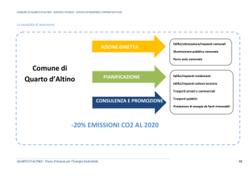 COMUNE DI QUARTO D’ALTINO - SERVIZIO TECNICO - UFFICIO PATRIMONIO E INFRASTRUTTURE La modalità di intervento AZIONE DIRETTA Edifici/attrezzature/impianti comunali Illuminazione pubblica comunale Parco auto comunale Comune di Quarto d’Altino PIANIFICAZIONE Edifici/impianti residenziali Edifici/impianti settore terziario Trasporti privati e commerciali CONSULENZA E PROMOZIONE Trasporti pubblici Produzione di energia da fonti rinnovabili -20% EMISSIONI CO2 AL 2020 QUARTO D’ALTINO | Piano d’Azione per l’Energia Sostenibile 30 COMUNE DI QUARTO D’ALTINO - SERVIZIO TECNICO - UFFICIO PATRIMONIO E INFRASTRUTTURE Interventi di efficienza energetica nella pubblica illuminazione. Incremento dell’utilizzo di prodotti e forniture validi sotto il profilo ambientale. In applicazione del Green Public Procurement, prediligere negli acquisti di prodotti e/o servizi, quelli che comportano un minore impatto sull’ambiente. In particolare nelle procedure di appalto prevedere obbligatoriamente una voce relativa alla sostenibilità ambientale legata al prodotto/processo, di cui tener conto nei criteri di valutazione per l’aggiudicazione. Applicazione del Codice dell’Amministrazione Digitale (CAD). L’utilizzo di procedure digitalizzate di protocollo, invio/ricezione documenti, archiviazione, pubblicazione di dati comporta un maggiore efficienza nello svolgimento delle attività amministrative , sia a livello di riduzione dei tempi richiesti, sia a livello di spostamenti con conseguente riduzione delle emissioni dovute a tutte le fasi di ogni procedura burocratica. QUARTO D’ALTINO | Piano d’Azione per l’Energia Sostenibile In accordo con il piano per la pubblica illuminazione attuare interventi di sostituzione di componenti della rete ( corpi illuminanti, quadri elettrici, alimentatori) con modelli più efficienti, adeguare inoltre il sistema di gestione. AZIONE DIRETTA Si intende attuare una serie di interventi sulle strutture/impianti/attrezzature comunali perseguendo gli obiettivi di efficienza energetica. Sottoscrizione contratto di fornitura di energia elettrica certificata “verde”; 31 COMUNE DI QUARTO D’ALTINO - SERVIZIO TECNICO - UFFICIO PATRIMONIO E INFRASTRUTTURE Un aspetto fondamentale per la vivibilità della città è il suo sistema della mobilità. Il Comune agendo sia sui mezzi di sua competenza, sia mediante altre misure specifiche vuole attuare una politica a favore della mobilità sostenibile, che significa: meno traffico, meno inquinamento atmosferico, città più pulita, accessibile, vivibile. Rinnovo del parco mezzi comunale . Il programma prevede la sostituzione progressiva dei mezzi con nuovi veicoli a metano, con tecnologia ibrida o elettrica. Misure integrate per la mobilità sostenibile. Si prevede un programma di interventi mirato a connettere le tratte ciclopedonali esistenti e a garantire un collegamento con i percorsi sovracomunali. Un’accessibilità più efficiente ed integrata consente infatti una migliore fruizione da parte dei cittadini e incentiva il turismo sostenibile. L’Amministrazione individua come prioritari l’attivazione di un servizio Bike Sharing/Car sharing per spostamenti sulla tragitto Quarto d’Altino-Portegrandi e l’attivazione di un servizio Car Pooling spontaneo a Portegrandi. Saranno valorizzati inoltre i punti di sosta, coincidenti con aree nodali del territorio comunale (spazi pubblici, aree verdi e punti di interesse storico culturale) dotandoli di cicloposteggi e pensiline per Bike Sharing. Si prevede inoltre di implementare il Pedibus (attivo già da due anni)e di affiancarvi un servizio per l’accesso alle scuole tramite bicicletta. QUARTO D’ALTINO | Piano d’Azione per l’Energia Sostenibile 32 COMUNE DI QUARTO D’ALTINO - SERVIZIO TECNICO - UFFICIO PATRIMONIO E INFRASTRUTTURE PIANIFICAZIONE Il governo locale intende aggiornare i propri strumenti di pianificazione includendo strategie orientate alla sostenibilità e norme incentivanti gli interventi di efficienza energetica. Elaborare un Allegato Energetico al Regolamento Edilizio/Riqualificazione energetica del parco edilizio privato. Partendo dal fatto che gli edifici del settore terziario/industriale e residenziale coincidono con i settori più energivori, si ritiene necessario che il Piano regolatore non consideri solamente gli aspetti urbanistici, ma anche quelli legati all’efficienza energetica. Per quanto riguarda il settore residenziale, si tratta di incidere maggiormente sul regolamento edilizio, incentivando anche chi supera lo standard previsto dalle normative vigenti (con forme da definire fornendo indicazioni precise su modalità consigliate di ristrutturazione/costruzione). L’Allegato Energetico al Regolamento Edilizio Comunale darà indicazioni relativamente alle caratteristiche energetiche e costruttive che dovranno essere rispettate in caso di nuova costruzione o di consistente ristrutturazione. In particolare si farà riferimento alle direttive del Burdain Sharing applicando, attraverso il regolamento edilizio, l’obbligo di prevedere l’uso di tecnologie che utilizzino fonti rinnovabili per l’autoproduzione di energia per quanto riguarda edifici di nuova edificazione e ed “edifici sottoposti a ristrutturazioni rilevanti”(definiti nell’art.11 dell’allegato 3 del D.Lgs n. 28/2011). QUARTO D’ALTINO | Piano d’Azione per l’Energia Sostenibile 33 COMUNE DI QUARTO D’ALTINO - SERVIZIO TECNICO - UFFICIO PATRIMONIO E INFRASTRUTTURE Predisporre un quadro normativo aggiornato in materia di impianti per la produzione di energia da fonti rinnovabili (dalla definizione dell' iter autorizzativo e della documentazione necessaria, alle norme per la realizzazione e alle modalità di interazione con i distributori di energia..) per favorirne la realizzazione, in primo luogo per quanto riguarda edifici comunali e anche e soprattutto per i privati cittadini e per il settore terziario. Predisporre il del Piano del Traffico con l’obietti