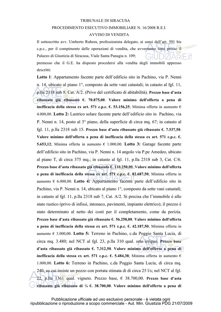 TRIBUNALE DI SIRACUSA PROCEDIMENTO ESECUTIVO IMMOBILIARE N. 16/2008 R.E.I. AVVISO DI VENDITA Il sottoscritto avv. Umberto Rubera, professionista delegato, ai sensi dell’art. 591 bis c.p.c., per il compimento delle operazioni di vendita, che avverranno tutte presso il Palazzo di Giustizia di Siracusa, Viale Santa Panagia n. 109; premesso che il G.E. ha disposto procedersi alla vendita degli immobili appresso descritti: Lotto 1: Appartamento facente parte dell’edificio sito in Pachino, via P. Nenni n. 14, ubicato al piano 1°, composto da sette vani catastali; in catasto al fgl. 11, p.lla 2318 sub 8, Cat. A/2. (Privo del certificato di abitabilità). Prezzo base d’asta ribassato già ribassato €. 70.875,00. Valore minimo dell'offerta a pena di inefficacia della stessa ex art. 571 c.p.c. €. 53.156,25; Minima offerta in aumento € 4.000,00. Lotto 2: Lastrico solare facente parte dell’edificio sito in Pachino, via P. Nenni n. 14, posto al 3° piano, della superficie di circa mq. 67; in catasto al fgl. 11, p.lla 2318 sub 15. Prezzo base d’asta ribassato già ribassato €. 7.537,50. Valore minimo dell'offerta a pena di inefficacia della stessa ex art. 571 c.p.c. €. 5.653,12; Minima offerta in aumento € 1.000,00. Lotto 3: Garage facente parte dell’edificio sito in Pachino, via P. Nenni n. 14 angolo via P.pe Amedeo, ubicato al piano T, di circa 375 mq.; in catasto al fgl. 11, p.lla 2318 sub 3, Cat. C/6. Prezzo base d’asta ribassato già ribassato €. 110.250,00. Valore minimo dell'offerta a pena di inefficacia della stessa ex art. 571 c.p.c. €. 82.687,50; Minima offerta in aumento € 6.000,00. Lotto 4: Appartamento facente parte dell’edificio sito in Pachino, via P. Nenni n. 14, ubicato al piano 1°, composto da sette vani catastali; in catasto al fgl. 11, p.lla 2318 sub 7, Cat. A/2. Si precisa che l’immobile è allo stato rustico (privo di infissi, intonaco, pavimenti, impianto elettrico); il prezzo è stato determinato al netto dei costi per il completamento, come da perizia. Prezzo base d’asta ribassato già ribassato €. 56.250,00. Valore minimo dell'offerta a pena di inefficacia della stessa ex art. 571 c.p.c. €. 42.187,50; Minima offerta in aumento € 3.000,00. Lotto 5: Terreno in Pachino, c.da Poggio Santa Lucia, di circa mq. 3.480; nel NCT al fgl. 23, p.lla 310 qual. orto irriguo. Prezzo base d’asta ribassato già ribassato €. 7.312,50. Valore minimo dell'offerta a pena di inefficacia della stessa ex art. 571 c.p.c. €. 5.484,38; Minima offerta in aumento € 1.000,00. Lotto 6: Terreno in Pachino, c.da Poggio Santa Lucia, di circa mq. 240, su cui insiste un pozzo con portata stimata di di circa 25 l/s; nel NCT al fgl. 22, p.lla 1361 qual. vigneto. Prezzo base, € 38.700,00. Prezzo base d’asta ribassato già ribassato di ¼ €. 38.700,00. Valore minimo dell'offerta a pena di Pubblicazione ufficiale ad uso esclusivo personale - è vietata ogni ripubblicazione o riproduzione a scopo commerciale - Aut. Min. Giustizia PDG 21/07/2009 inefficacia della stessa ex art. 571 c.p.c. €. 29.025,00; Minima offerta in aumento € 2.000,00. Gli immobili saranno posti in vendita nello stato di fatto e di diritto in cui si trovano, risultante dalla documentazione in atti, anche in relazione alla legge n. 47 del 1985 ed al testo unico di cui al D.P.R. n. 380 del 2001 e loro successive modificazioni e/o integrazioni, con espresso avvertimento che l’aggiudicatario potrà, ricorrendone i presupposti, avvalersi delle disposizioni di cui all’art. 46, comma 5, del citato testo unico, e di cui all’art. 40, 6° comma, della citata legge 28/2/85 n. 47, con presentazione della domanda di concessione o permesso in sanatoria entro 120 giorni dalla notifica del decreto di trasferimento. Inoltre, si dichiara espressamente che per detti immobili non sono stati rilasciati l’APE e di non essere in grado di verificare se tutti gli impianti (elettrici, idrici, sanitari, radiotelevisivi, riscaldamento, gas, ecc.) posti a servizio degli stessi siano conformi alle normative vigenti. Detti immobili, pertanto, anche relativamente ai suddetti impianti, verranno venduti nello stato di fatto in cui questi ultimi oggi si trovano e relativamente ai quali viene espressamente esclusa la garanzia di legge. Ed inoltre, - ritenuto che occorre fissare sia i termini per la presentazione delle offerte di acquisto senza incanto e la data per l’esame delle stesse; - ritenuto che chiunque, ad eccezione del debitore, è ammesso a presentare offerte per l’acquisto degli immobili pignorati personalmente o a mezzo di procuratore legale anche a norma dell’art. 579, ultimo comma, c.p.c.; - ritenuto che l’offerente deve presentare, presso lo studio del professionista delegato in Siracusa, Via Mons. S. Gozzo n. 5, e previo appuntamento telefonico (0931.492858), una dichiarazione in regola con il bollo, contenente le proprie generalità e, in caso di persone fisiche, lo stato civile e, se del caso, il regime patrimoniale (in caso di comunione legale dovranno essere indicati anche i dati del coniuge), il recapito telefonico nonché – a pena di inefficacia – l’indicazione del prezzo e del bene o dei beni a cui detta offerta si riferisce, del modo e tempo di pagamento e ogni elemento utile alla valutazione dell’offerta stessa, oltre a copia di valido documento di identità e del codice fiscale e, se necessario, valida documentazione comprovante i poteri o la legittimazione; - ritenuto che in caso di dichiarazione presentata da più soggetti, deve essere indicato quello che abbia l’esclusiva facoltà di formulare eventuali offerte in aumento; - ritenuto che l’offerta (disciplinata dall’art. 571 c.p.c.), deve pervenire, a pena di inefficacia, entro le ore 11.00 del giorno precedente la vendita; - ritenuto che l’offerta deve essere depositata in busta chiusa all’interno della quale vanno inseriti la suddetta dichiarazione nonché una somma, a mezzo di assegni circolari non trasfer