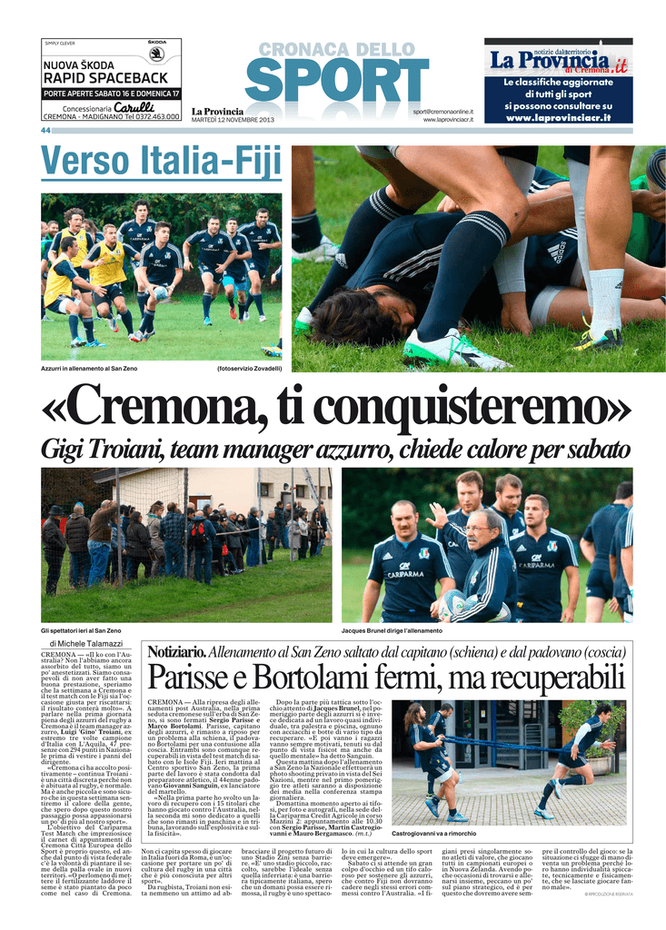 NUOVA ŠKODA RAPID SPACEBACK PORTE APERTE SABATO 16 E DOMENICA 17 La Provincia [email protected] www.laprovinciacr.it MARTEDÌ 12 NOVEMBRE 2013 Le classifiche aggiornate di tutti gli sport si possono consultare su www.laprovinciacr.it 44 Verso Italia-Fiji Azzurri in allenamento al San Zeno (fotoservizio Zovadelli) «Cremona, ti conquisteremo» Gigi Troiani, team manager azzurro, chiede calore per sabato Gli spettatori ieri al San Zeno di Michele Talamazzi CREMONA — «Il ko con l'Australia? Non l'abbiamo ancora assorbito del tutto, siamo un po' anestetizzati. Siamo consapevoli di non aver fatto una buona prestazione, speriamo che la settimana a Cremona e il test match con le Fiji sia l'occasione giusta per riscattarsi: il risultato conterà molto». A parlare nella prima giornata piena degli azzurri del rugby a Cremona è il team manager azzurro, Luigi 'Gino' Troiani, ex estremo tre volte campione d'Italia con L'Aquila, 47 presenze con 294 punti in Nazionale prima di vestire i panni del dirigente. «Cremona ci ha accolto positivamente – continua Troiani è una città discreta perché non è abituata al rugby, è normale. Ma è anche piccola e sono sicuro che in questa settimana sentiremo il calore della gente, che spero dopo questo nostro passaggio possa appassionarsi un po' di più al nostro sport». L'obiettivo del Cariparma Test Match che impreziosisce il carnet di appuntamenti di Cremona Città Europea dello Sport è proprio questo, ed anche dal punto di vista federale c'è la volontà di piantare il seme della palla ovale in nuovi territori. «O perlomeno di mettere il fertilizzante laddove il seme è stato piantato da poco come nel caso di Cremona. Jacques Brunel dirige l’allenamento Notiziario. Allenamento al San Zeno saltato dal capitano (schiena) e dal padovano (coscia) Parisse e Bortolami fermi, ma recuperabili CREMONA — Alla ripresa degli allenamenti post Australia, nella prima seduta cremonese sull'erba di San Zeno, si sono fermati Sergio Parisse e Marco Bortolami. Parisse, capitano degli azzurri, è rimasto a riposo per un problema alla schiena, il padovano Bortolami per una contusione alla coscia. Entrambi sono comunque recuperabili in vista del test match di sabato con le Isole Fiji. Ieri mattina al Centro sportivo San Zeno, la prima parte del lavoro è stata condotta dal preparatore atletico, il 44enne padovano Giovanni Sanguin, ex lanciatore del martello. «Nella prima parte ho svolto un lavoro di recupero con i 15 titolari che hanno giocato contro l'Australia, nella seconda mi sono dedicato a quelli che sono rimasti in panchina e in tribuna, lavorando sull'esplosività e sulla fisicità». Non ci capita spesso di giocare in Italia fuori da Roma, è un'occasione per portare un po' di cultura del rugby in una città che è più conosciuta per altri sport». Da rugbista, Troiani non esita nemmeno un attimo ad ab- Dopo la parte più tattica sotto l'occhio attento di Jacques Brunel, nel pomeriggio parte degli azzurri si è invece dedicata ad un lavoro quasi individuale, tra palestra e piscina, ognuno con acciacchi e botte di vario tipo da recuperare. «E poi vanno i ragazzi vanno sempre motivati, tenuti su dal punto di vista fisicot ma anche da quello mentale» ha detto Sanguin. Questa mattina dopo l'allenamento a San Zeno la Nazionale effettuerà un photo shooting privato in vista del Sei Nazioni, mentre nel primo pomeriggio tre atleti saranno a disposizione dei media nella conferenza stampa giornaliera. Domattina momento aperto ai tifosi, per foto e autografi, nella sede della Cariparma Credit Agricole in corso Mazzini 2: appuntamento alle 10.30 con Sergio Parisse, Martin Castrogiovanni e Mauro Bergamasco. (m.t.) bracciare il progetto futuro di uno Stadio Zini senza barriere. «E' uno stadio piccolo, raccolto, sarebbe l'ideale senza quella inferriata: è una barriera tipicamente italiana, spero che un domani possa essere rimossa, il rugby è uno spettaco- Castrogiovanni va a rimorchio lo in cui la cultura dello sport deve emergere». Sabato ci si attende un gran colpo d'occhio ed un tifo caloroso per sostenere gli azzurri, che contro Fiji non dovranno cadere negli stessi errori commessi contro l'Australia. «I fi- giani presi singolarmente sono atleti di valore, che giocano tutti in campionati europei o in Nuova Zelanda. Avendo poche occasioni di trovarsi e allenarsi insieme, peccano un po' sul piano strategico, ed è per questo che dovremo avere sem- pre il controllo del gioco: se la situazione ci sfugge di mano diventa un problema perché loro hanno individualità spiccate, tecnicamente e fisicamente, che se lasciate giocare fanno male». © RIPRODUZIONE RISERVATA La Provincia www.laprovinciacr.it SPORT Le Nazionali dell’Italia e delle Isole Fiji si sono finora incontrate per otto volte, e il bilancio è in parità con quattro vittorie per parte. La prima sfida, il 14 giugno del 1980, vide la vittoria dei Fijiani volanti per 16-3; gli azzurri per prendersi la prima soddisfazione hanno dovuto attendere il 31 maggio 1987. MARTEDÌ 12 NOVEMBRE 2013 I precedenti sono otto, con quattro successi per parte Ma fu un successo pesante, in quanto è finora l’unico incontro giocato fra le due squadre in Coppa del Mondo: 18-15 per l’Italia. Il 29 agosto ’99 e il 15 luglio 2000 due scon- fitte consecutive per l’Italia (32-50 e la più pesante di sempre, 9-43); poi doppia rivincita con il perentorio 66-10 del 10 novembre 2001 e il 23-8 del 26 novembre 2005. Sconfitta 29-18 il 17 giugno 2006 e vitto- 45 ria 24-16 il 27 novembre 2010. Insomma la storia parla di una sfida altalenante, senza la prevalenza dell’una o dell’altra: un equilibrio che sabato allo stadio Zini bisognerà spezzare a nostro favore. Almeno in attesa della prossima partita fra due Nazionali così diverse e così... pari. Quello di sabato è uno scontro diretto fra le due squadre, che hanno superato insieme Tonga La vittoria è indispensabile all’Italia per restare 11ª nel ranking mondiale Quell
