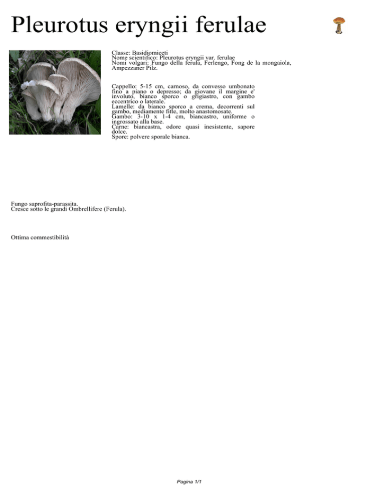 Pleurotus eryngii ferulae Classe: Basidiomiceti Nome scientifico: Pleurotus eryngii var. ferulae Nomi volgari: Fungo della ferula, Ferlengo, Fong de la mongaiola, Ampezzaner Pilz. Cappello: 5-15 cm, carnoso, da convesso umbonato fino a piano o depresso; da giovane il margine e' involuto, bianco sporco o grigiastro, con gambo eccentrico o laterale. Lamelle: da bianco sporco a crema, decorrenti sul gambo, mediamente fitte, molto anastomosate. Gambo: 3-10 x 1-4 cm, biancastro, uniforme o ingrossato alla base. Carne: biancastra, odore quasi inesistente, sapore dolce. Spore: polvere sporale bianca. Fungo saprofita-parassita. Cresce sotto le grandi Ombrellifere (Ferula). Ottima commestibilità Pagina 1/1