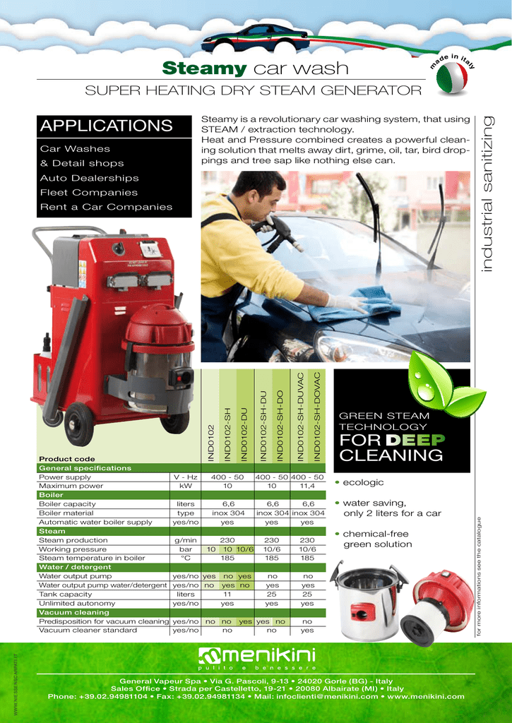 m e in ita ly Steamy car wash ad Car Washes & Detail shops Steamy is a revolutionary car washing system, that using STEAM / extraction technology. Heat and Pressure combined creates a powerful cleaning solution that melts away dirt, grime, oil, tar, bird droppings and tree sap like nothing else can. Auto Dealerships Fleet Companies IND0102-SH-DOVAC IND0102-SH-DUVAC IND0102-SH-DO IND0102-SH-DU IND0102-DU IND0102-SH IND0102 Rent a Car Companies WWW.NIESSENSCARPATI.IT Product code General specifications Power supply V - Hz 400 - 50 400 - 50400 - 50 Maximum power kW 10 10 11,4 Boiler Boiler capacity liters 6,6 6,6 6,6 Boiler material type inox 304 inox 304 inox 304 Automatic water boiler supply yes/no yes yes yes Steam Steam production g/min 230 230 230 Working pressure bar 10 10 10/6 10/6 10/6 Steam temperature in boiler °C 185 185 185 Water / detergent Water output pump yes/no yes no yes no no Water output pump water/detergent yes/no no yes no yes yes Tank capacity liters 11 25 25 Unlimited autonomy yes/no yes yes yes Vacuum cleaning Predisposition for vacuum cleaning yes/no no no yes yes no no Vacuum cleaner standard yes/no no no yes GREEN STEAM TECHNOLOGY FOR DEEP CLEANING • ecologic • water saving, only 2 liters for a car • chemical-free green solution General Vapeur Spa • Via G. Pascoli, 9-13 • 24020 Gorle (BG) - Italy Sales Office • Strada per Castelletto, 19-21 • 20080 Albairate (MI) • Italy Phone: +39.02.94981104 • Fax: +39.02.94981134 • Mail: [email protected] • www.menikini.com for more informations see the catalogue APPLICATIONS industrial sanitizing SUPER HEATING DRY STEAM GENERATOR