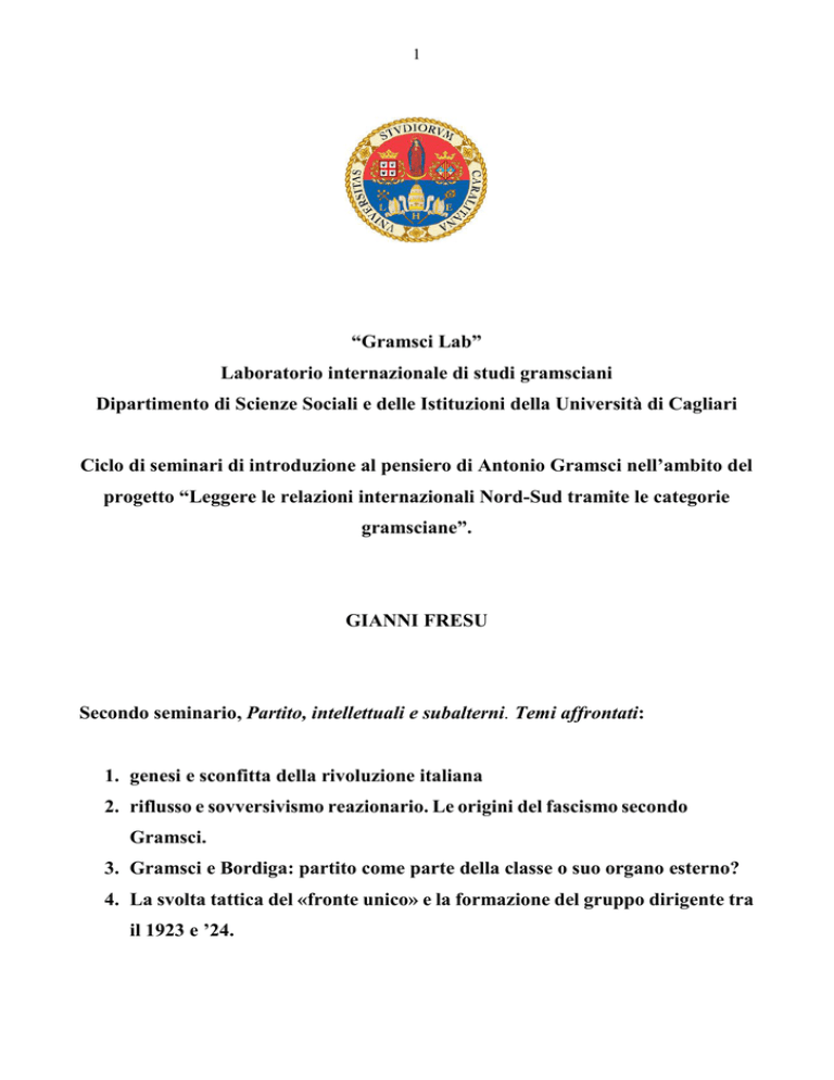 1 “Gramsci Lab” Laboratorio internazionale di studi gramsciani Dipartimento di Scienze Sociali e delle Istituzioni della Università di Cagliari Ciclo di seminari di introduzione al pensiero di Antonio Gramsci nell’ambito del progetto “Leggere le relazioni internazionali Nord-Sud tramite le categorie gramsciane”. GIANNI FRESU Secondo seminario, Partito, intellettuali e subalterni. Temi affrontati: 1. genesi e sconfitta della rivoluzione italiana 2. riflusso e sovversivismo reazionario. Le origini del fascismo secondo Gramsci. 3. Gramsci e Bordiga: partito come parte della classe o suo organo esterno? 4. La svolta tattica del «fronte unico» e la formazione del gruppo dirigente tra il 1923 e ’24. 2 Genesi e sconfitta della rivoluzione italiana. La battaglia immediata su cui “l'Ordine Nuovo” riversò tutte le sue energie era dunque quella per rendere le Commissioni interne effettivi organi di autogoverno operaio, vale a dire, sottrarle a una pratica semplificante e burocratica in virtù della quale era in sostanza il sindacato a nominare i commissari. La profonda riorganizzazione del sistema dei Consigli avrebbe dovuto portare all’elezione dei commissari da parte di tutti gli operai, a prescindere dalla loro appartenenza o meno al sindacato, dunque alla trasformazione delle Commissioni in organi di rappresentanza operaia per unità produttiva, strutturata sulla base della squadra di reparto, o l’officina 1. Bisognava far superare alla Commissione la condizione di organo di rappresentanza generica delle maestranze, predisponendola a un ruolo nuovo: assumere il controllo della produzione. Il sistema consiliare avrebbe in questo modo trasformato il concetto di rappresentanza, non più strutturato in base a principi territoriali, ma a partire dall'unità di produzione. Al XVI Congresso nazionale del PSI, tenutosi nel 1919 a Bologna, le posizioni dell'«Ordine Nuovo» non trovarono cittadinanza, anzi le varie anime del Partito, divise su tutto, trovavano un punto di accordo proprio nella profonda critica all'esperienza consiliare. Intanto Bordiga già nel maggio del 1919 avanzò esplicitamente il tema della scissione dei comunisti dal PSI: il 13 luglio presentò al Consiglio Nazionale del PSI il Programma della frazione comunista; il 10 novembre inviò una lettera alla III Internazionale nella quale proponeva concretamente l’idea della scissione comunista, presentandosi come l’unica sezione dell’IC in contrapposizione ai massimalisti, e muovendo precise critiche al movimento consiliare di Torino. Secondo Bordiga l'esito naturale del movimento consiliare era il riformismo e il corporativismo dei sindacati di categoria, e con esso la rimozione del problema della costituzione del partito rivoluzionario della classe operaia. Per Bordiga l’unico compito dei comunisti doveva essere costituirsi in partito politico, e prepararsi sul piano ideologico al momento della rivoluzione, o comunque alla radicalizzazione dello scontro sociale. In questo senso i Consigli operai dovevano sorgere solo nel momento dell’insurrezione politica o comunque nel momento della massima crisi della borghesia, perché viceversa questi si sarebbero trasformati rapidamente in organismi dediti a una pratica riformista e alla tattica delle conquiste parziali, che avrebbe distolto i comunisti dai loro compiti rivoluzionari. Anche nel vivo del «biennio rosso» Bordiga non diede mai credito agli sviluppi del movimento consiliare, mostrando una costante e quasi morbosa diffidenza verso l'autogoverno operaio; Bordiga oltre quella fase di La proposta di riforma del sistema consiliare prevedeva l’elezione democratica dei commissari, questi avrebbero composto il Consiglio di fabbrica, il quale avrebbe poi a sua volta espresso la Commissione interna. 1 3 radicalizzazione dello scontro sociale intravedeva una nuova lunga stagione di collaborazione di classe, senza comprendere che all'orizzonte si profilava non il trionfo del riformismo socialdemocratico ma la reazione più nera. Secondo Gramsci lo Stato socialista doveva realizzarsi attraverso una ricca articolazione di istituti e forme partecipative delle masse tale da non risolversi nel partito, per Bordiga invece le forme associative della classe operaia andavano intese come semplici organi di decentramento del partito, cinghie di trasmissione, sottoposte in tutto e per tutto al controllo e alla direzione del partito, che a sua volta doveva essere un organo esterno alla classe, non una sua parte organica. All'interno del panorama socialista in Italia il gruppo de “l’Ordine Nuovo” era il solo ad aver recepito e «tradotto in lingua italiana», il significato del movimento consiliare tedesco, dell’esperienza dei Soviet in Russia, del movimento dei delegati d’officina in Inghilterra (gli Shop-Stewards Commities), cioè ad essersi rapportato creativamente alle esperienze più nuove del movimento operaio europeo. L'interesse nei confronti del dibattito teorico e delle concrete esperienze di lotta sviluppatesi a livello internazionale, era del resto confermato dallo spazio che “l’Ordine Nuovo” dedicava al movimento internazionale dei Consigli, tramite la pubblicazione della rassegna internazionale più ricca di contributi al tempo. Erano così pubblicate le relazioni più significative dell’Internazionale Comunista, gli interventi di Lukàcs, quelli di Daniel de Leon, Zinove’v, Bela Kun, di John Reed solo per citarne alcuni. Semmai il vero limite nell’impostazione del gruppo de “l’Ordine Nuovo”, come gli stessi protagonisti hanno del resto più volte confermato in seguito, risiedeva nella scarsissima propensione ad avviare una battaglia non solo di idee dentro il partito, nella convinzione che, da solo, il lavoro tra le masse potesse cambiare i rapporti di forza nel movimento socialista italiano. Ancora per tutto il 1919, l’attenzione del periodico era totalmente rivolta alla costruzione del movimento operaio torinese e al lavoro 