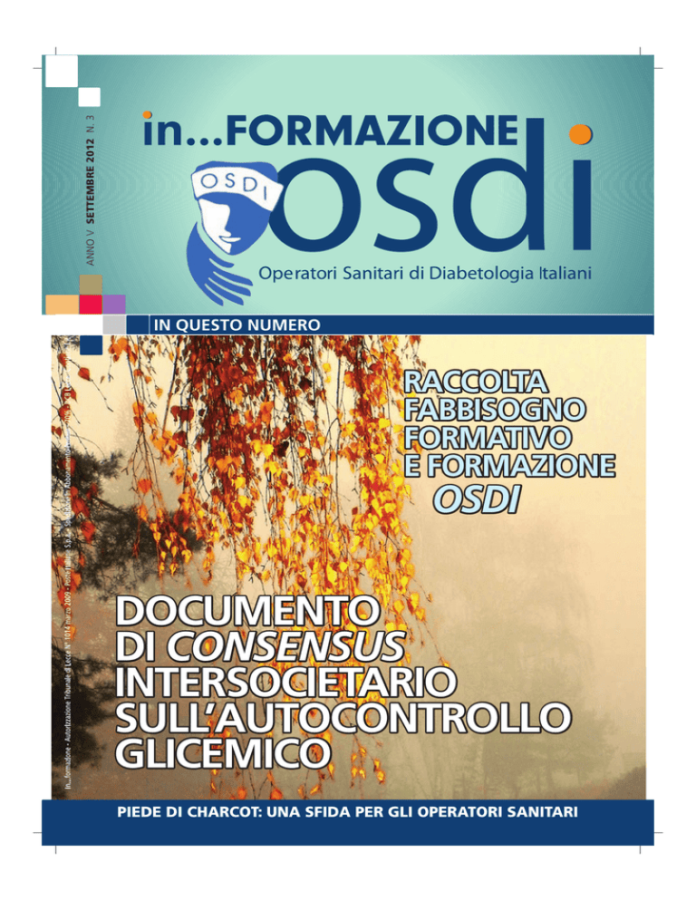 ANNO V SETTEMBRE 2012 N. 3 IN QUESTO NUMERO RACCOLTA RACCOLT RACCOL TA FABBISOGNO FABBISOGNO FORMATIVO FORMATIVO E FORMAZIONE OSDI DOCUMENTO DI CONSENSUS INTERSOCIETARIO INTERSOCIETARIO SULL’AUTOCONTROLLO SULL’AUTOCONTROLLO GLICEMICO PIEDE DI CHARCOT: UNA SFIDA PER GLI OPERATORI SANITARI norme per gli autori Le proposte di pubblicazione saranno accettate a giudizio del comitato di redazione. Ogni articolo esprime il lavoro e/o le convinzioni degli autori i quali assumono la responsabilità di quanto dichiarato. Quando l’articolo esprime o può coinvolgere la responsabilità o l’immagine dell’istituzione di appartenenza o quando gli autori parlano a nome della medesima, occorrerà una liberatoria scritta dei relativi responsabili. La pubblicazione dei lavori è gratuita; il materiale anche originale pervenuto, anche se non pubblicato, non sarà restituito. Gli autori sono tenuti a specificare se la proposta di pubblicazione è stata inoltrata presso altre riviste. Il comitato editoriale si riserva di eseguire, nell’eventualità che appaia opportuno, un lavoro di revisione formale del testo, ferma restando la conservazione dei contenuti espressi dall’Autore, per renderli conformi allo stile della Rivista La rivista In...formazione OSDI pubblica lavori di interesse didattico, scientifico e assistenziali riguardanti il diabete e gli argomenti correlati. Indicare, oltre al proprio indirizzo, il numero di fax e l’indirizzo e-mail per l’eventuale corrispondenza. La struttura del lavoro dovrà conformarsi alle seguenti indicazioni: - Titolo: il titolo deve essere il più possibile conciso, ma chiaramente esplicativo della natura del lavoro. - Nome dell’Autore (o degli Autori): nomi e cognomi per esteso in lettere maiuscole; accanto a ciascun nome uno o più asterischi con riferimento alla successiva indicazione. - Indicazione, preceduta dal relativo numero di asterischi, per ciascun autore della qualifica o struttura di appartenenza; va indicato l’indirizzo e-mail dell’Autore cui fare riferimento. - Riassunto: il riassunto dovrà essere non superiore alle 300 parole e illustrare succintamente scopo del lavoro e risultati. - I riferimenti bibliografici dovranno essere riportati in calce al lavoro numerati progressivamente in cifre arabe poste tra parentesi quadre: indicando il cognome e le iniziali del nome dell’Autore, il titolo dell’articolo per esteso, il titolo della rivista, il volume (in corsivo), i numeri della prima e dell’ultima pagina e l’anno. Le bozze di stampa inviate agli autori devono essere corrette e restituite entro 4 giorni. Il materiale dovrà essere inviato all’indirizzo e-mail: [email protected] o su supporto digitale a: Chiandetti Roberta SOC 1 Medicina Generale Azienda Ospedaliero-Universitaria 33100 Udine som ma rio IN QUESTO NUMERO IN...FORMAZIONE Periodico trimestrale dell’Associazione OSDI Operatori Sanitari di Diabetologia Italiani Via Guelfa, 9 - 40138 Bologna www.osdi.it Autorizzazione del tribunale di Lecce n. 1014 - marzo 2009 DIRETTORE RESPONSABILE Roberta Chiandetti editoriale del direttore di Roberta Chiandetti vita associativa a cura di Roberta Chiandetti VICE-DIRETTORE Maria Teresa Branca COMITATO SCIENTIFICO Roberta Chiandetti Maria Teresa Branca Rosanna Toniato Lia Cucco COMITATO DI REDAZIONE Gemma Annicelli Lia Cucco Raffaella Fiorentino Giuseppe Frigau Elisa Levis Giovanni Lo Grasso Alberto Pambianco Clara Rebora Anna Satta Hai Annamaria Tesei Claudio Vitiello Documento di consensus intersocietario sull’autocontrollo glicemico nursing diabetologico a cura di Lia Cucco scuola di formazione permanente OSDI a cura del Direttore della Scuola di Formazione OSDI Articolo originale PROGETTAZIONE GRAFICA, IMPAGINAZIONE E STAMPA Carra Editrice 73042 Casarano (Le) Tel. 0833.502319 Piede di Charcot: una sfida per gli operatori sanitari di Lucia Pagano, Assunta Boccolato 5 8 14 36 49 53 direttore Cari tutti, con piacere vi presento il terzo numero della nostra Rivista In…Formazione OSDI che ancora una volta ci vede impegnati ed entusiasti a dispetto del periodo non facile che stiamo vivendo nella sanità e non solo. Anche la nascita di nuove Sezioni Regionali è un segno di questo nostro entusiasmo e della voglia di mettersi in gioco per migliorare, sempre e comunque. Ecco perché va il nostro augurio di buon lavoro e un grosso in bocca al lupo alla Sezion ezionee Abruzzo, Abruzzo al suo Presidente, Roberto Berardinucci e a tutto il Direttivo regionale. In apertura trovate un interessante documento di Consensus int ersocietario sull ’aut ’autoocontr ontrollo ollo glicemic glic emicoo di Roberta Chiandetti - RACCOMANDAZIONI PER L’AUTOCONTROLLO DELLA GLICEMIA NEL PAZIENTE DIABETICO. Tale lavoro è il risultato di un consenso tra diabetologi clinici, professionisti di laboratorio e infermieri OSDI. Il documento è finalizzato alla revisione critica della letteratura sull’uso appropriato dell’autocontrollo nel paziente diabetico e alla corretta scelta ed utilizzazione dei glucometri portatili destinati all’autocontrollo domiciliare del paziente diabetico. Tale documento dovrebbe poter portare a facilitare le decisioni per la prescrizione da parte dei medici diabetologi e l’impiego da parte dei pazienti. La speranza è di poter collaborare, insieme al gruppo di esperti, alle decisioni politiche e gestionali che le Istituzioni dovranno prendere nel prossimo futuro. N. 3 Settembre 2012 del O P E R AT O R I S A N I TA R I D I D I A B E T O L O G I A I TA L I A N I editoriale 5 EDITORIALE DEL DIRETTORE N. 3 Settembre 2012 6 Continuando, ancora una volta nella Nostra Rivista si parla di piede. Tale importante complicanza viene trattata sia nella rubrica del Nursing che nell’Articolo Originale con precisione e professionalità. L’impatto sia dal punto di vista clinico-assistenziale che dal punto di vista sociale che il piede diabetico esercita sui nostri pazienti e sulle loro famiglie è molto importante ed in quanto tal