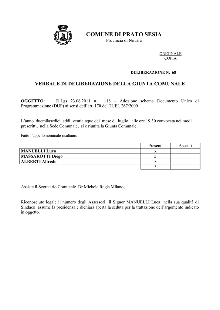 COMUNE DI PRATO SESIA Provincia di Novara ORIGINALE COPIA DELIBERAZIONE N. 68 VERBALE DI DELIBERAZIONE DELLA GIUNTA COMUNALE OGGETTO: . D.Lgs 23.06.2011 n. 118 – Adozione schema Documento Unico di Programmazione (DUP) ai sensi dell’art. 170 del TUEL 267/2000 L’anno duemilasedici addì venticinque del mese di luglio alle ore 19,30 convocata nei modi prescritti, nella Sede Comunale, si è riunita la Giunta Comunale. Fatto l’appello nominale risultano: MANUELLI Luca MASSAROTTI Diego ALBERTI Alfredo Presenti x x x 3 Assenti Assiste il Segretario Comunale Dr.Michele Regis Milano; Riconosciuto legale il numero degli Assessori il Signor MANUELLI Luca nella sua qualità di Sindaco assume la presidenza e dichiara aperta la seduta per la trattazione dell’argomento indicato in oggetto. COMUNE DI PRATO SESIA Oggetto: . D.Lgs 23.06.2011 n. 118 – Adozione schema Documento Unico di Programmazione (DUP) ai sensi dell’art. 170 del TUEL 267/2000 PARERI Il Responsabile del settore interessato Si esprime parere tecnico favorevole ai sensi dell’art. 49 c. 1 e 147 bis del D.Lgs 267/2000. Prato Sesia, 25.07.2016 IL RESPONSABILE DEL SERVIZIO F.to Paola Paesanti ______________________________________________________________________________ Il Responsabile del settore interessato Si esprime parere contabile favorevole ai sensi dell’art. 49 comma 1 e 147 bis del D.Lgs 267/2000. Prato Sesia,25.07.2016 IL RESPONSABILE DEL SERVIZIO F.to Paola Paesanti LA GIUNTA COMUNALE Premesso che: - con il Decreto Legislativo 23 giugno 2011 n. 118, emanato in attuazione degli articoli 1 e 2 della Legge 5 maggio 2009 n. 42, e recante “Disposizioni in materia di armonizzazione dei sistemi contabili e degli schemi di bilancio delle regioni, degli enti locali e dei loro organismi”, è stata approvata la riforma della contabilità degli enti territoriali (regioni, province, comuni ed enti del SSN); - la suddetta riforma è entrata in vigore il 1° gennaio 2015 dopo tre anni di sperimentazione, ed è considerata un tassello fondamentale alla generale operazione di armonizzazione dei sistemi contabili di tutti i livelli di governo, nata dall’esigenza di garantire il monitoraggio ed il controllo degli andamenti della finanza pubblica e consentire la raccordabilità dei sistemi contabili e degli schemi di bilancio con quelli adottati in ambito europeo; - il Decreto Legislativo 10 agosto 2014, n. 126, a completamento del quadro normativo di riferimento, ha modificato ed integrato il D.Lgs. n. 118/2011 recependo gli esiti della sperimentazione ed il D.Lgs. n. 267/2000, al fine di rendere coerente l’ordinamento contabile degli enti locali alle nuove regole della contabilità armonizzata; Richiamato l’art. 151, comma 1, del D.Lgs. n. 267/2000, modificato dal D.Lgs. n. 126/2014, in base al quale “Gli enti locali ispirano la propria gestione al principio della programmazione. A tal fine presentano il Documento Unico di Programmazione entro il 31 luglio di ogni anno e deliberano il bilancio di previsione finanziario entro il 31 dicembre, riferiti ad un orizzonte temporale almeno triennale. Le previsioni del bilancio sono elaborate sulla base delle linee strategiche contenute nel Documento Unico di Programmazione, osservando i princìpi contabili generali ed applicati allegati al Decreto Legislativo 23 giugno 2011, n. 118, e successive modificazioni. I termini possono essere differiti con Decreto del Ministro dell'interno, d'intesa con il Ministro dell'economia e delle finanze, sentita la Conferenza Stato-città ed autonomie locali, in presenza di motivate esigenze”; Richiamato inoltre l’art. 170 del D.Lgs. n. 267/2000, modificato ed integrato dal D.Lgs. n.126/2014, il quale testualmente recita: Articolo 170 Documento Unico di Programmazione 1. Entro il 31 luglio di ciascun anno la Giunta presenta al Consiglio il Documento Unico di Programmazione per le conseguenti deliberazioni. Omissis…….. 2. Il Documento Unico di Programmazione ha carattere generale e costituisce la guida strategica ed operativa dell'ente. 3. Il Documento Unico di Programmazione si compone di due sezioni: la Sezione strategica e la Sezione operativa. La prima ha un orizzonte temporale di riferimento pari a quello del mandato amministrativo, la seconda pari a quello del bilancio di previsione. 4. Il Documento Unico di Programmazione è predisposto nel rispetto di quanto previsto dal principio applicato della programmazione di cui all'allegato n. 4/1 del Decreto Legislativo 23 giugno 2011, n. 118, e successive modificazioni. 5. Il Documento Unico di Programmazione costituisce atto presupposto indispensabile per l'approvazione del bilancio di previsione. 6. Gli enti locali con popolazione fino a 5.000 abitanti predispongono il Documento Unico di Programmazione semplificato previsto dall'allegato n. 4/1 del Decreto Legislativo 23 giugno 2011, n. 118, e successive modificazioni. 7. Nel regolamento di contabilità sono previsti i casi di inammissibilità e di improcedibilità per le deliberazioni del Consiglio e della Giunta che non sono coerenti con le previsioni del Documento Unico di Programmazione. Visto il principio contabile applicato della programmazione all. 4/1 al D.Lgs n. 118/2011, ed in particolare il paragrafo 8; Dato atto che questo ente, avendo una popolazione non superiore a 5.000 abitanti, è tenuto alla predisposizione del DUP semplificato, secondo le indicazioni contenute nel citato principio contabile all. 4/1; Ricordato che il DUP deve individuare, coerentemente con il quadro normativo di riferimento: a) le principali scelte dell’amministrazione; b) gli indirizzi generali di programmazione riferiti all’intero mandato amministrativo, con particolare riferimento per l’organizzazione e le modalità di gestione dei servizi pubblici, tenuto conto anche del ruolo degli enti, organismi e società partecipate; c) le risorse finanziarie e dei relativi impieghi, con specifico riferimento per: - gli investimenti e la realizzazione 