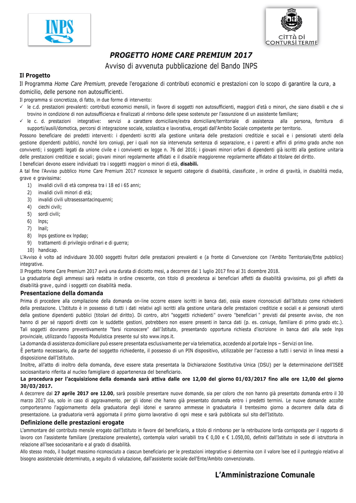 PROGETTO HOME CARE PREMIUM 2017 Avviso di avvenuta pubblicazione del Bando INPS Il Progetto Il Programma Home Care Premium, prevede l'erogazione di contributi economici e prestazioni con lo scopo di garantire la cura, a domicilio, delle persone non autosufficienti. Il programma si concretizza, di fatto, in due forme di intervento: le c.d. prestazioni prevalenti: contributi economici mensili, in favore di soggetti non autosufficienti, maggiori d'età o minori, che siano disabili e che si trovino in condizione di non autosufficienza e finalizzati al rimborso delle spese sostenute per l'assunzione di un assistente familiare; le c. d. prestazioni integrative: servizi a carattere domiciliare/extra domiciliare/territoriale di assistenza alla persona, fornitura di supporti/ausili/domotica, percorsi di integrazione sociale, scolastica e lavorativa, erogati dall'Ambito Sociale competente per territorio. Possono beneficiare dei predetti interventi: i dipendenti iscritti alla gestione unitaria delle prestazioni creditizie e sociali e i pensionati utenti della gestione dipendenti pubblici, nonché loro coniugi, per i quali non sia intervenuta sentenza di separazione, e i parenti e affini di primo grado anche non conviventi; i soggetti legati da unione civile e i conviventi ex legge n. 76 del 2016; i giovani minori orfani di dipendenti già iscritti alla gestione unitaria delle prestazioni creditizie e sociali; giovani minori regolarmente affidati e il disabile maggiorenne regolarmente affidato al titolare del diritto. I beneficiari devono essere individuati tra i soggetti maggiori o minori di età, disabili. A tal fine l'Avviso pubblico Home Care Premium 2017 riconosce le seguenti categorie di disabilità, classificate , in ordine di gravità, in disabilità media, grave e gravissima: 1) invalidi civili di età compresa tra i 18 ed i 65 anni; 2) invalidi civili minori di età; 3) invalidi civili ultrasessantacinquenni; 4) ciechi civili; 5) sordi civili; 6) lnps; 7) lnail; 8) lnps gestione ex lnpdap; 9) trattamenti di privilegio ordinari e di guerra; 10) handicap. L'Avviso è volto ad individuare 30.000 soggetti fruitori delle prestazioni prevalenti e (a fronte di Convenzione con l'Ambito Territoriale/Ente pubblico) integrative. Il Progetto Home Care Premium 2017 avrà una durata di diciotto mesi, a decorrere dal 1 luglio 2017 fino al 31 dicembre 2018. La graduatoria degli ammessi sarà redatta in ordine crescente, con titolo di precedenza ai beneficiari affetti da disabilità gravissima, poi gli affetti da disabilità grave , quindi i soggetti con disabilità media. Presentazione della domanda Prima di procedere alla compilazione della domanda on-line occorre essere iscritti in banca dati, ossia essere riconosciuti dall'Istituto come richiedenti della prestazione. L'Istituto è in possesso di tutti i dati relativi agli iscritti alla gestione unitaria delle prestazioni creditizie e sociali e ai pensionati utenti della gestione dipendenti pubblici (titolari del diritto). Di contro, altri "soggetti richiedenti" ovvero "beneficiari " previsti dal presente avviso, che non hanno di per sé rapporti diretti con le suddette gestioni, potrebbero non essere presenti in banca dati (p. es. coniuge, familiare di primo grado etc.). Tali soggetti dovranno preventivamente "farsi riconoscere" dall'Istituto, presentando opportuna richiesta d'iscrizione in banca dati alla sede lnps provinciale, utilizzando l'apposita Modulistica presente sul sito www.inps.it. La domanda di assistenza domiciliare può essere presentata esclusivamente per via telematica, accedendo al portale lnps - Servizi on line. È pertanto necessario, da parte del soggetto richiedente, il possesso di un PIN dispositivo, utilizzabile per l'accesso a tutti i servizi in linea messi a disposizione dall'Istituto. Inoltre, all'atto di inoltro della domanda, deve essere stata presentata la Dichiarazione Sostitutiva Unica (DSU) per la determinazione dell'ISEE sociosanitario riferita al nucleo famigliare di appartenenza del beneficiario. La procedura per l'acquisizione della domanda sarà attiva dalle ore 12,00 del giorno 01/03/2017 fino alle ore 12,00 del giorno 30/03/2017. A decorrere dal 27 aprile 2017 ore 12.00, sarà possibile presentare nuove domande, sia per coloro che non hanno già presentato domanda entro il 30 marzo 2017 sia, solo in caso di aggravamento, per gli idonei che hanno già presentato domanda entro i predetti termini. Le nuove domande accolte comporteranno l'aggiornamento della graduatoria degli idonei e saranno ammesse in graduatoria il trentesimo giorno a decorrere dalla data di presentazione. La graduatoria verrà aggiornata il primo giorno lavorativo di ogni mese e sarà pubblicata sul sito dell'Istituto. Definizione delle prestazioni erogate L'ammontare del contributo mensile erogato dall'Istituto in favore del beneficiario, a titolo di rimborso per la retribuzione lorda corrisposta per il rapporto di lavoro con l'assistente familiare (prestazione prevalente), contempla valori variabili tra € 0,00 e € 1.050,00, definiti dall'Istituto in sede di istruttoria in relazione all'lsee sociosanitario e al grado di disabilità. Allo stesso modo, il budget massimo riconosciuto a ciascun beneficiario per le prestazioni integrative si determina con il valore lsee ed il punteggio relativo al bisogno assistenziale determinato, a seguito di valutazione, dall'assistente sociale dell'Ente/Ambito convenzionato. L’Amministrazione Comunale