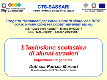 Istituto Comprensivo San Donato 20-21 /02/2017 Patrizia Mercuri - Dirigente Scolastico Istituto Comprensivo San Donato - Sassari Romania 56 Marocco 11 Nigeria 12 Cina 12 Ucraina 1 Pakistan 4 Senegal 15 Belgio 2 Repubblica Domenicana 1 Filippine 1 Bangladesh 2 Serbia 6 Polonia 2 India 1 125 su 731/02/2017 20-21 Breve presentazione delle difficoltà di inserimento degli alunni stranieri nel contesto scolastico in generale Presentazione dei dati specifici della Sardegna Analisi della normativa di settore Analisi delle Linee Guida del febbraio 2014 L’insegnamento dell’italiano come lingua2 Esperienza progettuale Erasmus+ “Europe for Inclusion” Considerazioni finali 20-21 /02/2017 Fonti significative: 1. Rapporto Nazionale del MIUR a.s. 2014/2015 “Alunni con cittadinanza non italiana. La scuola multiculturale nei contesti locali.” 2. Indagine ISTAT “L’integrazione scolastica e sociale delle seconde generazioni” 20-21 /02/2017 Drop-out scolastico, difficoltà di rendimento, alto tasso di ripetenze, difficoltà nelle condizioni generali di vita e nell’inserimento nel mondo del lavoro. Carenza di attività per minori stranieri, in particolare per i neocongiunti, che esprimono il bisogno di imparare la lingua italiana, di socializzare ed essere inseriti in contesti socioeducativi contemporaneamente al loro ingresso a scuola Forte difficoltà della scuola a garantire ai minori stranieri una reale parità di diritti: i Bisogni Educativi Speciali per questa categoria di studenti difficilmente diventano davvero inclusivi. Gli educatori per l’extrascuola scarseggiano e gli insegnanti non sono preparati alla personalizzazione dei piani educativi per questa tipologia di BES 20-21 /02/2017 Inserimento del minore in classe, soprattutto dopo la scuola primaria, non rispettosa dell’età anagrafica Persistenza di esclusione e non visibilità delle famiglie che abitano sul territorio: le madri dovrebbe uscire dall’isolamento, superando quelle pre-condizioni che ne escludono la possibilità di seguire la scolarizzazione dei figli Minore integrazione sociale e persistenza di stereotipi e pregiudizi, connesse al limitato investimento di risorse, spazi e momenti per promuovere l’educazione alla diversità, un appropriato dialogo interculturale, una reciproca conoscenza tra la comunità locale e i cittadini di Paesi terzi 20-21 /02/2017 Ottobre 2015: il numero di alunni stranieri censiti dal MIUR in Sardegna è di 5.144. I dati confermano gli elementi sopra esposti ed evidenziano un contesto di difficoltà nei rendimenti e nell’integrazione, sostanzialmente in linea con le medie nazionali 20-21 /02/2017 Contesto di difficoltà Sardegna Italia I ragazzi stranieri vengono bocciati con percentuali più alte dei loro coetanei italiani* 27,5% 19,5% I ragazzi stranieri non frequentano i coetanei italiani nell’extrascuola* 24,4% 16,5% I ragazzi stranieri abbandonano il percorso scolastico con tassi altissimi rispetto alla media europea 40% 35% * Questi fattori sono aggravati dalla diffusa prassi di inserimento degli alunni stranieri in classi con compagni uno o anche due anni più giovani •I dati sono diversi a seconda delle nazionalità interessate. •I Cinesi, per esempio, sono quelli ad aver il minor tasso di interazione sociale extrascolastica, in quanto sono quelli che soffrono in modo maggiore dell’inserimento in classi non corrispondenti alla loro età anagrafica ( solo il 21,4% frequenta la scuola con pari età) 20-21 /02/2017 Contesto di possibilità Le presenze di ragazzi stranieri sono in percentuale minori rispetto alla penisola Il 39,4% degli alunni stranieri si sentono italiani I processi di integrazione dentro le classi Il 50,9%manifestano il desiderio di rimanere a vivere in Sardegna risultano più semplici I docenti sardi dimostrano un interesse positivo ad integrare gli alunni stranieri nelle classi Richiedono un maggior interessamento delle istituzioni al sostegno dell’integrazione Segnalano le difficoltà legate all’apprendimento della lingua italiana come lingua2 Fanno presente che le difficoltà di comunicazione e lo scarso interesse nei confronti dell’istruzione dei propri figli risultano essere tra le cause di maggior complessità nel rapporto scuole-famiglie 20-21 /02/2017 La Dichiarazione Universale dei Diritti Umani del 1948,, all'art. 2 afferma che: "Ad ogni individuo spettano tutti i diritti e tutte le libertà enunciate nella presente Dichiarazione, senza distinzione alcuna per ragioni di razza, di colore, di sesso, di lingua, di opinione politica o di altro genere, di origine nazionale o sociale, di ricchezza, di nascita o di altra condizione"; Principi confermati dalla Convenzione sui diritti dell'infanzia del 1989, ratificata dall'Italia nel 1991. Si tratta di Dichiarazioni che l'Italia ha fatto proprie, le quali valgono sul nostro territorio e costituiscono un punto fermo per le politiche e gli interventi che sono rivolti o che coinvolgono bambini, ragazzi, adolescenti provenienti da tutto il mondo che vivono da noi. 20-21 /02/2017 Costituzione Italiana articolo 3 e articolo 34 La tutela del diritto di accesso a scuola del minore straniero trova la sua fonte normativa nella legge sull'immigrazione n. 40 del 6 marzo 1998 e nel decreto legislativo n. 286 del 25 luglio 1998 "Testo unico delle disposizioni concernenti la disciplina dell'immigrazione e norme sulla condizione dello straniero" che riunisce e coordina gli interventi in favore dell'accoglienza e integrazione degli immigrati, ponendo particolare attenzione all'integrazione scolastica DPR 394/99 art. 45: Regolamento recante norme di attuazione del testo unico delle disposizioni concernenti la disciplina dell’immigrazione e norme sulla condizione dello straniero. La legge n. 189 del 30 luglio 2002 ha confermato le procedure di accoglienza degli alunni stranieri a scuola. 20-21 /02/2017 Il quadro normativo, imperniato sull'autonomia delle istituzioni scolastiche, regolata dal DPR n. 275/99