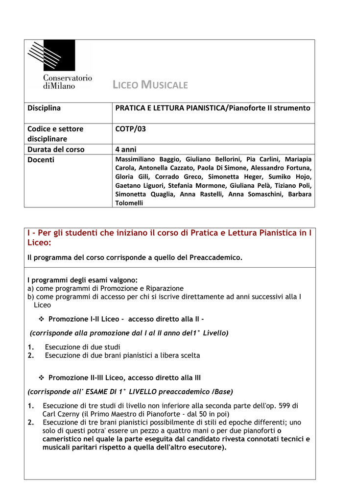 LICEO MUSICALE Disciplina Codice e settore disciplinare Durata del corso Docenti PRATICA E LETTURA PIANISTICA/Pianoforte II strumento COTP/03 4 anni Massimiliano Baggio, Giuliano Bellorini, Pia Carlini, Mariapia Carola, Antonella Cazzato, Paola Di Simone, Alessandro Fortuna, Gloria Gili, Corrado Greco, Simonetta Heger, Sumiko Hojo, Gaetano Liguori, Stefania Mormone, Giuliana Pelà, Tiziano Poli, Simonetta Quaglia, Anna Rastelli, Anna Somaschini, Barbara Tolomelli I - Per gli studenti che iniziano il corso di Pratica e Lettura Pianistica in I Liceo: Il programma del corso corrisponde a quello del Preaccademico. I programmi degli esami valgono: a) come programmi di Promozione e Riparazione b) come programmi di accesso per chi si iscrive direttamente ad anni successivi alla I Liceo Promozione I-II Liceo - accesso diretto alla II (corrisponde alla promozione dal I al II anno del1° Livello) 1. 2. Esecuzione di due studi Esecuzione di due brani pianistici a libera scelta Promozione II-III Liceo, accesso diretto alla III (corrisponde all' ESAME DI 1° LIVELLO preaccademico /Base) 1. 2. Esecuzione di tre studi di livello non inferiore alla seconda parte dell'op. 599 di Carl Czerny (il Primo Maestro di Pianoforte - dal 50 in poi) Esecuzione di tre brani pianistici possibilmente di stili ed epoche differenti; uno solo di questi potra' essere un pezzo a quattro mani o per due pianoforti o cameristico nel quale la parte eseguita dal candidato rivesta connotati tecnici e musicali paritari rispetto a quella dell'altro esecutore). Promozione III-IV Liceo, accesso diretto alla IV (corrisponde all' ESAME DI 2° LIVELLO preaccademico/Intermedio) 1. 2. 3. 4. Esecuzione di tre studi presentati dal candidato di livello tecnico NON inferiore all’opera 849 (Trenta studi di meccanismo) di Carl Czerny. Esecuzione di una Sonata in un solo movimento (dal barocco al contemporaneo) Esecuzione di un brano pianistico classico romantico o moderno, solistico o per pianoforte a quattro mani o per due pianoforti o cameristico nel qualela parte eseguita dal candidato rivesta connotati tecnici e musicali paritari rispetto a quella dell'altro esecutore). Esecuzione di un brano di J.S.Bach. VERIFICA DI IV LICEO (corrisponde all' ESAME DI TERZO LIVELLO preaccademico/ Avanzato) 1. 2. 3. 4. Esecuzione di una composizione di J.S.Bach di difficoltà NON inferiore alle “Invenzioni a due voci”; Esecuzione della parte pianistica di un brano cameristico (con esclusione della letteratura per duo pianistico) Una Sonatina o Sonata completa (consistente di almeno due tempi). Sono escluse le sonatine op. 36 n.1 di Clementi e in Sol Maggiore di Beethoven. Esecuzione di uno o più brani a scelta di durata complessiva minima di 5 e massima di 15 minuti. Puo' essere prevista in questa prova l’esecuzione di un brano a 4 mani o per due pianoforti o cameristico nel quale la parte eseguita dal candidato rivesta connotati tecnici e musicali paritari rispetto a quella dell'altro esecutore). VERIFICA FINALE B (solo per chi NON ha superato l' esame di promozione III-IV) 1. Esecuzione di una composizione di J.S.Bach di difficoltà NON inferiore alle “Invenzioni a due voci”; 2. Programma della durata NON inferiore a 20 minuti che dovra’ comprendere anche l'esecuzione di: • tre studi presentati dal candidato di livello tecnico NON inferiore all’opera 849 (Trenta studi di meccanismo) di Carl Czerny • una Sonatina o Sonata completa (consistente di almeno due tempi). Sono escluse le sonatine op. 36 n.1 di Clementi e in Sol Maggiore di Beethoven. • Puo' essere inoltre prevista l’esecuzione di un brano a 4 mani o per due pianoforti e di Brani pianistici o accompagnamenti pianistici fino a raggiungere il minutaggio prescritto II-per gli studenti che hanno iniziato il corso di Pratica e Lettura Pianistica PRIMA del LICEO Gli studenti che hanno conseguito o conseguono la Certificazione finale del P.A. entro la II Liceo possono scegliere: 1. di studiare un altro strumento, previa disponibilità di posti nelle classi. Alla fine della IV sosterranno un esame di Verifica nello strumento scelto, ma dovranno comunque frequentare Tecniche di Accompagnamento pianistico nel Triennio. 2. Di continuare lo studio del Pianoforte fino alla IV con solo voto di scrutinio fino alla Verifica di IV Liceo, con il seguente programma: • Esecuzione di una composizione di J.S.Bach di difficoltà NON inferiore alle “Invenzioni a due voci”; • Esecuzione della parte pianistica di un brano cameristico strumentale o vocale (con esclusione della letteratura per duo pianistico). • Programma, a libera scelta, della durata NON inferiore a 20 minuti che potra’ comprendere anche l’esecuzione di uno o più brani a 4 mani o per due pianoforti o cameristico nel quale la parte eseguita dal candidato rivesta connotati tecnici e musicali paritari rispetto a quella dell'altro esecutore). III -‐ Chi si iscrivera' al Triennio prima della Maturita' seguira' contestualmente il corso obbligatorio di Tecniche Fondamentali di Accompagnamento pianistico previsto per il Triennio, ampliando pertanto conformemente il programma del punto 2 della Verifica, oppure sostenendo l'esame prima della Verifica stessa. • Per chi ha 5 di scrutinio a giugno in IV Liceo: I programmi di riparazione corrispondono a metà dell'esame di verifica: 1- Studenti gia’ in possesso di Licenza o terzo livello: programma a scelta di 10 minuti piu’ Bach o accompagnamento 2- Non in possesso di Licenza o terzo livello: Due studi, un tempo di Sonatina e a scelta un brano pianistico o un accompagnamento. L’esame di Verifica puo’ essere sostenuto integralmente a settembre al posto dell’esame di riparazione. In questo caso, il candidato eseguira’ prima la parte di esame corrispondente al programma di riparazione; se questa parte sara’ valutata sufficiente dalla commissione si procedera’ al resto dell’esame. Se anche la parte finale sara’ sufficiente l’allievo conseguira’ la Verific