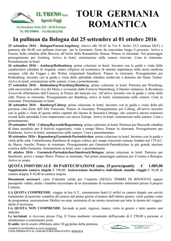 TOUR GERMANIA ROMANTICA In pullman da Bologna dal 25 settembre al 01 ottobre 2016 25 settembre 2016 - Bologna/Fussen/Augsburg: ritrovo alle 05.45 in Via S. Serlio 25/2 (entrata DLF) e partenza alle 06.00 con pullman riservato per la Germania. Soste da concordare lungo il percorso. Arrivo a Fussen, bella cittadina della Baviera, all’inizio della Romantiche Strasse. Pranzo in ristorante. Nel pomeriggio proseguimento per Ausburg. Arrivo in hotel, sistemazione nelle camere riservate. Cena in ristorante. Pernottamento in hotel. 26 settembre 2016 - Ausburg/Rothenburg: prima colazione in hotel. Incontro con la guida e visita della caratteristica cittadina di Augusta, centro religioso ed economico di enorme importanza nella storia moderna europea, città dei Fugger e dei Welser (importanti banchieri). Pranzo in ristorante. Proseguimento per Rothenburg, incontro con la guida e visita della splendida cittadina medievale a dominio del fiume Tauber. Arrivo in hotel, sistemazione nelle camere. Cena e pernottamento. 27 settembre 2016 - Rothenburg/Wurzburg/Bamberg: prima colazione in hotel. Partenza per Wurzburg, città universitaria sulle rive del Meno e sovrastata dalla Fortezza Marienberg, il Duomo romanico, la Residenza Vescovile (Patrimonio dell’Unesco), la Piazza del mercato ecc. All’arrivo incontro con la guida e visita della città. Pranzo in ristorante. Proseguimento per Bamberg, arrivo in hotel, sistemazione nelle camere. Cena in ristorante. Pernottamento in hotel. 28 settembre 2016 - Bamberg/Coburg: prima colazione in hotel. Incontro con la guida e visita della più preziosa città d'arte dell’Alta Franconia. Pranzo in ristorante. Proseguimento per Coburg, all’arrivo incontro con la guida e visita di questa antica capitale del ducato di Sassonia-Coburgo, che conserva ancora numerosi ricordi della splendida Corte imparentata con mezza Europa. Arrivo in hotel, sistemazione nelle camere. Cena e pernottamento. 29 settembre 2016 - Coburg/Bayreuth/Regensburg: prima colazione in hotel. Partenza per Bayreuth cittadina di fama mondiale per il festival wagneriano, visita e tempo libero. Pranzo in ristorante. Proseguimento per Ratisbona. Arrivo in hotel, sistemazione nelle camere. Cena e pernottamento. 30 settembre 2016 - Regensburg/Garmisch-Partenkirchen: prima colazione in hotel. Incontro con la guida e visita della città, l’antichissima Ratisbona di origine celtica, poi campo trincerato romano fondato nel 179 d.C. da Marco Aurelio. Pranzo in ristorante. Proseguimento per Garmisch-Partenkirchen la più grande stazione sciistica della Germania. Sistemazione in hotel, cena e pernottamento. 01 ottobre 2016 - Garmisch-Partenkirchen/Innsbruck/Bologna: prima colazione in hotel. Partenza per Innsbruck, arrivo e tempo libero. Pranzo in ristorante. Nel primo pomeriggio partenza per il rientro a Bologna. Arrivo in serata. QUOTA INDIVIDUALE DI PARTECIPAZIONE (min. 25 partecipanti): € 1.085,00 Supplemento camera singola € 198,00. Assicurazione facoltativa individuale annullo viaggio € 36,00 in camera doppia; € 42,00 in camera singola. Documenti necessari: carta d’identità valida per l’espatrio (SENZA TIMBRI DI RINNOVO) oppure passaporto valido; anche i bambini necessitano di un documento di riconoscimento informarsi presso il proprio Comune. LA QUOTA COMPRENDE: viaggio in bus G.T., sistemazione hotel (3 stelle) in camere doppie con servizi trattamento di pensione completa dal pranzo del primo giorno al pranzo dell’ultimo giorno, visite guidate come da programma, assicurazione Medico no-stop, assistenza di un nostro incaricato per tutta la durata del viaggio, diritti d’iscrizione. LA QUOTA NON COMPRENDE: bevande ai pasti, ingressi, mance, extra in genere e tutto quanto non indicato. Le iscrizioni: si ricevono presso l'Ag. Il Treno mediante versamento dell'acconto di € 250,00 a persona; si chiuderanno a esaurimento posti. Il saldo: dovrà essere effettuato entro 30 gg prima della partenza. STAMPATO IN PROPRIO IN DATA 27/05/2016 COPIA PRESENTATA AL COMUNE DI BOLOGNA IN DATA 06/06/2016