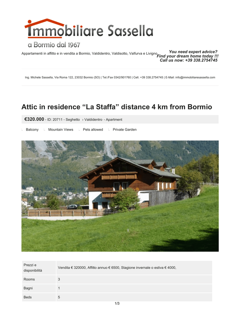 You need expert advice? Find your dream home today !!! Call us now: +39 338.2754745 Appartamenti in affitto e in vendita a Bormio, Valdidentro, Valdisotto, Valfurva e Livigno Ing. Michele Sassella, Via Roma 122, 23032 Bormio (SO) | Tel./Fax 0342/901760 | Cell. +39 338.2754745 | E-Mail: [email protected] Attic in residence “La Staffa” distance 4 km from Bormio €320.000 - ID: 20711 - Seghetto Balcony Prezzi e disponibilità Mountain Views › Valdidentro - Apartment Pets allowed Private Garden Vendita € 320000, Affitto annuo € 6500, Stagione invernale o estiva € 4000, Rooms 3 Bagni 1 Beds 5 1/3 Surface area 83 m² In Valdidentro, 5 km from Bormio on the road to go to the Motte of Oga in a cottage in the countryside, with beautiful views of the mountains of Valdidentro, for rentanche and for apartment wood , on the floor in the attic, consisting of Notes Disponibilità persale, affittifurnished settimanali, Natale, in Capodanno, solo2nd a famiglie large living room with sofa bed, with output of large west-facing balcony with a beautiful view over the Valdidentro. Kitchen L'indirizzo esatto dell'immobile Viashower della Corva, e si trova percorrendo statale with dishwasher, a double bedroom, a single bedroom,èaValdidentro, bathroom with and window. Parking outsidelathe apartment PropertyCommon address garden. che va verso Isolaccia, svoltando direzione Oga, a 400ismetri deviazione, sulla matched. Available separately, garage poi andincellar. The apartment idealdalla for those who want to feel sinistra.ofPurtroppo earth nontime riconosce l'indirizzo. comfortable and in the middle the greenGoogle and at the same a 3-minute drive from Bormio or Isolaccia. The apartment is beautiful with all the beams of the roof exposed wood with a beautiful view of the surrounding mountains. To get to the house there is a stretch of uphill climb of about 150 meters. 2/3 Property Location Property URL http://www.immobiliaresassella.com/en/property/attic-in-residence-la-staffa-distance-4-km-from-bormio/ 3/3