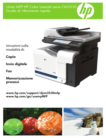 Unità MFP HP Color LaserJet serie CM3530 Guida di riferimento rapido Istruzioni sulla modalità di: Copia Invio digitale Fax Memorizzazione processi www.hp.com/support/cljcm3530mfp www.hp.com/go/usemyMFP Riepilogo di riferimento rapido Pagina Istruzioni per Procedura da eseguire 1 Effettuare copie in bianco e nero o a colori Toccare Copia. Toccare Colore/Nero. Per effettuare copie in bianco e nero, toccare Nero. Per effettuare copie a colori, toccare Colore. Toccare OK. Premere Avvia. 2 Effettuare copie fronte/retro Toccare Copia. Se il documento originale è stampato su un lato, toccare Originale 1 facciata, output 2 facciate. Oppure, se il documento originale è stampato su entrambi i lati, toccare Originale 2 facciate, output 2 facciate. Toccare OK. Premere Avvia. 3 Copiare foto o immagini stampate Toccare Copia. Toccare Formato originale. Toccare Altre opzioni. Toccare Ottimizza testo/foto. Toccare Foto stampata o Fotografia. Toccare OK. Premere Avvia. 4 Realizzare un opuscolo Toccare Copia. Toccare Altre opzioni. Toccare Formato opuscolo. Toccare Opuscolo attivato. Se l'originale è stampato su un lato, toccare 1 facc. Se è stampato su entrambi i lati, toccare 2 facc. Toccare OK. Premere Avvia. 5 Inviare tramite e-mail Toccare E-mail. Completare i campi Da:, A: e Oggetto:. Premere Avvia. 6 Effettuare una scansione su una cartella di rete Toccare Cartella di rete. Selezionare la cartella nella quale salvare il documento. In alternativa, toccare Percorso cartella di rete per aprire la tastiera e digitare il percorso della cartella. Toccare Nome file per aprire la tastiera e digitare il nome del file. Premere Avvia. 7 Inviare un fax Toccare Fax. Toccare Destinatari fax. Inserire un numero di fax. Toccare OK. Toccare la freccia verde verso il basso per aggiungere il numero all'elenco dei destinatari del fax. Ripetere per aggiungere ulteriori numeri. Premere Avvia. 8 Memorizzare un processo di copia Toccare Memorizzazione processo. Toccare Crea. Toccare Nuovo processo. Digitare un nome cartella. Toccare la freccia verso il basso e digitare un nome processo. Toccare OK. Opzionale: per rendere un processo privato, toccare PIN per la stampa, quindi digitare il PIN per il processo. Toccare OK. Premere Avvia. Recupero di un processo memorizzato Toccare Memorizzazione processo. Selezionare la cartella in cui viene memorizzato il processo. Selezionare il processo dell'elenco. Se il processo è privato, toccare la casella sotto PIN: e digitare il PIN corretto. Premere Avvia. 10 www.hp.com Effettuare copie in bianco e nero o a colori Punto 1 Punto 4 Posizionare l'originale nell'alimentatore documenti con il lato di stampa rivolto verso l'alto o sul vetro rivolto verso il basso. Per effettuare copie in bianco e nero, toccare Nero. Per effettuare copie a colori, toccare Colore. Toccare OK. hp Punto 2 Punto 5 Utilizzare il tastierino numerico per modificare il numero di copie. Toccare Copia. Premere Avvia. Punto 3 Toccare Colore/Nero. www.hp.com 1 Effettuare copie fronte/retro Punto 1 Punto 4 Posizionare l'originale nell'alimentatore documenti con il lato di stampa rivolto verso l'alto o sul vetro rivolto verso il basso. Se l'originale è stampato su un lato, toccare Originale 1 facciata, output 2 facciate. Se l'originale è stampato su entrambi i lati, toccare Originale 2 facciate, output 2 facciate. Toccare OK. hp Punto 2 Punto 5 Utilizzare il tastierino numerico per modificare il numero di copie. Toccare Copia. Premere Avvia. Punto 3 Toccare Lati. 2 www.hp.com Copiare foto o immagini stampate Punto 1 Punto 4 Posizionare l'originale nell'alimentatore documenti con il lato di stampa rivolto verso l'alto o sul vetro rivolto verso il basso. Toccare Ottimizza testo/foto. Punto 2 Punto 5 Utilizzare il tastierino numerico per modificare il numero di copie. Toccare Copia. Toccare Foto stampata o Fotografia. hp Punto 3 Punto 6 Toccare Altre opzioni. Premere Avvia. www.hp.com 3 Realizzare un opuscolo Punto 1 Punto 4 Posizionare l'originale nell'alimentatore documenti con il lato di stampa rivolto verso l'alto o sul vetro rivolto verso il basso. Toccare Formato opuscolo. Punto 2 Punto 5 Utilizzare il tastierino numerico per modificare il numero di copie. Toccare Copia. Toccare Opuscolo attivato. Se l'originale è stampato su un lato, toccare 1 facc. Se è stampato su entrambi i lati, toccare 2 facc. Toccare OK. hp 4 Punto 3 Punto 6 Toccare Altre opzioni. Premere Avvia. www.hp.com Inviare tramite e-mail Punto 1 Punto 4 Posizionare l'originale nell'alimentatore documenti con il lato di stampa rivolto verso l'alto o sul vetro rivolto verso il basso. Digitare l'indirizzo e-mail desiderato. Toccare la freccia verso il basso accanto a A. Toccare Oggetto e digitare il testo. Toccare OK. hp Punto 2 Punto 5 Toccare E-mail. Se richiesto, digitare nome utente e password. Premere Avvia. Punto 3 Toccare il campo Da e digitare l'indirizzo email. Toccare il campo A. www.hp.com 5 Effettuare una scansione su una cartella di rete Punto 1 Punto 4 Posizionare l'originale nell'alimentatore documenti con il lato di stampa rivolto verso l'alto o sul vetro rivolto verso il basso. Toccare Nome file per aprire la tastiera e digitare il nome del file. Toccare OK. hp Punto 2 Punto 5 Toccare Cartella di rete. Premere Avvia. Punto 3 Selezionare la cartella nella quale salvare il documento. In alternativa, toccare Percorso cartella di rete per aprire la tastiera e digitare il percorso della cartella. Toccare OK. 6 www.hp.com Inviare un fax Punto 1 Punto 4 Posizionare l'originale nell'alimentatore documenti con il lato di stampa rivolto verso l'alto o sul vetro rivolto verso il basso. Toccare la freccia verde verso il basso per aggiungere il numero all'elenco dei destinatari del fax. Ripetere per aggiungere ulteriori numeri. Punto 2 Punto 5 Toccare Fax. Se richiesto, digitare nome utente e password. Toccare Altre opzioni. Verificare che le impostazioni corrispondano a quelle dell'originale. hp Punto 3 Punto 6 Toccare Destinatari fax. In