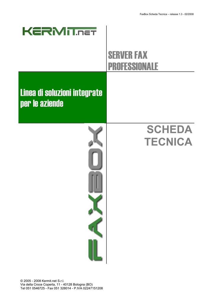 FaxBox Scheda Tecnica – release 1.3 - 02/2008 SERVER FAX PROFESSIONALE Linea di soluzioni integrate per le aziende SCHEDA TECNICA © 2005 - 2008 Kermit.net S.r.l. Via della Croce Coperta, 11 - 40128 Bologna (BO) Tel 051 0546725 - Fax 051 328014 - P.IVA 02247151208 FaxBox Scheda Tecnica – release 1.3 - 02/2008 Supporto di Fax over IP (FOIP) FaxBox offre la funzionalità Fax over IP (FOIP), che consente di inviare fax tramite apparati fax manuali tradizionali affiancando all’apparato stesso un convertitore fax analogico/FoIP. L’uso del fax manuale tradizionale rimane del tutto invariato, ma in questo modo si ottiene immediatamente l’archiviazione e la storicizzazione di tutti i fax inviati e ricevuti con l’apparato fax manuale tradizionale. Nel caso l’azienda possieda sedi decentrate, con tale soluzione diviene semplicissimo ed a costo zero centralizzare le linee telefoniche di invio/ricezione dei fax pur disponendo/distribuendo apparati di invio manuale tradizionale nelle varie sedi senza acquisire linee telefoniche aggiuntive nelle sedi stesse. Smistamento automatico dei fax recapitati o ricevuti FaxBox è in grado di smistare i fax in arrivo in modo automatico nella casella di posta dell'utente o verso una stampante specifica, in base a un numero DID/DDI/DTMF o alla linea che ha ricevuto il fax. In ogni caso, tutti i fax vengono comunque archiviati su disco fisso e resi visibili tramite il portale web. Supporto clustering (backup) Grazie alla sua infrastruttura flessibile, FaxBox può essere affiancato, con costi decisamente ridotti, con un server di backup. In caso di crash del server principale, il server di backup, continuamente allineato, subentrerà garantendo che nessun dato sia perduto. Server fax multi linee scalabile FaxBox è un server fax solido ed affidabile, capace di scalare fino a 240 linee telefoniche per singolo server fax, il tutto avvalendosi di schede ISDN attive; per installazioni di dimensioni ridotte è comunque possibile avvalersi anche di semplici modem analogici. L’uso di schede ISDN attive, estremamente economiche, consente di ottenere trasmissioni fax e smistamento di fax in entrata multi linee. Ricezione dei fax nel client di posta elettronica (es. Microsoft ® Outlook) in formato fax o PDF FaxBox smista i fax nella cartella di “Posta in arrivo” dell'utente in formato PDF. Questo consente agli utenti di essere tempestivamente informati dell’avvenuta ricezione di un fax a loro indirizzato attraverso l’uso di un normale client di posta elettronica (es. Outlook) o un client di posta elettronica basato sul web (es. Outlook Web Access). La ricezione dei fax in formato PDF ne consente un eventuale semplice inoltro e permette una facile integrazione con i sistemi di archiviazione dei documenti e/o con i software/procedure di workflow. © 2005 - 2008 Kermit.net S.r.l. Via della Croce Coperta, 11 - 40128 Bologna (BO) Tel 051 0546725 - Fax 051 328014 - P.IVA 02247151208 FaxBox Scheda Tecnica – release 1.3 - 02/2008 Invio di fax da qualsiasi applicazione e possibilità di allegare documenti Al fine di inviare un fax, l’utente stampa il documento desiderato sulla stampante di rete FaxBox oppure, solo però utilizzando il portale web, può allegare documenti diversi ad un singolo fax. L’utente può allegare documenti in formato Microsoft ® Office, PDF, HTML ed altri: tali allegati sono convertiti in formato fax sul FaxBox. La conferma dell’avvenuta trasmissione (o l’eventuale notifica di errore) sarà visibile sul portale web o potrà essere inoltrata direttamente via posta elettronica. Integrazione LDAP / Active Directory (versione enterprise) Gli utenti e i gruppi di FaxBox possono essere sincronizzati automaticamente con un server LDAP o Active Directory. Con l’adozione di questo modulo si elimina completamente la gestione interna degli utenti e gruppi centralizzando il tutto su un server LDAP o Active Directory. Supporto Citrix I client di FaxBox (web o stampante di rete) possono tranquillamente funzionare all’interno di un server terminale Citrix o similari. Supporto OCR (versione enterprise) E’ possibile associare un opportuno codice a barre prefiancato su tutti i fax in modo da gestire la corrispondenza fax – utente/fornitore/cliente/…. in modo del tutto automatico. © 2005 - 2008 Kermit.net S.r.l. Via della Croce Coperta, 11 - 40128 Bologna (BO) Tel 051 0546725 - Fax 051 328014 - P.IVA 02247151208 FaxBox Scheda Tecnica – release 1.3 - 02/2008 Alcuni screenshot del portale web di FaxBox © 2005 - 2008 Kermit.net S.r.l. Via della Croce Coperta, 11 - 40128 Bologna (BO) Tel 051 0546725 - Fax 051 328014 - P.IVA 02247151208 FaxBox Scheda Tecnica – release 1.3 - 02/2008 © 2005 - 2008 Kermit.net S.r.l. Via della Croce Coperta, 11 - 40128 Bologna (BO) Tel 051 0546725 - Fax 051 328014 - P.IVA 02247151208 FaxBox Scheda Tecnica – release 1.3 - 02/2008 © 2005 - 2008 Kermit.net S.r.l. Via della Croce Coperta, 11 - 40128 Bologna (BO) Tel 051 0546725 - Fax 051 328014 - P.IVA 02247151208 FaxBox Scheda Tecnica – release 1.3 - 02/2008 © 2005 - 2008 Kermit.net S.r.l. Via della Croce Coperta, 11 - 40128 Bologna (BO) Tel 051 0546725 - Fax 051 328014 - P.IVA 02247151208