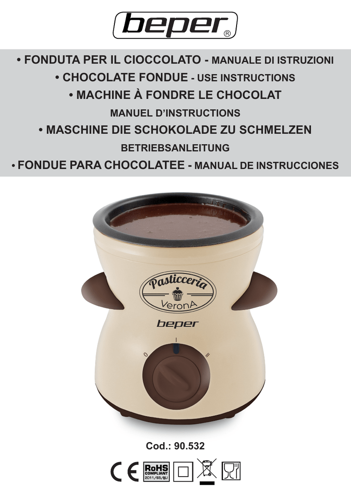 R • FONDUTA PER IL CIOCCOLATO - MANUALE DI ISTRUZIONI • CHOCOLATE FONDUE - USE INSTRUCTIONS • MACHINE À FONDRE LE CHOCOLAT MANUEL D’INSTRUCTIONS • MASCHINE DIE SCHOKOLADE ZU SCHMELZEN BETRIEBSANLEITUNG • FONDUE PARA CHOCOLATEE - MANUAL DE INSTRUCCIONES Cod.: 90.532 ITALIANO pag. 3 ENGLISH pag. 8 FRANÇAIS pag. 13 DEUTSCH pag. 18 ESPAÑOL pag. 24 For further information and/or for instructions for use in other languages, please visit: www.beper.com Fig. 1 Fig. 2 Fonduta per il cioccolato Manuale di istruzioni Gentile Cliente, Vi preghiamo di leggere attentamente le istruzioni d’uso, prima di utilizzare l’apparecchio. Collegamento alla rete Collegate l’apparecchio solo a prese di corrente perfettamente installate con messa a terra. Assicuratevi che la tensione d’alimentazione corrisponda alla tensione indicata sulla targhetta porta dati dell’apparecchio. Questo prodotto è conforme alle direttive vincolanti per l’etichettatura CE. Sicurezza d’utilizzo ● La piastra e il pentolino diventano molto caldi durante l’uso! ● Non introducete le mani nel pentolino caldo. ● Questo apparecchio non è previsto per l’utilizzo da parte di persone (bambini compresi) con ridotte capacità fisiche, sensoriali o mentali, o con scarsa esperienza o conoscenza, a meno che non siano adeguatamente sorvegliate o istruite sull’uso dell’apparecchio dalla persona responsabile della loro sicurezza. ● È necessario sorvegliare che i bambini non giochino con l’apparecchio. ● Accendete l’apparecchio solo dopo aver sistemato il pentolino riempito sulla piastra. Utilizzate solo il pentolino fornito in dotazione con l’apparecchio. Non lasciate incustodito l’apparecchio per la fonduta quando è in funzione. ● Non mettete in funzione il servizio da fonduta se rinvenite segni di danneggiamento sull’apparecchio o sul cavo di alimentazione. ● Il grasso già usato può prendere fuoco se viene surriscaldato. Nell’eventualità prenda fuoco, disinserite la spina dalla presa di corrente e spegnete le fiamme chiudendo il pentolino con il coperchio o con una lastra metallica. Non gettate mai acqua sul grasso caldo o in fiamme! ● Non trasportate mai l’apparecchio quando è caldo. Gli schizzi del grasso caldo potrebbero provocare ferite gravi o scottature. ● Utilizzate il pentolino da fonduta solo con l’apparecchio base fornito, perché la piastra è dotata di un dispositivo di controllo della temperatura. ● Sistemate il servizio da fonduta su una superficie adeguata termoresistente. ● Assicuratevi che non ci siano materiali infiammabili vicino al servizio da fonduta. ● Evitate che il cavo di alimentazione tocchi gli elementi caldi dell’apparecchio e sistemate l’apparecchio in modo che non possa cadere accidentalmente. ● Prima di ogni utilizzo, controllate attentamente che l’apparecchio non presenti tracce di deterioramento. Non usate l’apparecchio nel caso in cui lo stesso abbia incidentalmente subito colpi: danni anche invisibili ad occhio nudo potrebbero comportare conseguenze negative sulla sicurezza nel funzionamento dell’apparecchio. ● Disinserite la spina dalla presa di corrente: - dopo ogni uso, - in caso di cattivo funzionamento, - prima di procedere alla pulitura. ● L’apparecchio non è previsto per l’utilizzo con un timer esterno o con un sistema separato di comando a distanza. ● Nessuna responsabilità verrà assunta in caso di danni risultanti da un uso errato o dalla non conformità alle istruzioni. ● Questo apparecchio è destinato ad uso esclusivamente domestico e non è inteso per uso professionale. ● In conformità alle norme di sicurezza e per evitare ogni pericolo, tutte le riparazioni di un apparecchio elettrico - compresa la sostituzione del cavo di alimentazione – devono essere effettuate da 3 Fonduta per il cioccolato Manuale di istruzioni personale specializzato. Nel caso in cui l’apparecchio richieda una riparazione, rinviatelo ad uno dei nostri Centri Assistenza Clienti i cui indirizzi si trovano in appendice al presente manuale. Descrizione prodotto (figura 1) La fonduta di cioccolato è destinata solo per uso domestico, non per uso professionale. 1. Interruttore 2. Spia di funzionamento 3. Base contenente elemento riscaldante 4. Contenitore 5 Spatola 6. Spiedini (10x) 7. Forchette (10x) Primo utilizzo Pulite il pentolino con un panno umido. In seguito asciugatelo accuratamente. Funzionamento – Primo utilizzo 1 . Rimuovere l’imballaggio . 2 . Pulire accuratamente il dispositivo con un panno caldo e umido per rimuovere eventuali residui di lavorazione ( vedi “ Pulizia e manutenzione “ ) . Funzionamento - Uso della fonduta È possibile utilizzare la fonduta di cioccolato per immergere piccoli alimenti nel cioccolato fuso per fare un divertente dessert. È possibile utilizzare gli accessori forniti per questo. L’apparecchio è ideale anche per fondere il cioccolato e successivamente decorare cupcakes, cake pops , ciambelle, torte , ecc , o per una deliziosa salsa calda al cioccolato con i vostri dolci . Funzionamento - Il cioccolato da utilizzare È possibile utilizzare vari tipi e gusti di cioccolato con questa fonduta di cioccolato : - Cioccolato liquido (pronto per l’uso) ; - Gocce di cioccolato ( da sciogliere ) ; - Barrette di cioccolato ( rompere in pezzi e da sciogliere) . Funzionamento - Cioccolato fondente (Figura 2) Posizione 0 : Off Posizione I : sciogliere Posizione II : tenere al caldo 1 . Posizionare l’apparecchio su una superficie piana e riempire il recipiente (4 ) con la quantità desiderata di cioccolato. 2 . Impostare l’interruttore ( 1) in posizione ‘I’ ( vedi figura 2) . La spia ( 2) ora si accende . 3 . Lasciare il cioccolato a fondere e utilizzare la spatola ( 5) per mescolare fino a che il composto diventa omogeneo . Quando si desidera mantenere il cioccolato liquido dopo che è stato fuso impostare l’interruttore in posizione ‘ II’, dopo che il cioccolato è s
