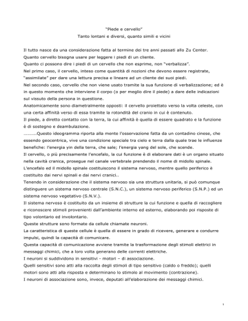 “Piede e cervello” Tanto lontani e diversi, quanto simili e vicini Il tutto nasce da una considerazione fatta al termine dei tre anni passati allo Zu Center. Quanto cervello bisogna usare per leggere i piedi di un cliente. Quanto ci possono dire i piedi di un cervello che non esprime, non “verbalizza”. Nel primo caso, il cervello, inteso come quantità di nozioni che devono essere registrate, “assimilate” per dare una lettura precisa e lineare ad un cliente dei suoi piedi. Nel secondo caso, cervello che non viene usato tramite la sua funzione di verbalizzazione; ed è in questo momento che interviene il corpo (o per meglio dire il piede) a dare delle indicazioni sul vissuto della persona in questione. Anatomicamente sono diametralmente opposti: il cervello proiettato verso la volta celeste, con una certa affinità verso di essa tramite la rotondità del cranio in cui è contenuto. Il piede, a diretto contatto con la terra, la cui affinità è quella di essere quadrato e la funzione è di sostegno e deambulazione. ………..Questo ideogramma riporta alla mente l’osservazione fatta da un contadino cinese, che essendo geocentrica, vive una condizione speciale tra cielo e terra dalla quale trae le influenze benefiche: l’energia yin della terra, che sale; l’energia yang del sole, che scende. Il cervello, o più precisamente l’encefalo, la cui funzione è di elaborare dati è un organo situato nella cavità cranica, prosegue nel canale vertebrale prendendo il nome di midollo spinale. L’encefalo ed il midollo spinale costituiscono il sistema nervoso, mentre quello periferico è costituito dai nervi spinali e dai nervi cranici.. Tenendo in considerazione che il sistema nervoso sia una struttura unitaria, si può comunque distinguere un sistema nervoso centrale (S.N.C.), un sistema nervoso periferico (S.N.P.) ed un sistema nervoso vegetativo (S.N.V.). Il sistema nervoso è costituito da un insieme di strutture la cui funzione e quella di raccogliere e riconoscere stimoli provenienti dall’ambiente interno ed esterno, elaborando poi risposte di tipo volontario ed involontario. Queste strutture sono formate da cellule chiamate neuroni. La caratteristica di queste cellule è quella di essere in grado di ricevere, generare e condurre impulsi, quindi la capacità di comunicare. Questa capacità di comunicazione avviene tramite la trasformazione degli stimoli elettrici in messaggi chimici, che a loro volta generano delle correnti elettriche. I neuroni si suddividono in sensitivi - motori – di associazione. Quelli sensitivi sono atti alla raccolta degli stimoli di tipo sensitivo (caldo o freddo); quelli motori sono atti alla risposta e determinano lo stimolo al movimento (contrazione). I neuroni di associazione sono, invece, deputati all’elaborazione dei messaggi chimici. 1 Il S.N.V. a sua volta è costituito dal sistema parasimpatico e ortosimpatico, che ha il compito di provvedere all’innervazione ed alla regolazione dell’attività di tutti quei processi vitali dell’organismo che sono indipendenti dalla volontà e definiti, per questo motivo, autonomi. I due sistemi, simpatico e parasimpatico, hanno una tipica azione antagonista sugli organi interni (cuore, esofago, stomaco, intestino, vescica, genitali, sulle ghiandole salivari e sudoripare e sulle pupille). Esempio: la stimolazione del simpatico provoca un aumento della frequenza cardiaca; mentre la stimolazione del parasimpatico ne provoca la diminuzione. Tenendo in considerazione la MTC. il sistema nervoso fa parte dei “visceri curiosi”, in quanto è contenuto nelle ossa. Le ossa sono sotto l’influenza dell’energia renale; viene considerata un’acqua piena di fuoco, e quindi importante per la vita. Infatti fra le varie funzioni del rene c’è anche quella di produrre il midollo, costruire il cervello, dominare le ossa e formare il sangue. L’organo rene è depositario dell’energia ancestrale o yuanqi. Può essere intesa come la fonte della vita, che consente la conservazione della specie. Yuanqi si trova al principio di tutte le cose ed è in attività in tutto il cosmo; fa in modo che ogni essere vivente sia conforme allo sviluppo della specie a cui appartiene. I visceri curiosi non possono essere considerati né organi né visceri per la loro funzione yin e perl’aspetto yang. Inoltre costituiscono dei sistemi in relazione con le funzioni dei visceri e degli organi normali, vengono quindi considerati sistemi di relazione. Ogni volta che si va a massaggiare un piede, sia che noi siamo terapisti o no, creiamo uno stimolo che dal piede parte ed arriva al cervello. Qui, lo stimolo diventato corrente elettrica, viene elaborato e distribuito in tutto il corpo. Come terapisti però, prima di andare a massaggiare ci creiamo mentalmente un quadro generale del piede: si dovrà osservare se sporge un osso (spigoloso o tondeggiante), se c’è una contrazione muscolare o una lassità, se c’è uno sfiancamento venoso o stagnazioni linfatiche, ispessimenti della pelle o avvallamenti, seguendo gli strati del corpo appartenenti ai cinque elementi della pentacoordinazione. Si passerà in seguito alla messa in relazione di questi dati, del piede destro con quelli del piede sinistro. Inoltre l’osservazione dovrà tener conto della suddivisione in tre del piede: parte alta, centrale e bassa; a livello plantare (parte organica), a livello delle dita (parte psicosomatica), a livello dorsale (parte energetica) considerando la parte meno armoniosa. Nella mia esperienza di terapista mi sono trovata di fronte ad una persona soggetta al MORBO DI PARKINSON e mi chiesi: come posso aiutare questa persona? Il MORBO DI PARKINSON porta un deficit di funzionamento del sistema extrapiramidale, il quale presiede al controllo dei movimenti automatici. 2 I piedi di questa persona non presentavano disarmonie nella parte plantare. Quello che mi colpì nel contatto mano – piede furono le dita nella loro rigidità articolare, inoltre