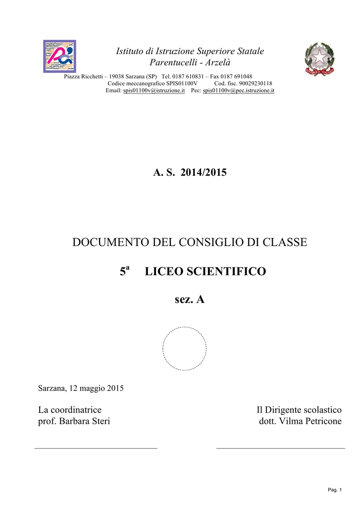 Istituto di Istruzione Superiore Statale Parentucelli - Arzelà Piazza Ricchetti – 19038 Sarzana (SP) Tel. 0187 610831 – Fax 0187 691048 Codice meccanografico SPIS01100V Cod. fisc. 90029230118 Email: [email protected] Pec: [email protected] A. S. 2014/2015 DOCUMENTO DEL CONSIGLIO DI CLASSE 5a LICEO SCIENTIFICO sez. A Sarzana, 12 maggio 2015 La coordinatrice prof. Barbara Steri Il Dirigente scolastico dott. Vilma Petricone Pag. 1 Istituto di Istruzione Superiore Statale Parentucelli - Arzelà Piazza Ricchetti – 19038 Sarzana (SP) Tel. 0187 610831 – Fax 0187 691048 Codice meccanografico SPIS01100V Cod. fisc. 90029230118 Email: [email protected] Pec: [email protected] CONTENUTO: • SCHEDA SUL PROFILO DELLA CLASSE p. 3 • SCHEDA INFORMATIVA SULLA PROGRAMMAZIONE GENERALE DEL CdC p. 4 • SCHEDA INFORMATIVA SULLE PROVE SVOLTE p. 6 • SCHEDA DI SOTTOSCRIZIONE DEL CONSIGLIO DI CLASSE p. 8 SCHEDE INFORMATIVE SULLA PROGRAMMAZIONE DI: • ITALIANO • LATINO • LINGUA INGLESE • STORIA • FILOSOFIA • MATEMATICA • FISICA • SCIENZE • DISEGNO E STORIA DELL’ARTE • EDUCAZIONE FISICA • RELIGIONE ALLEGATI • n° 2 Testi delle simulazioni della terza prova • Simulazione del 27/2/2015 • Simulazione del 4/5/205 n° 2 griglie di correzione e valutazione • • Griglia III prova Griglie elaborati Italiano p. 9 p. 12 p. 15 p. 16 p. 18 p. 20 p. 22 p. 24 p. 25 p. 26 p. 28 p. 31 p. 36 p. 41 p. 42 Pag. 2 SCHEDA SUL PROFILO DELLA CLASSE • La classe è composta da 24 studenti: n. 14 maschi e n. 10 femmine PROSPETTO EVOLUTIVO CLASSE a 3 4a 5a • Iscritti (N. studenti) 22+1 23+1 24 Promossi Giugno (Numero) 17 16 Non Promossi (Numero) 0 0 Ritirati (Numero) 0 0 Le seguenti materie hanno subito, nel triennio, un avvicendamento dei docenti incidendo sulla didattica in modo: Materia Storia Filosofia Disegno e storia dell’arte Latino • Promossi Settembre (Numero) 6 8 ininfluente significativo X X determinante X X PROFILO SINTETICO DELLA CLASSE La classe è formata da ventiquattro studenti, quasi tutti provenienti dal nucleo originario. Degli attuali elementi si registra che soltanto due alunni si sono inseriti rispettivamente al terzo e al quarto anno da un altro Istituto. Per quanto riguarda la continuità didattica, si segnala che il corpo docente ha avuto una relativa stabilità; per Storia/Filosofia e Latino ci sono stati insegnanti diversi in III, IV, V; l’insegnante di Disegno e Storia dell’ arte è cambiato in IV. Gli alunni della 5ª A costituiscono un gruppo abbastanza unito e solidale che ha condiviso il processo educativo e di crescita culturale partecipando con notevole interesse alle varie esperienze proposte dalla scuola. Negli anni, gli studenti hanno raggiunto gradualmente una maggiore consapevolezza di sé e del loro ruolo, e hanno dato prova di regolare crescita e progressione nel lavoro. Il consiglio di classe si è impegnato molto per favorire la partecipazione degli alunni a tutte le attività scolastiche e per coinvolgerli nel processo di insegnamento-apprendimento. I risultati sono stati apprezzabili: i ragazzi hanno partecipato alle lezioni con curiositas per i temi trattati e con forte motivazione; hanno condiviso l’esigenza della costruzione di un dialogo formativo realmente educativo - anche se in maniera diversa e in conformità alla propria specificità individuale -, ed espresso il loro spessore interiore prendendo parte, per esempio, a tante esperienze di carattere culturale e umanitario che sono state offerte loro nel corso del triennio. Significativa la partecipazione nel corso del triennio di alcuni studenti alle Olimpiadi di Scienze e di Fisica (fase regionale), Matematica (fase nazionale). Il gruppo classe è piuttosto omogeneo per interessi, sul piano dell’impegno e del rendimento scolastico. Gli insegnanti del consiglio di classe ritengono che il livello medio della classe, in termini di conoscenze, competenze e capacità, sia più che soddisfacente in tutte le discipline. I risultati conseguiti da ogni studente, invece, scaturiscono, oltre che dall’efficacia dell’azione didattica, dall’impegno che ciascuno di loro ha profuso, dalle attitudini e dalle capacità individuali. Di conseguenza, gli esiti sono distinti sia a livello di discipline – si vedano le relazioni individuali dei docenti – sia per quanto riguarda il grado di autonomia metodologica raggiunta dagli studenti. Per quanto concerne le valutazioni degli apprendimenti degli alunni, si individuano quattro fasce di livello: Pag. 3 • • • • La prima è caratterizzata da alcuni allievi che hanno acquisito una preparazione completa e sicura in tutti i settori: motivati e interessati a tutte le discipline, hanno seguito le lezioni con attenzione e partecipazione propositiva, rispettando tutte le scadenze didattiche; la costanza nell’applicazione/ impegno, coniugata con i personali interessi culturali, ha consentito loro di sviluppare un metodo di studio critico che si manifesta nella capacità di analizzare i problemi, sintetizzare in maniera organica con adeguati collegamenti e soprattutto nella rielaborazione autonoma dei contenuti. La seconda fascia, circa 1/3 della classe, è costituita di alunni dotati di buone capacità e impegnati con assiduità, che hanno conoscenze solide e raggiungono competenze adeguate agli obiettivi prefissati. Hanno infatti dimostrato di possedere ed elaborare i contenuti delle discipline; hanno buone capacità di analisi e sintesi e un metodo di studio efficace. La terza fascia riguarda allievi che raggiungono livelli adeguati e talora discreti: possiedono i contenuti fondamentali delle discipline; l’esposizione è generalmente corretta; l’analisi e la sintesi sono essenziali; il metodo è adeguato, anche se talvolta l’acquisizione dei contenuti è prevalentemente mnemonica. La parte restante della classe – un numero veramente esiguo di alunni - nel corso degli anni ha mostrato difficoltà in alcune discipline, sommando a qualc