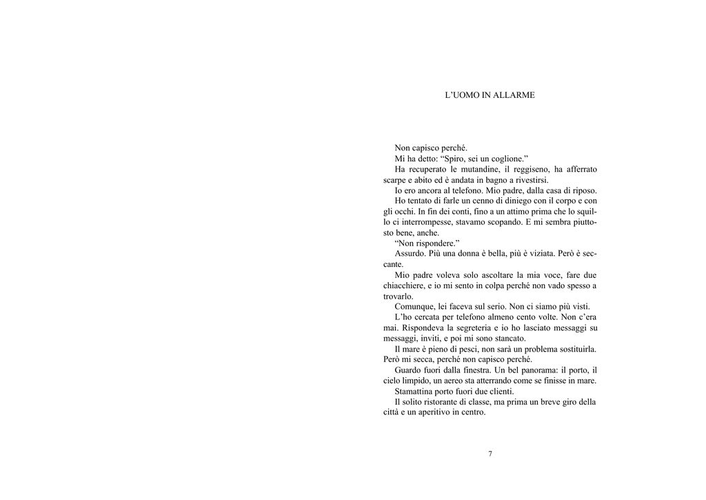 L’UOMO IN ALLARME Non capisco perché. Mi ha detto: “Spiro, sei un coglione.” Ha recuperato le mutandine, il reggiseno, ha afferrato scarpe e abito ed è andata in bagno a rivestirsi. Io ero ancora al telefono. Mio padre, dalla casa di riposo. Ho tentato di farle un cenno di diniego con il corpo e con gli occhi. In fin dei conti, fino a un attimo prima che lo squillo ci interrompesse, stavamo scopando. E mi sembra piuttosto bene, anche. “Non rispondere.” Assurdo. Più una donna è bella, più è viziata. Però è seccante. Mio padre voleva solo ascoltare la mia voce, fare due chiacchiere, e io mi sento in colpa perché non vado spesso a trovarlo. Comunque, lei faceva sul serio. Non ci siamo più visti. L’ho cercata per telefono almeno cento volte. Non c’era mai. Rispondeva la segreteria e io ho lasciato messaggi su messaggi, inviti, e poi mi sono stancato. Il mare è pieno di pesci, non sarà un problema sostituirla. Però mi secca, perché non capisco perché. Guardo fuori dalla finestra. Un bel panorama: il porto, il cielo limpido, un aereo sta atterrando come se finisse in mare. Stamattina porto fuori due clienti. Il solito ristorante di classe, ma prima un breve giro della città e un aperitivo in centro. 7 ANNALISA FERRUZZI L’UOMO IN ALLARME Ho dimenticato di ritirare i pantaloni in lavanderia. Apro la rubríca, cerco il numero di telefono, lo digito. È occupato, maledizione! Sento la tensione nei muscoli del collo. Lascio stare il telefono. Mi massaggio con le dita, mi interrompo e riprovo a chiamare. Occupato. Mi sforzo di aspettare ma non posso, maledizione!, non posso tenere il telefono occupato perché potrebbe chiamare qualcuno. Potrebbero essere i clienti, o i potenziali clienti, o mio padre, o la direttrice della casa di riposo, magari è successo qualcosa, si è sentito male. Sbatto giù il telefono. Faccio un giro per la stanza, guardo i quadri uno per uno, roba fine, mi sono costati un occhio. Non funziona: in realtà voglio solo sapere se i miei pantaloni sono pronti. Rifaccio il numero e finalmente dà libero. La signora tenta di attaccare bottone, è appiccicosa, proprio come quando vado in negozio. Mi fa ridere eppure mi innervosisce. Taglio corto: sono o non sono pronti? Non me ne frega niente delle macchie difficili. Si decide sospirando: ebbene sí, sono pronti e posso passare a ritirarli anche subito. Però insiste che mi ha riservato un trattamento speciale. Ora sono solo nervoso. Saluto in tono freddo, guardo l’orologio: è ancora presto, ma con questa gente non si sa mai, magari sono capaci di arrivare in anticipo. Tanto per passare il tempo mi gingillo con l’idea di chiamarla ancora una volta. Non se lo merita, e in realtà non me ne importa un accidente, di lei, ma non riesco a digerire il fatto di essere stato scaricato senza un motivo. Ricordo il numero a memoria, ho una memoria formidabile per queste cose. Conto gli squilli e mi aspetto di sentire la voce impersonale della segreteria. Al settimo squillo invece risponde. La voce è roca, dolce. Mi spiazza. Che cavolo le dico? E se riattacca? “Sono Spiro.” Mi arriva all’orecchio, inequivocabile, uno sbuffo d’insofferenza. Ci rimango male. Indurisco il tono della voce: non sono mica uno di quei suoi amici che le sbavano dietro! “Voglio sapere perché! Hai capito, stronza?” urlo, ho perso il controllo. Questo mi convince, se ce ne fosse bisogno, che devo assolutamente fare una partita a tennis, qualcosa che mi scarichi la tensione. Lei sta ridendo, cattiva. “Sei proprio un coglione, Spiro. Se non riesci ad arrivarci da solo, ti darò un’indicazione: fatti curare da uno psichiatra.” Mi sbatte il telefono in faccia. Il groppo di insulti che mi si era formato in gola resta lí, e fa male. Mi viene voglia di spaccarle la faccia. Per un attimo sono tentato di spaccare il telefono. Non posso. Cedere alla violenza mi fa stare ancora peggio. È sempre stato cosí, fin da bambino. Una volta ricordo di aver fatto volare dalla finestra la mia radio preferita perché mio padre si era rifiutato di darmi le chiavi della macchina. Mi era venuta la febbre, dopo. Mi accorgo di avere ancora in mano il ricevitore, il segnale acustico è querulo e fastidioso. E magari, mentre perdevo tempo ad ascoltare quella mentecatta, ha chiamato qualcuno e ha trovato occupato. 8 9 ANNALISA FERRUZZI L’UOMO IN ALLARME Controllo il cellulare: niente. L’ansia riaffiora. Secondo le lancette dell’orologio l’ora dell’appuntamento è passata da dieci minuti. Meglio cosí. Uno psichiatra!? Ci vada lei, a farsi curare da uno psichiatra. Una che te la dà dopo quattro ore scarse che ti conosce, che ti fa fare tutti i giochetti che vuoi e poi si scoccia se rispondi al telefono. Roba da matti! Appunto. A meno che... Forse a letto fingeva, forse non era soddisfatta e si è voluta vendicare, le donne sono imprevedibili. Eppure, sembrava cosí sfrenata. E brava la ragazza, complimenti, è riuscita a farmi dubitare della mia virilità. Squilla il telefono. Allungo il braccio. Lei può andare a farsi fottere. Suona il citofono: sono loro. Rispondo sbrigativo al cliente che vorrebbe fissare un appuntamento, gli chiedo di attendere mentre il citofono riprende a ronzare. Dico che scenderò subito. Torno al telefono, spiego la situazione, prometto di richiamare al più presto, inserisco la segreteria, afferro la giacca e il cellulare e mi precipito incontro ai due uomini che aspettano di sotto. Solo in quel momento, come si aprisse una sciabolata di luce nel mio cervello, mi si schiariscono le idee. La troia! Ecco perché, ecco che cosa. Di sicuro ha un altro per le mani, forse più ricco, più potente. Avrei dovuto pensarci subito. È questo il solo motivo plausibile. L’ansia sottile che cominciava a degenerare in angoscia si sta levando in alto come una nebbiolina diradata dal sole. Vorrei chiamarla e urlarglielo nelle orecchie. Sorrido a me stesso. I due uomini nell’atrio mi guardano sorridendo a loro volta. 