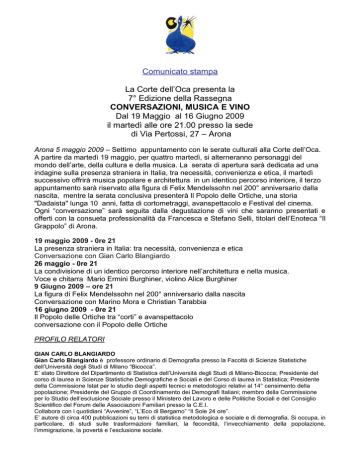 Comunicato stampa La Corte dell’Oca presenta la 7° Edizione della Rassegna CONVERSAZIONI, MUSICA E VINO Dal 19 Maggio al 16 Giugno 2009 il martedì alle ore 21.00 presso la sede di Via Pertossi, 27 – Arona Arona 5 maggio 2009 – Settimo appuntamento con le serate culturali alla Corte dell’Oca. A partire da martedì 19 maggio, per quattro martedì, si alterneranno personaggi del mondo dell’arte, della cultura e della musica. La serata di apertura sarà dedicata ad una indagine sulla presenza straniera in Italia, tra necessità, convenienza e etica, il martedì successivo offrirà musica popolare e architettura in un identico percorso interiore, il terzo appuntamento sarà riservato alla figura di Felix Mendelssohn nel 200° anniversario dalla nascita, mentre la serata conclusiva presenterà Il Popolo delle Ortiche, una storia "Dadaista" lunga 10 anni, fatta di cortometraggi, avanspettacolo e Festival del cinema. Ogni “conversazione” sarà seguita dalla degustazione di vini che saranno presentati e offerti con la consueta professionalità da Francesca e Stefano Selli, titolari dell’Enoteca “Il Grappolo” di Arona. 19 maggio 2009 - 0re 21 La presenza straniera in Italia: tra necessità, convenienza e etica Conversazione con Gian Carlo Blangiardo 26 maggio - 0re 21 La condivisione di un identico percorso interiore nell’architettura e nella musica. Voce e chitarra Mario Ermini Burghiner, violino Alice Burghiner 9 Giugno 2009 – ore 21 La figura di Felix Mendelssohn nel 200° anniversario dalla nascita Conversazione con Marino Mora e Christian Tarabbia 16 giugno 2009 - 0re 21 Il Popolo delle Ortiche tra “corti” e avanspettacolo conversazione con il Popolo delle Ortiche PROFILO RELATORI GIAN CARLO BLANGIARDO Gian Carlo Blangiardo è professore ordinario di Demografia presso la Facoltà di Scienze Statistiche dell’Università degli Studi di Milano “Bicocca”. E’ stato Direttore del Dipartimento di Statistica dell’Università degli Studi di Milano-Bicocca; Presidente del corso di laurea in Scienze Statistiche Demografiche e Sociali e del Corso di laurea in Statistica; Presidente della Commissione Istat per lo studio degli aspetti tecnici e metodologici relativi al 14° censimento della popolazione; Presidente del Gruppo di Coordinamento dei Demografi Italiani; membro della Commissione per lo Studio dell’esclusione Sociale presso il Ministero del Lavoro e delle Politiche Sociali e del Consiglio Scientifico del Forum delle Associazioni Familiari presso la C.E.I. Collabora con i quotidiani “Avvenire”, “L’Eco di Bergamo” “Il Sole 24 ore”. E’ autore di circa 400 pubblicazioni su temi di statistica metodologica e sociale e di demografia. Si occupa, in particolare, di studi sulle trasformazioni familiari, la fecondità, l’invecchiamento della popolazione, l’immigrazione, la povertà e l’esclusione sociale. MARIO ERMINI BURGHINER Mario Ermini Burghiner è un architetto con la passione per la musica popolare. Le sue canzoni sono introspettive, parlano di luoghi, persone, situazioni. Raccontano del passato, perché la memoria e le tradizioni insegnano, usando anche il dialetto ossolano. Sono sempre e comunque legate a luoghi fisici. Meglio dire imprescindibilmente “collegate” a luoghi fisici. Sostiene che in architettura: “non è mai stato possibile progettare senza cercare di “incorporarmi” con il “genius loci”, non è possibile scrivere canzoni senza collocarle anche solo mentalmente in un luogo preciso. La mia musica è quindi strettamente connessa all’architettura, intesa nel senso più ampio della parola, intesa come architettura del paesaggio, nel suo insieme.” Condivide questa passione con sua figlia Alice, di 13 anni (ma ci tiene a dire che a luglio ne avrà 14...) che suona sia il volino sia il pianoforte. MARINO MORA E CHRISTAN TARABBIA Marino Mora si è diplomato in Pianoforte con il maestro Folco Perrino presso il Conservatorio “A. Vivaldi” di Alessandria e successivamente in Composizione ad Indirizzo Musicologico presso il Conservatorio “Giuseppe Verdi” di Milano. Dopo il Liceo Classico ha altresì conseguito la laurea in DAMS Musica alla facoltà di Lettere e Filosofia di Bologna. Come esecutore conduce da tempo attività di musica da camera in varie formazioni, tra cui duo, trio, quartetto e quintetto e forma stabilmente il duo a quattro mani “Divertimento Musicale” con Marina Verzoletto. Nel campo della composizione ha scritto fiabe musicale per ragazzi (tra cui Il Principe Felice, L’intrepido soldatino di stagno, L’Usignolo), brani per vari strumenti ed ensemble, lavori per coro e orchestra, operine musicali Christian Tarabbia ha studiato organo e composizione organistica presso il Conservatorio Cantelli di Novara sotto la guida di Giancarlo Bardelli. Allo studio dell’organo e della letteratura concertistica in veste di solista affianca da sempre l’interesse verso la musica corale e strumentale collaborando con il complesso vocale barocco “Clemente Rebora” diretto da Licia Sommacal e con il coro di “Progetto musica” di Biella diretto da Giulio Monaco e con complessi strumentali con i quali ha tenuto numerosi concerti in veste di continuista al cembalo e all’organo. Dall’età di 18 anni ricopre l’incarico di organista titolare presso la Collegiata di Santa Maria di Arona, succedendo in tale incarico a Paolo Crivellaro. IL POPOLO DELLE ORTICHE Il Popolo delle Ortiche nasce nel Luglio 1999 in un paese abbandonato della Val Vigezzo dove è stato girato il primo omonimo cortometraggio. Gli amici (una dozzina) erano tutti di Varallo Pombia ed erano un po’ tutti artisti “fai da te” ovvero autodidatti. Chi dipingeva, chi suonava, chi faceva teatro, e chi si dilettava con la tele camera. Dal 2000 organizzano il festival dei corti cinematografici “varallopop” riuscendo ad auto produrre una rassegna davvero di nicchia che ha fatto il tutto esaurito nelle 9 edizioni proposte. Nel co