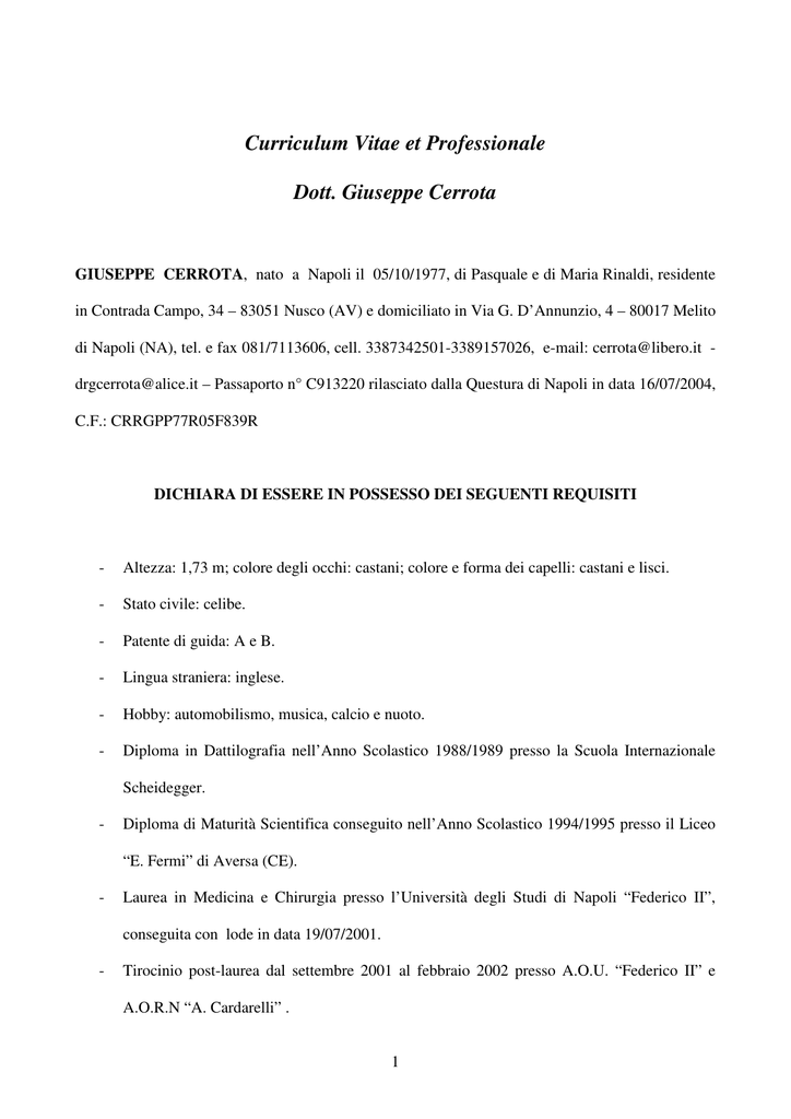 Curriculum Vitae et Professionale Dott. Giuseppe Cerrota GIUSEPPE CERROTA, nato a Napoli il 05/10/1977, di Pasquale e di Maria Rinaldi, residente in Contrada Campo, 34 – 83051 Nusco (AV) e domiciliato in Via G. D’Annunzio, 4 – 80017 Melito di Napoli (NA), tel. e fax 081/7113606, cell. 3387342501-3389157026, e-mail: [email protected] [email protected] – Passaporto n° C913220 rilasciato dalla Questura di Napoli in data 16/07/2004, C.F.: CRRGPP77R05F839R DICHIARA DI ESSERE IN POSSESSO DEI SEGUENTI REQUISITI - Altezza: 1,73 m; colore degli occhi: castani; colore e forma dei capelli: castani e lisci. - Stato civile: celibe. - Patente di guida: A e B. - Lingua straniera: inglese. - Hobby: automobilismo, musica, calcio e nuoto. - Diploma in Dattilografia nell’Anno Scolastico 1988/1989 presso la Scuola Internazionale Scheidegger. - Diploma di Maturità Scientifica conseguito nell’Anno Scolastico 1994/1995 presso il Liceo “E. Fermi” di Aversa (CE). - Laurea in Medicina e Chirurgia presso l’Università degli Studi di Napoli “Federico II”, conseguita con lode in data 19/07/2001. - Tirocinio post-laurea dal settembre 2001 al febbraio 2002 presso A.O.U. “Federico II” e A.O.R.N “A. Cardarelli” . 1 - Abilitazione all’esercizio della professione di Medico-Chirurgo conseguita nella I Sessione del 2002 con votazione 30/30. - Iscrizione all’albo dei Medici Chirurghi ed Odontoiatri di Napoli in data 18/11/2002 al numero 29883. - Specializzazione in Ginecologia e Ostetricia, conseguita con lode in data 24/10/2006, presso l’Università degli Studi di Napoli “Federico II” – Scuola di Specializzazione in Ginecologia e Ostetricia – Direttore: Prof. C. Nappi. - Specializzazione in 118 ed Emergenza Sanitaria Territoriale conseguita presso l’ASL BA5 in data 26/03/2007. - Dottorato di Ricerca in Riproduzione, Sviluppo e Accrescimento dell’Uomo – XXII ciclo, conseguito con esito positivo in data 14/12/2009, presso l’Università degli Studi di Napoli “Federico II” – Coordinatore: Prof. C. Pignata. - Dirigente Medico U.O.C. 118 ed Emergenza Territoriale ASL NA2 Nord, in servizio presso il Pronto Soccorso del P.O. “Santa Maria delle Grazie” di Pozzuoli (NA). - Ufficiale Medico del Corpo Militare della Croce Rossa Italiana, X Centro di Mobilitazione Napoli. - Medico di bordo supplente. Ministero della Salute. Dipartimento della Prevenzione e Comunicazione. Direzione Generale della Prevenzione Sanitaria. Ufficio III. Roma. - Iscritto nell’Albo dei C.T.U. del Tribunale di Napoli al n° 7405. - Iscritto nell’Albo dei Periti Penali del Tribunale di Napoli al n° 462. - Diplomato in Medicina Estetica con lode in data 13/10/2012 presso la Scuola Internazionale di Medicina Estetica – Fondazione Internazionale Fatebenefratelli di Roma – Direttore: Prof. C.A. Bartoletti. - Medico Titolare Rappresentante ANFFAS ONLUS – Commissione medica per l’accertamento dell’invalidità civile ed handicap – A.S.L. NA2 Nord, Distretto Sanitario di Base 40, Mugnano di Napoli (NA). 2 - Componente ASL NA2 Nord Commissione Invalidi Civili e legge 104/92 Distretto Sanitario di Base 37, Giugliano in Campania - ASL NA2 Nord. - General Manager – Gyn Tonic Cover Band, Organizzatore di Eventi for Benefit. - Collaboratore di progetti di ricerca finanziati dal Ministero della Sanità e dall’Università. - Autore di pubblicazioni scientifiche edite su riviste internazionali ad elevato impact factor. - Autore di capitoli di libri, di testi scientifici e di pubblicazioni scientifiche edite su riviste nazionali. - Membro di società scientifiche internazionali quali: SEGI (Società Italiana di Endoscopia Ginecologica), AIUG (Associazione Italiana di Urologia Ginecologica e del Pavimento Pelvico), SICPCV (Società Italiana di Colposcopia e Patologia Cervico-Vaginale), S.Na.C. (Società Napoletana di Chirurgia). - Socio al Lions Club Distretto 108YA di Ottaviano. - Socio A.I.S.E.R.V. O.N.L.U.S. (Associazione Italiana per lo Studio E la Ricerca Virologica) c/o U.O.C. Virologia – A.O. “D. Cotugno”, Napoli – Presidente: Dott. Ciro Esposito. - Socio all’Associazione Nazionale Carabinieri Sezione di Mugnano di Napoli Car. S. Nuvoletta Medaglia d’Oro. - Segretario Scientifico di Congressi/Corsi di Aggiornamento. - Consigliere del Comune di Melito di Napoli. - Direttore Sanitario della Confraternita di Misericordia di Napoli dal 07/10/2013. - Primo operatore in numerosi interventi chirurgici in ambito ostetrico-ginecologico (con particolare pertinenza all’IVG e diagnostica prenatale), in ambito di medicina e chirurgia d’urgenza e di medicina estetica. Mi riservo di esibire successivamente, qualora richiesto, il mio Curriculum Vitae, riguardante la attività di ricerca scientifica e le pubblicazioni di lavori su riviste nazionali ed internazionali ad 3 elevato impact factor da me redatte, l’organizzazione e la partecipazione a Congressi e a Corsi di Formazione a livello nazionale ed internazionale, nonché il tipo e il numero di interventi medicochirurgici da me eseguiti. Esprimo il mio consenso relativo al trattamento dei dati personali, secondo la legge sulla privacy, relativamente a vostre future informazioni di carattere istituzionale e formativo. 04/11/2013 In fede Dott. Giuseppe Cerrota 4