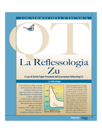 I QUADERNI DELLA TECNICA QT La Reflessologia Zu A cura di Davide Pigato Presidente dell’Associazione Reflessologi Zu Le reflessologie Un’evoluzione delle tecniche tradizionali di reflessologia plantare basata su una rigorosa ricerca e coadiuvato dalla Medicina Tradizionale Cinese: agisce sulla componente organica della pianta del piede, interpreta le alterazioni psico-somatiche attraverso le dita, orienta il “Qi” (soffio, energia) attraverso i meridiani energetici dell’arto inferiore. Fig. 1 – Immagine di una persona riflessa sul piede Capita frequentemente di leggere che “la reflessologia ha origini antiche che si perdono nella notte dei tempi” e un po’ ovunque si tende ad ammantare di mistero questa tecnica che di misterioso non ha assolutamente nulla. Iridologia, auricoloterapia, reflessologia zonale della mano, reflessologia plantare sono alcune delle diverse forme di reflessologia ad oggi conosciute e tutte sono state elaborate e codificate in tempi assai recenti. ShiatsuDo 47 T E C N I C A Q U A D E R N I D E L L A Nella cultura ebraica si descriveva il giovane che doveva portare le offerte all’altare come colui che “non doveva avere macchie sul corpo e negli occhi”. Il cenno alle macchie negli occhi (iride) già fa presupporre I Fig. 2 - Visione laterale e plantare di un piede normale la presenza di qualche problematica riflessa ma non si può parlare ancora di iridologia in quanto sono considerati fondatori dell’iridologia moderna l’ungherese Ignaz Von Peczley (1826-1911) e lo svedese Niels Liljequist (18511936), dai quali si svilupparono in seguito la scuola tedesca, francese, americana. Nelle nostre campagne può succedere ancora di incontrare persone anziane alle quali è stato cauterizzato l’antelice dell’orecchio con un ferro da calza per risolvere problemi di sciatica ma quella non è ancora auricoloterapia né tantomeno auricolomedicina in quanto è solo nei primi anni ‘50 che il medico francese Paul Nogier inizia ad organizzare la proiezione fetale sul padiglione auricolare dando così vita allo studio dell’auricoloterapia. Le donne pellerossa, abituate a partorire da sole, stringevano forte nelle mani un pettine per resistere ai dolori del parto ma non si poteva ancora parlare di “reflessologia zonale della mano”. L’uomo da sempre si è avvalso di queste metodiche empiriche differenti tra loro senza che mai ci sia stata una benché minima elaborazione o classificazione: semplicemente si utilizzavano dei “punti riflessi” ovvero quelle particolari zone del nostro corpo che, se sollecitate adeguatamente, determinano una reazione antalgica (scomparsa del dolore) in una differente area del corpo distante da quella stimolata. . Cosa sono allora le “reflessologie”? Fig. 3 - Visione laterale e plantare di un piede cavo Fig. 4 - Visione laterale e plantare di un piede piatto 48 Le reflessologie sono la proiezione completa ancestrale di tutto il corpo solo su una parte di esso. Immaginiamo di fotografare una persona, di rimpicciolire la foto e di visualizzarla su una parte del corpo: troveremo proiettato l’intero organismo con tutte le sue proporzioni in maniera precisa e logica. Se guardiamo ad esempio un disegno stilizzato di un piede, identifichiamo l’immagine di una persona seduta: la testa, la curva cifotica e lordotica, il bacino, il petto e l’addome (fig. 1). Troviamo le curve della colonna vertebrale proiettate sul piede nella visione mediale e plantare, nella proiezione anatomica di un piede normale (fig. 2) ed in quella patologica di un piede cavo o di un piede piatto (fig. 3 e 4). Le terminazioni nervose, attraverso i processi di afferenza ed efferenza, trasmettono dall’interno verso l’esterno (e viceversa) disagi e problematiche degli organi interni.Attraverso questi meccanismi si è così in grado di raggiungere i differenti organi con sollecitazioni mirate all’ottenimento dell’ossigenazione dei tessuti mediante la vascolarizzazione degli stessi. Le reflessologie interpretano quindi i “segnali” che il nostro organismo invia alle zone corporee più periferiche e con la maggior concentrazione di terminazioni nervose: mani, orecchie, lingua, naso, occhi e soprattutto i piedi. La Reflessologia Zu, reflessologia “evolutiva” La Reflessologia Zu è il metodo più scientifico ed analitico esistente, sviluppato da Alfredo Esposito Baldassarre (fig. 5) dal 1981 ed ancora oggi in continua evoluzione. Perché utilizzare il termine reflessologia e non riflessologia? Reflessologia e riflessologia sono parole etimologicamente ibride, composte da re-flecto (in latino) e logos (cioè discorso in greco). L’etimologia della parola “riflesso” deriva dal latino reflectere dove re significa “ripetere un’azione” e flecto “curvare, piegare”; pertanto reflectere indica la deviazione di un’energia, il rimandare indietro qualche cosa... Con la prima trasformazione dal latino al volgare e poi all’attuale italiano, il termine reflexus (participio passato di reflectere), si è trasformata da reflexo in reflesso e poi in riflesso. Nelle lingue straniere la radice latina re è rimasta una costante. In inglese: reflexology, reflexologists In francese: reflexologie zones, réflexes plantaires In tedesco: reflexzonen, reflexzonentherapie In spagnolo: reflexología del pie In portoghese: reflexologia plantar In estone: refleksoloogid. Nelle differenti lingue derivano i seguenti termini: reflexzones, reflexologen, reflexzonen, reflexlo, reflexzonetherapeuten, reflexologue reflexotherapists, reflexologi, reflexologues. Fig. 6 – ideogramma Zu Zu (ideogramma in fig. 6), in lingua cinese, va letto con il secondo tono di voce; l’accento che sale gli fa assumere diversi significati: - Piede, arto inferiore - Andare, prendere una direzione Il piede è quella specifica parte del corpo che garantisce all’uomo il contatto con la Terra, la fisicità, la struttura (lo yin) ed allo stesso tempo, tramite un osso unico tra