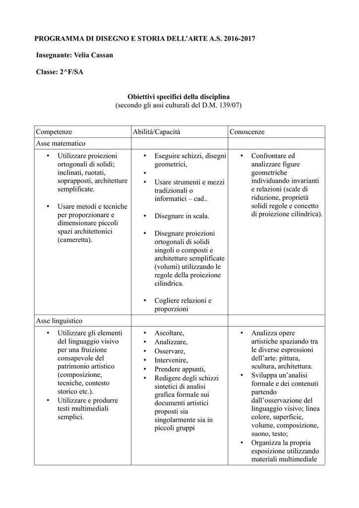 PROGRAMMA DI DISEGNO E STORIA DELL’ARTE A.S. 2016-2017 Insegnante: Velia Cassan Classe: 2^F/SA Obiettivi specifici della disciplina (secondo gli assi culturali del D.M. 139/07) Competenze Abilità/Capacità Conoscenze Asse matematico • • Utilizzare proiezioni ortogonali di solidi; inclinati, ruotati, soprapposti, architetture semplificate. Usare metodi e tecniche per proporzionare e dimensionare piccoli spazi architettonici (cameretta). • • • Eseguire schizzi, disegni geometrici, • Confrontare ed analizzare figure geometriche individuando invarianti e relazioni (scale di riduzione, proprietà solidi regole e concetto di proiezione cilindrica). • Analizza opere artistiche spaziando tra le diverse espressioni dell’arte: pittura, scultura, architettura. Sviluppa un’analisi formale e dei contenuti partendo dall’osservazione del linguaggio visivo; linea colore, superficie, volume, composizione, suono, testo; Organizza la propria esposizione utilizzando materiali multimediale Usare strumenti e mezzi tradizionali o informatici – cad.. • Disegnare in scala. • Disegnare proiezioni ortogonali di solidi singoli o composti e architetture semplificate (volumi) utilizzando le regole della proiezione cilindrica. • Cogliere relazioni e proporzioni • • • • • • Ascoltare, Analizzare, Osservare, Intervenire, Prendere appunti, Redigere degli schizzi sintetici di analisi grafica formale sui documenti artistici proposti sia singolarmente sia in piccoli gruppi Asse linguistico • • Utilizzare gli elementi del linguaggio visivo per una fruizione consapevole del patrimonio artistico (composizione, tecniche, contesto storico etc.). Utilizzare e produrre testi multimediali semplici. • • Competenze trasversali di cittadinanza Attraverso lo studio di disegno e storia dell’arte alla fine del biennio, l’allievo potrà acquisire le seguenti competenze di cittadinanza (secondo il documento tecnico allegato al D.M. 139/07). Per le abilità relative alle competenze chiave citate si rimanda al P.O.F. Competenze Esempi di situazioni educative Imparare ad imparare Determinare coscientemente obiettivi, tempi, passaggi; costruire un piano di lavoro e rispettare tempi e scadenze; Organizzare il proprio apprendimento, individuando, scegliendo ed utilizzando varie fonti e varie strategie, anche in funzione dei tempi propri e a disposizione. Autocorrezione: coerenza/esaustività/autonomia esecutiva nei disegni e nell’esposizione orale Comunicare comprendere esporre Schemi per comprendere, schemi per esporre; fare sintesi Comprensione del linguaggio visivo; identificare il lessico tecnico del disegno geometrico e della storia dell’arte Focalizzazione e confronto tra documenti/immagini di culture/popoli differenti Esporre a voce o per iscritto, in funzione di un’interrogazione; usare il lessico specifico Rielaborare un approfondimento mediante supporti differenti Collaborare e partecipare Lavori di gruppo, cooperative learning • Discussioni guidate Individuare collegamenti e relazioni Attività su mappe concettuali, confronti diacronici; analisi di immagini tratte dal patrimonio artistico. Acquisire ed interpretare l’informazione Uso di fonti differenti Approfondimenti su strumenti cartacei e multimediali Contenuti Disegno 1. 2. 3. 4. I piani di sezione applicati alle proiezioni ortogonali Assonometria isometrica, monometrica, cavaliera di volumi semplici Assonometria isometrica, monometrica e cavaliera di particolari architettonici semplici Proiezioni ortogonali di volumi semplici e complessi posti inclinati rispetto a diversi piani proiettivi: metodo dei piani ausiliari 5. Le scale metriche nella realizzazione degli elaborati grafici (scale di riduzione ed ingrandimento) 6. Esercitazione di disegno a mano libera relativamente particolari architettonici decorativi ed architetture semplificate tratti dalla storia dell’arte studiata 7. Rilievo di oggetti ed ambienti e successiva stesura grafica Storia dell’arte Storia dell'arte a) 1. La scultura romana: il ritratto, il rilievo di arte plebea, il rilievo storico-celebrativo (Ara Pacis Augustae, Colonna Traiana) 2. Arte romana di fine impero: architettura e scultura 3. Arte romana e continuità nell'arte paleocristiana – significati e simboli 4. Architettura paleocristiana: la basilica paleocristiana 5. I mosaici e la scultura paleocristiana 6. L’arte ravennate: architettura e mosaici b) 1. Arte del periodo giustinianeo: Santa Sofia a Istanbul, Basilica di San Vitale a Ravenna, Basilica di Sant'Apollinare in Classe a Ravenna 2. Arte barbarica: I Longobardi – Cividale del Friuli 3. L’arte della Rinascenza Carolingia e Ottoniana 4. Il Romanico: inquadramento storico artistico 5. L’architettura romanica in Europa e in Italia 6. La scultura romanica in Italia e in Europa: Wiligelmo 7. La pittura romanica: arte miniatore ed affreschi, le croci dipinte 8. Il Gotico: inquadramento storico artistico 9. Benedetto Antelami 10. Architettura gotica e le sue tecniche costruttive in Italia ed Europa 11. La Rinascenza federiciana 12. La scultura gotica in Italia e Francia: Nicola Pisano, Giovanni Pisano, Arnolfo di Cambio, Pietro Cavallini c) 1. La pittura gotica europea ed italiana: Le vetrate, le tavole e le croci dipinte, Cimabue e la scuola fiorentina, Duccio di Buoninsegna e la scuola senese 2. L’arte gotica in Italia nel Trecento: inquadramento storico artistico 3. Cattedrali e palazzi nel Trecento in Italia 4. Giotto e i giotteschi – approfondimento della Cappella degli Scrovegni di Padova 5. Simone Martini e Ambrogio Lorenzetti Tempi di attuazione del programma Ore settimanali: 2 delle quali n.1 saranno dedicate alla storia dell’arte e n.1 al disegno Metodologia e strumenti didattici Metodologia • lezione frontale e interattiva • discussione • laboratorio testuale: attività scritte e/o orali, individuali e/o di gruppo • lezione/applicazione (spiegazione seguita da esercizi applicativi) • progetto/ind
