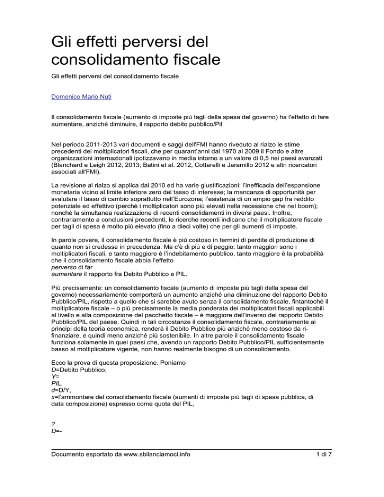 Gli effetti perversi del consolidamento fiscale Gli effetti perversi del consolidamento fiscale Domenico Mario Nuti Il consolidamento fiscale (aumento di imposte più tagli della spesa del governo) ha l'effetto di fare aumentare, anziché diminuire, il rapporto debito pubblico/Pil Nel periodo 2011-2013 vari documenti e saggi dell'FMI hanno riveduto al rialzo le stime precedenti dei moltiplicatori fiscali, che per quarant’anni dal 1970 al 2009 il Fondo e altre organizzazioni internazionali ipotizzavano in media intorno a un valore di 0,5 nei paesi avanzati (Blanchard e Leigh 2012, 2013; Batini et al. 2012, Cottarelli e Jaramillo 2012 e altri ricercatori associati all'FMI). La revisione al rialzo si applica dal 2010 ed ha varie giustificazioni: l’inefficacia dell’espansione monetaria vicino al limite inferiore zero del tasso di interesse; la mancanza di opportunità per svalutare il tasso di cambio soprattutto nell’Eurozona; l’esistenza di un ampio gap fra reddito potenziale ed effettivo (perché i moltiplicatori sono più elevati nella recessione che nel boom); nonché la simultanea realizzazione di recenti consolidamenti in diversi paesi. Inoltre, contrariamente a conclusioni precedenti, le ricerche recenti indicano che il moltiplicatore fiscale per tagli di spesa è molto più elevato (fino a dieci volte) che per gli aumenti di imposte. In parole povere, il consolidamento fiscale è più costoso in termini di perdite di produzione di quanto non si credesse in precedenza. Ma c’è di più e di peggio: tanto maggiori sono i moltiplicatori fiscali, e tanto maggiore è l’indebitamento pubblico, tanto maggiore è la probabilità che il consolidamento fiscale abbia l’effetto perverso di far aumentare il rapporto fra Debito Pubblico e PIL. Più precisamente: un consolidamento fiscale (aumento di imposte più tagli della spesa del governo) necessariamente comporterà un aumento anziché una diminuzione del rapporto Debito Pubblico/PIL, rispetto a quello che si sarebbe avuto senza il consolidamento fiscale, fintantoché il moltiplicatore fiscale – o più precisamente la media ponderata dei moltiplicatori fiscali applicabili al livello e alla composizione del pacchetto fiscale – è maggiore dell’inverso del rapporto Debito Pubblico/PIL del paese. Quindi in tali circostanze il consolidamento fiscale, contrariamente ai principi della teoria economica, renderà il Debito Pubblico più anziché meno costoso da rifinanziare, e quindi meno anziché più sostenibile. In altre parole il consolidamento fiscale funziona solamente in quei paesi che, avendo un rapporto Debito Pubblico/PIL sufficientemente basso al moltiplicatore vigente, non hanno realmente bisogno di un consolidamento. Ecco la prova di questa proposizione. Poniamo D=Debito Pubblico, Y= PIL, d=D/Y, x=l’ammontare del consolidamento fiscale (aumenti di imposte più tagli di spesa pubblica, di data composizione) espresso come quota del PIL, ? D=- Documento esportato da www.sbilanciamoci.info 1 di 7 xY ?Y= -mxY dove m è il moltiplicatore fiscale appropriato, ?(D/Y) = [(?D)Y – (?Y)D]/Y 2 = [(-xY)Y – (-mxY)D]/Y 2 = -x Y 2 /Y 2 + mxY D/Y 2 = = -x + mxD/Y = mxd – x e quindi ? (D/Y) = x(md – 1) = xd(m – 1/d) da cui si puo’ vedere che il rapporto D/Y deve aumentare, ossia ?(D/Y) > 0 se e solo se m> 1/d. Q.E.D. L’interesse di questa proposizione è che l’inverso del rapporto D/Y naturalmente è tanto più piccolo quanto più pesantemente indebitato è un paese, e particolarmente piccolo relativamente all’ordine di grandezza dei moltiplicatori fiscali accertati nella letteratura recente (ad esempio Blanchard e Leigh 2012, 2013, Batini et al. 2012, Cottarelli e Jaramillo 2012 e altri ricercatori associati al FMI). Quindi il carattere controproducente del consolidamento fiscale nei paese avanzati, specialmente nei paesi altamente indebitati con moltiplicatori fiscali elevati, diventa la norma anziché l’eccezione, una certezza assoluta nella maggior parte di questi se non addirittura in tutti. Documento esportato da www.sbilanciamoci.info 2 di 7 Figura 1. Illustrazione di consolidamento fiscale perverso, che fa aumentare il rapporto Debito Pubblico/PIL (i.e. ?(D/Y) > 0 per valori plausibili di m e come funzione crescente di D/Y). La figura qui sopra (per cui sono in debito con la mia collega Marilena Giannetti) illustra l’impatto di un pacchetto di consolidamento fiscale del 5% del PIL, relativamente modesto secondo gli standards della crisi corrente, sul rapporto Debito Pubblico/PIL, ?(D/Y)= x(md – 1), in funzione del valore corrente di d=D/Y che va dal 50% a oltre il 200% del PIL e per valori alternativi dei moltiplicatori fiscali che vanno da 0.5 a 3.5. Per valori elevati di D/Y e moltiplicatori fiscali relativamente elevati ma pur sempre contenuti entro il campo dei valori stimati da fonti FMI recenti, l’aumento del rapporto D/Y può essere devastante. A titolo di esempio, un paese con d=1.20, m=3, che intraprenda un consolidamento fiscale di x=5% del PIL, vedrebbe aumentare il suo d di 0.05*(1.20*3-1)=13% del PIL, da 1.20 a 1.33. In un paese come il Giappone, con un Debito Pubblico di oltre il 200% del PIL, lo stesso consolidamento del 5% del PIL comporterebbe un aumento del rapporto Debito Pubblico/PIL dell’ordine del 30%. Per un effetto perverso del consolidamento fiscale su una base talmente massicia l’affermazione che “Gli effetti di breve periodo della politica fiscale sono solo uno dei tanti fattori che vanno considerati nel determinare il passo appropriato del consolidamento fiscale in ogni singola economia” (Blanchard and Leigh, 2013, p.6) è semplicistica e insincera. La scala del conseguente peggioramento del rapporto D/Y comporta un cambiamento di regime ( regime switch) con effetti prolungati e – qualora le autorità rispondano con ulteriori strette fiscale – auto-perpetuantesi. Tabella 1. Soglia del moltiplicatore fiscale al di sopra del quale il consolidamento fiscale necessa