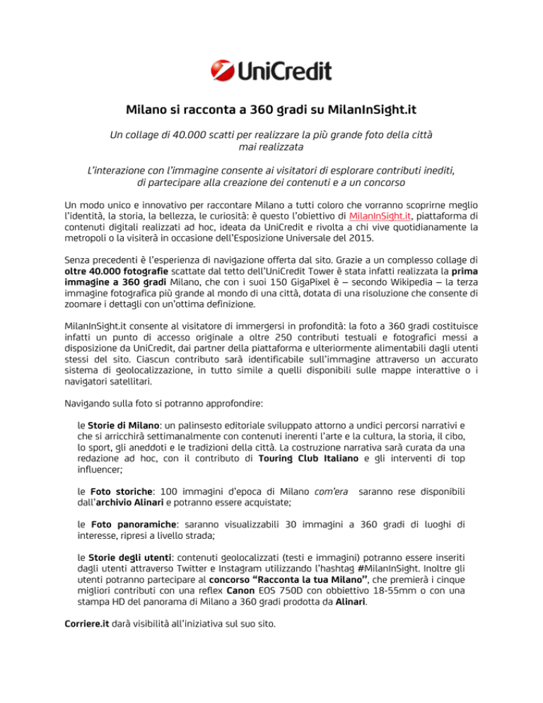 Milano si racconta a 360 gradi su MilanInSight.it Un collage di 40.000 scatti per realizzare la più grande foto della città mai realizzata L’interazione con l’immagine consente ai visitatori di esplorare contributi inediti, di partecipare alla creazione dei contenuti e a un concorso Un modo unico e innovativo per raccontare Milano a tutti coloro che vorranno scoprirne meglio l’identità, la storia, la bellezza, le curiosità: è questo l’obiettivo di MilanInSight.it, piattaforma di contenuti digitali realizzati ad hoc, ideata da UniCredit e rivolta a chi vive quotidianamente la metropoli o la visiterà in occasione dell’Esposizione Universale del 2015. Senza precedenti è l’esperienza di navigazione offerta dal sito. Grazie a un complesso collage di oltre 40.000 fotografie scattate dal tetto dell’UniCredit Tower è stata infatti realizzata la prima immagine a 360 gradi Milano, che con i suoi 150 GigaPixel è – secondo Wikipedia – la terza immagine fotografica più grande al mondo di una città, dotata di una risoluzione che consente di zoomare i dettagli con un’ottima definizione. MilanInSight.it consente al visitatore di immergersi in profondità: la foto a 360 gradi costituisce infatti un punto di accesso originale a oltre 250 contributi testuali e fotografici messi a disposizione da UniCredit, dai partner della piattaforma e ulteriormente alimentabili dagli utenti stessi del sito. Ciascun contributo sarà identificabile sull’immagine attraverso un accurato sistema di geolocalizzazione, in tutto simile a quelli disponibili sulle mappe interattive o i navigatori satellitari. Navigando sulla foto si potranno approfondire: le Storie di Milano: un palinsesto editoriale sviluppato attorno a undici percorsi narrativi e che si arricchirà settimanalmente con contenuti inerenti l’arte e la cultura, la storia, il cibo, lo sport, gli aneddoti e le tradizioni della città. La costruzione narrativa sarà curata da una redazione ad hoc, con il contributo di Touring Club Italiano e gli interventi di top influencer; le Foto storiche: 100 immagini d’epoca di Milano com’era saranno rese disponibili dall’archivio Alinari e potranno essere acquistate; le Foto panoramiche: saranno visualizzabili 30 immagini a 360 gradi di luoghi di interesse, ripresi a livello strada; le Storie degli utenti: contenuti geolocalizzati (testi e immagini) potranno essere inseriti dagli utenti attraverso Twitter e Instagram utilizzando l’hashtag #MilanInSight. Inoltre gli utenti potranno partecipare al concorso “Racconta la tua Milano”, che premierà i cinque migliori contributi con una reflex Canon EOS 750D con obbiettivo 18-55mm o con una stampa HD del panorama di Milano a 360 gradi prodotta da Alinari. Corriere.it darà visibilità all’iniziativa sul suo sito. MilanInSight è uno dei più innovativi esempi in Italia di piattaforma di branded content ed è per vocazione aperta a ulteriori collaborazioni e iniziative grazie ai contenuti condivisi e alle attività di co-marketing. La presentazione del sito web al pubblico è avvenuta in occasione dell’Open Day di UniCredit Tower il 16 e 17 maggio ed è stata l’oggetto di una conferenza stampa cui hanno preso parte in mattinata Paolo Fiorentino, Vice Direttore Generale e COO di UniCredit, Paola De Polo, Consigliere Delegato Alinari, Enrico Deluchi, Amministratore Delegato Canon Italia, Giangiacomo Schiavi, Vice Direttore Corriere della Sera, Francesco Iseppi, Presidente Touring Club Italiano, e Simone Bramante, alias Brahmino, noto Instagrammer. Milano, 18 maggio 2015 UniCredit Media Relations Tel +39 02 88623569 Twitter: @UniCredit_PR - #MilanInsight e-mail: [email protected] Milan InSight I partner Alinari Nel racconto dei luoghi di Milano non potevano mancare le foto del più ricco e antico patrimonio fotografico del mondo: quello degli Archivi Alinari. Straordinarie immagini, dalla fine dell'800 agli anni '60 e '70, che offrono un’occasione unica per vedere l’evoluzione architettonica della città, ma anche per vivere la trasformazione dei costumi e degli stili di vita dei milanesi, in un emozionante tuffo in una Milano dei ricordi e delle tradizioni. La collaborazione tra Alinari e #MilanInSight inoltre rende possibile l’acquisto delle stampe fotografiche delle foto storiche direttamente dalla piattaforma. Per il concorso “Racconta la tua Milano” saranno messe in palio 100 stampe dell'immagine panoramica a 360 gradi di Milano. Canon Fondata nel 1937 per produrre fotocamere di altissimo livello, Canon, multinazionale giapponese con sede a Tokyo, è leader mondiale nella fornitura di innovative soluzioni di imaging per i consumatori e le aziende. Canon entra a far parte del progetto Unicredit, grazie all’utilizzo delle fotocamere EOS 7D con cui sono state realizzate le oltre 50.000 immagini che compongono il più grande ritratto interattivo della città di Milano. Canon metterà in palio ai vincitori del concorso “Racconta la tua Milano” cinque reflex EOS 750D con l’ottica 1855mm. Corriere della Sera Fondato nel 1876, il Corriere della Sera è il più diffuso e autorevole quotidiano in Italia. L’offerta informativa accompagna l’intero arco della giornata sui vari canali del sistema Corriere: carta, sito, tablet, smartphone. Online in tempo reale approfondimenti e notizie, canali tematici, gallerie fotografiche e un’ampia offerta video, che comprende dirette, tg online, rubriche tematiche, e anche spettacolo. Il Corriere della Sera partecipa con piacere al progetto Milan InSight, racconto visuale e collettivo che parla di una Milano grande, viva, moderna. Touring Club Italiano Il Touring Club Italiano da oltre 120 anni promuove e valorizza le bellezze e le eccellenze della nostra Penisola attraverso centinaia di guide viaggio e di volumi illustrati, proponendo uno sguardo autorevole quanto insolito e originale. Il Touring ha scelto pertanto di partecipare a un progetto innovativo come la nuova piattaforma Mil