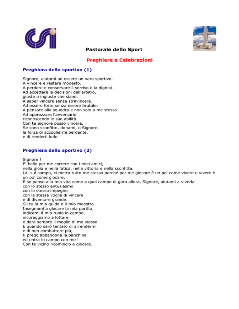 Pastorale dello Sport Preghiere e Celebrazioni Preghiera dello sportivo (1) Signore, aiutami ad essere un vero sportivo. A vincere e restare modesto. A perdere e conservare il sorriso e la dignità. Ad accettare le decisioni dell'arbitro, giuste o ingiuste che siano. A saper vincere senza stravincere. Ad essere forte senza essere brutale. A pensare alla squadra e non solo a me stesso. Ad apprezzare l'avversario riconoscendo le sue abilità. Con te Signore posso vincere. Se sono sconfitto, donami, o Signore, la forza di accogliermi perdente, e di renderti lode. Preghiera dello sportivo (2) Signore ! E' bello per me correre con i miei amici, nella gioia e nella fatica, nella vittoria e nella sconfitta. Là, sul campo, ci metto tutto me stesso perché per me giocare è un po' come vivere e vivere è un po' come giocare. E se penso alla mia vita come a quel campo di gara allora, Signore, aiutami a viverla con lo stesso entusiasmo con lo stesso impegno con la stessa voglia di vincere e di diventare grande. Sii tu la mia guida e il mio maestro. Insegnami a giocare la mia partita, indicami il mio ruolo in campo, incoraggiamo a lottare e dare sempre il meglio di me stesso. E quando sarò tentato di arrendermi e di non combattere più, ti prego abbandona la panchina ed entra in campo con me ! Con te vicino ricomincio a giocare. Pastorale dello Sport Preghiere e Celebrazioni Preghiera dello sportivo (3) (Luigi Guglielmoni) Grazie, Signore, per il corpo col quale possiamo muoverci, giocare e fare festa. Grazie per la salute e la pace che ci fanno gustare la vita con gioia ed entusiasmo. Grazie per il tempo libero che trascorriamo divertendoci in compagnia degli amici. Grazie per le persone e gli spazi che ci consentono di fare sport, di allenarci e di gareggiare. Grazie per le vittorie e le sconfitte che rivelano il cammino della vita e fanno maturare "dentro". Grazie perché dopo il gioco possiamo affrontare più sereni gli impegni quotidiani. Grazie per quanto impariamo dalla disciplina sportiva e dai campioni sul campo e nella vita. Grazie per la domenica, giorno di riposo e di preghiera, dl fraternità con tutti. Grazie perché tu, Signore, sei il nostro allenatore e maestro e rimani con noi ogni giorno. Faccio dello sport, Signore. Ti offro la fatica del mio allenamento, la gioia e l'ansia delle mie gare. Fa che mi prepari con costanza che giochi con lealtà, che vinca con dignità e con serenità sappia perdere. E reso più forte, renda il mio animo più agile nel tuo servizio, Signore, e porti la gioia a chi mi vive accanto, ogni giorno. Fin da piccolo, O Dio, vivo nel mondo dello sport. Ho partecipato a molte gare, vincendo molti premi. Ho sempre creduto nei valori dello sport e dell'agonismo leale, rifiutando ogni forma di compromesso e ogni surrogato della forza di volontà. Alcuni usano sostanze proibite per ottenere risultati eclatanti, gettando discredito sul mondo dello sport. I mass media ci hanno resi più famosi di quanto meritiamo. I giovani, in particolare, ci considerano modelli da imitare, nel bene o nel male. Non vorrei trascinare, o Dio, alcuno dietro il mio cattivo esempio. Aiutami a far cessare l'animosità e l'eccessivo agonismo dentro e fuori il campo di gioco. Fa che io non mi monti la testa quando ho successo, e che non mi disperi quando le cose vanno male, e i giornali mi danno addosso. Allevia le angosce dei miei familiari quando sono impegnato in gara e proteggimi da ogni incidente immobilizzante, e soprattutto aiutami a non danneggiare i miei avversari. Infine, ti prego di essermi vicino nella gara più importante della vita perché possa conquistare il premio riservato a quanti hanno agito con altruismo ed onestà. Grazie perché mi hai dato ascolto. E così sia. dal libro "Filo rosso con Dio" di Giampaolo Thorel, edito dalle Paoline. Pastorale dello Sport Preghiere e Celebrazioni Preghiera dello sportivo (4) Signore, che mi consenti di stare nella gioia con i miei amici e di gareggiare con loro, ti prego per tutti i giovani che non hanno oggi questa opportunità, ti chiedo di essere per me allenatore, dirigente, medico, maestro di vita. Signore, sii per me compagno di squadra, giudice di gara, amico. Perché tu sei il Signore. Tu mi capisci e mi valorizzi. A te affido la mia vita. Aiutami, oggi e sempre. Amen Preghiera dello sportivo (5) Fa o Signore, che io ti conosca. E la conoscenza mi porti ad amarti, e l'amore mi sproni a servirti ogni giorno piú generosamente Che io veda, ami e serva Te in tutti i miei fratelli atleti, ma particolarmente in coloro che mi hai affidati. Te li raccomando perciò, Signore, come quanto ho di piú caro, perché sei tu che me li hai dati, e a Te devono ritornare. Con la tua grazia, Signore, fa che io sia sempre loro di esempio e mai d'inciampo: che essi in me vedano Te, e io in loro Te solo cerchi. E al termine della mia giornata l'essere stato allenatore mi sia di lode e non di condanna. Amen. Preghiera dell’atleta Signore, sii per me allenatore, dirigente, medico, maestro di vita. Signore, sii per me compagno di squadra, giudice di gara, amico. Perché tu sei il Signore. Tu mi capisci e mi valorizzi. A te affido la mia vita. Aiutami, oggi e sempre. Pastorale dello Sport Preghiere e Celebrazioni Preghiera del Papa Giovanni Paolo II "Figlio di Davide, Gesù, abbi pietà di me!" (Mc 10,47) Fissiamo, o Cristo, lo sguardo su di Te, che offri ad ogni uomo la pienezza della vita. Signore, Tu guarisci e fortifichi chi, fidandosi di Te, accoglie la tua volontà. Anche l'atleta, nel pieno delle sue forze, riconosce che senza di Te, o Cristo, è interiormente come cieco, incapace di conoscere la piena verità, di comprendere il senso profondo della vita, specialmente di fronte alle tenebre del male e della morte. Anche il più grande campione, davanti alle domande fondamentali dell'esistenza, si scopre indifeso ed ha bisogno della tua luce per vincere le sfide impegnative che un essere umano è chiamato ad affrontare. Signore Gesù Crist