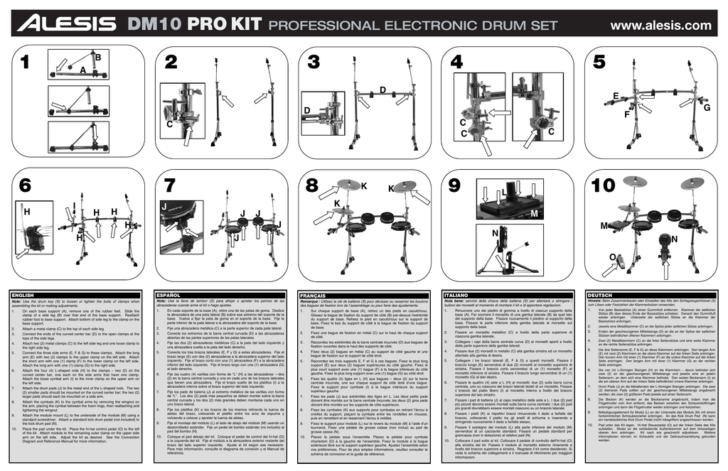 DM10 PRO KIT B 1 2 A www.alesis.com PROFESSIONAL ELECTRONIC DRUM SET 3 4 5 D E D C C C 6 H 7 I H 8 K C 9 10 L K J H K J M J J H H G F M N J N O ENGLISH ESPAÑOL FRANÇAIS ITALIANO DEUTSCH Note: Use the drum key (S) to loosen or tighten the bolts of clamps when assembling the kit or making adjustments. 1. On each base support (A), remove one of the rubber feet. Slide the clamp of a side leg (B) over that end of the base support. Reattach rubber foot to base support. Attach bottom of side leg to the clamp on the base support. 2. Attach a metal clamp (C) to the top of each side leg. 3. Connect the ends of the curved center bar (D) to the open clamps at the tops of the side legs. 4. Attach two (2) metal clamps (C) to the left side leg and one loose clamp to the right side leg. 5. Connect the three side arms (E, F & G) to these clamps. Attach the long arm (E) with two (2) clamps to the upper clamp on the left side. Attach the short arm with one (1) clamp (F) to the lower clamp on the left side. Attach the long arm with one (1) clamp (G) to the right side. 6. Attach the four (4) L-shaped rods (H) to the clamps – two (2) on the curved center bar, one each on the side arms that have one clamp. Attach the loose cymbal arm (I) to the inner clamp on the upper arm on the left side. 7. Attach the drum pads (J) to the metal end of the L-shaped rods. The two (2) smaller pads should be mounted on the curved center bar; the two (2) larger pads should each be mounted on a side arm. 8. Attach the cymbals (K) to the cymbal arms by removing the wingnut on the arm, placing the cymbal between the foam rings, then reattaching and tightening the wingnut. 9. Attach the module mount (L) to the underside of the module (M) using a standard screwdriver. Attach a standard kick drum pedal (not included) to the kick drum pad (N). 10. Place the pad under the kit. Place the hi-hat control pedal (O) to the left of the kit. Attach module to the remaining outer clamp on the upper side arm on the left side. Adjust the kit as desired. See the Connection Diagram and Reference Manual for more information. Nota: Use la llave de tambor (S) para aflojar o apretar los pernos de las abrazaderas cuando arme el kit o haga ajustes. 1. En cada soporte de la base (A), retire una de las patas de goma. Deslice la abrazadera de una pata lateral (B) sobre ese extremo del soporte de la base. Vuelva a fijar la pata de goma en el soporte de la base. Fije la parte inferior de la pata lateral a la abrazadera del soporte de la base. 2. Fije una abrazadera metálica (C) a la parte superior de cada pata lateral. 3. Conecte los extremos de la barra central curvada (D) a las abrazaderas abiertas de las partes superiores de las patas laterales. 4. Fije las dos (2) abrazaderas metálicas (C) a la pata del lado izquierdo y una abrazadera suelta a la pata del lado derecho. 5. Conecte los tres brazos laterales (E, F y G) a estas abrazaderas. Fije el brazo largo (E) con dos (2) abrazaderas a la abrazadera superior del lado izquierdo. Fije el brazo corto con una (1) abrazadera (F) a la abrazadera inferior del lado izquierdo. Fije el brazo largo con una (1) abrazadera (G) al lado derecho. 6. Fije las cuatro (4) varillas con forma de “L” (H) a las abrazaderas —dos (2) en la barra central curvada y una en cada uno de los brazos laterales que tienen una abrazadera. Fije el brazo suelto de los platillos (I) a la abrazadera interna sobre el brazo superior del lado izquierdo. 7. Fije los pads de batería (J) al extremo metálico de las varillas con forma de “L”. Los dos (2) pads más pequeños se deben montar sobre la barra central curvada y los dos (2) más grandes deben montarse cada uno en uno brazo lateral. 8. Fije los platillos (K) a los brazos de los mismos retirando la tuerca de aletas del brazo, colocando el platillo entre los aros de espuma y volviendo a colocar y apretar la tuerca de aletas. 9. Fije el montaje del módulo (L) al lado de abajo del módulo (M) usando un destornillador estándar. Fije un pedal de bombo estándar (no incluido) al pad del bombo (N). 10. Coloque el pad debajo del kit. Coloque el pedal de control del hi-hat (O) a la izquierda del kit. Fije el módulo a la abrazadera exterior restante del brazo del lado superior izquierdo. Ajuste el kit según sea necesario. Para más información, consulte el diagrama de conexión y el Manual de referencia. Remarque : Utilisez la clé de batterie (S) pour dévisser ou resserrer les boulons des bagues de fixation lors de l’assemblage ou pour faire des ajustements. 1. Sur chaque support de base (A), retirez un des pieds en caoutchouc. Glissez la bague de fixation du support de côté (B) par-dessus l'extrémité du support de base. Refixez le pied en caoutchouc sur le support de base. Fixez le bas du support de côté à la bague de fixation du support de base. 2. Fixez une bague de fixation en métal (C) sur le haut de chaque support de côté. 3. Raccordez les extrémités de la barre centrale incurvée (D) aux bagues de fixation ouvertes dans le haut des supports de côté. 4. Fixez deux (2) bagues en métal (C) au support de côté gauche et une bague de fixation sur le support de côté droit. 5. Raccordez les trois supports E, F et G à ces bagues. Fixez le plus long support (E) aux deux (2) bagues supérieures du côté gauche. Fixez le plus court support avec une (1) bague (F) à la bague inférieure du côté gauche. Fixez le plus long support avec une (1) bague (G) au côté droit. 6. Fixez les quatre (4) tiges en L (H) aux bagues – deux (2) sur la barre centrale incurvée, une sur chaque support de côté doté d’une bague. Fixez le support pour cymbale (I) à la bague intérieure du support supérieur gauche. 7. Fixez les pads (J) aux extrémités des tiges en L. Les deux petits pads doivent être montés sur la barre centrale incurvée; les deux (2) gros pads doivent être montés sur les supports de côte supérieurs. 8. Fixez les cymbales (K) aux supports pour cymba