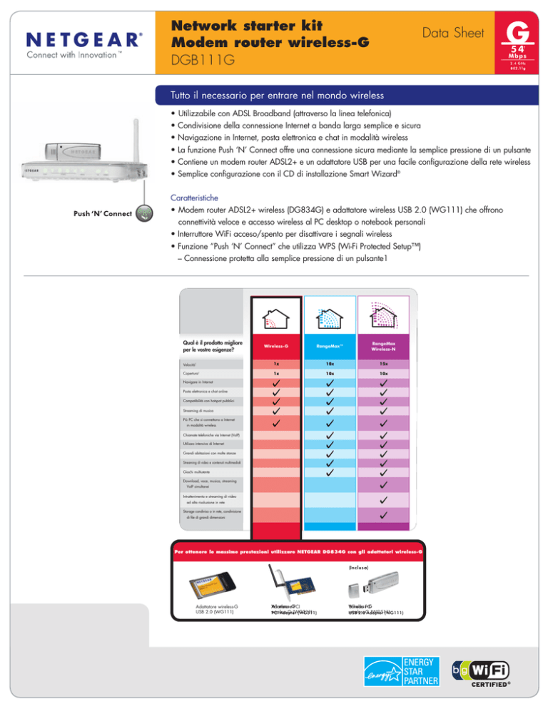 Network starter kit Modem router wireless-G DGB111G Data Sheet 54 M bps Tutto il necessario per entrare nel mondo wireless • Utilizzabile con ADSL Broadband (attraverso la linea telefonica) • Condivisione della connessione Internet a banda larga semplice e sicura • Navigazione in Internet, posta elettronica e chat in modalità wireless • La funzione Push ‘N’ Connect offre una connessione sicura mediante la semplice pressione di un pulsante • Contiene un modem router ADSL2+ e un adattatore USB per una facile configurazione della rete wireless • Semplice configurazione con il CD di installazione Smart Wizard® Caratteristiche • Modem router ADSL2+ wireless (DG834G) e adattatore wireless USB 2.0 (WG111) che offrono connettività veloce e accesso wireless al PC desktop o notebook personali • Interruttore WiFi acceso/spento per disattivare i segnali wireless Modem ADSL2+ • Funzione “Push ‘N’ Connect” che utilizza WPS (Wi-Fi Protected Setup™) integrato – Connessione protetta alla semplice pressione di un pulsante1 Qual è il prodotto migliore per le vostre esigenze? Wireless-G RangeMax™ RangeMax Wireless-N Velocità† 1x 10x 15x Copertura† 1x 10x 10x Navigare in Internet Posta elettronica e chat online Compatibilità con hotspot pubblici Streaming di musica Più PC che si connettono a Internet in modalità wireless Chiamate telefoniche via Internet (VoIP) Utilizzo intensivo di Internet Grandi abitazioni con molte stanze Streaming di video e contenuti multimediali Giochi multiutente Download, voce, musica, streaming VoIP simultanei Intrattenimento e streaming di video ad alta risoluzione in rete Storage condiviso o in rete, condivisione di file di grandi dimensioni Per ottenere le massime prestazioni utilizzare NETGEAR DG834G con gli adattatori wireless-G (I n c l u s a ) Adattatore wireless-G USB 2.0 (WG111) 8JSFMFTT(PCI Adattatore wireless-G (WG311) 1$* "EBQUFS 8( 8JSFMFTT( Scheda PC wireless-G (WG511) 64# "EBQUFS 8( Network star ter kit Modem router wireless-G FASE 1 Seguire le istruzioni della utility di connessione wireless dello Smart Wizard di NETGEAR Specifiche del modem router Requisiti di sistema – Servizio Internet ADSL – Adattatore wireless a 2,4 GHz o adattatore Ethernet e cavo per ciascun computer – Microsoft® Windows® Vista™, XP, 2000, NT, Me, 98 SP2 e altri sistemi operativi che utilizzano una rete TCP/IP – Microsoft® Internet Explorer™ 5.0 o superiore Specifiche fisiche – Dimensioni: 175,3 x 27,94 x 119,4 mm – Peso: 0,3 kg Protocolli di rete – TCP/IP, PPPoE, PPPoA, DNS, DHCP (client e server), RFC 1483 IP statico, IP classico, WMM, WPS e WDS Funzioni – Gestione remota di UPnP™, port range forwarding, exposed host (DMZ), proxy DNS, filtraggio del contenuto dell’URL, allarmi via e-mail, configurazione salvataggio/ripristino, diagnostica, aggiornamenti via Web Interfacce fisiche – Porte LAN: Quattro (4) porte RJ-45 autosensing, Auto Uplink™ 10/100 (incluso un cavo Cat 5 UTP) – Porta WAN: ADSL RJ-11, T1.413, G.DMT, ADSL 2+, ITU Annex A – Wireless: Access point 802.11g a selezione automatica della velocità fino a 54 Mbps DGB111G FASE 2 FASE 3 Premere il pulsante Push ‘N’ Connect del modem router Stabilire la connessione in modo sicuro Sicurezza – Firewall: SPI (Stateful Packet Inspection), logging e reporting delle intrusioni, protezione DoS (Denial-of-Service) – Funzionalità VPN: Supporta fino a cinque (5) endpoint VPN IPsec. Wizard VPN per assistenza nella fase di configurazione della VPN. Funzione di VPN passthrough per IPsec, VPN PPTP e L2TP – Modalità operative: NAT (Network Address Translation), routing statico – Assegnazione dell’indirizzo IP: assegnazione degli indirizzi IP statici, server DHCP interno sulla LAN, client DHCP sulla WAN – Wireless: WPA2-PSK, WPA-PSK, WEP, WPA-802.1x, WPA2-802.1x Tipo di modulazione – 802.11b: Tecnologia DSSS (Direct Sequence Spread Spectrum) (CCK, DQPSK, DBPSK) – 802.11g: Tecnologia OFDM (Orthogonal Frequency Division Multiplexing) (64QAM, 16QAM, QPSK, BPSK) Adattatore di alimentazione – 12 V CC, 1,0 A Contenuto della confezione – Modem router wireless-G (DG834Gv5) – Adattatore wireless-G USB 2.0 (WG111v3) – CD di configurazione/guida di installazione – Adattatore di alimentazione – Cavo Ethernet – Supporto verticale – Cavo telefonico – Cavo USB – Filtro per linea telefonica ADSL – Scheda informativa su garanzia e supporto Specifiche dell’adattatore USB Velocità wireless – 1, 2, 5.5, 6, 9, 11, 12, 18, 24, 36, 48, 54 Mbps (adattamento automatico della velocità), compatibile con 802.11b o 802.11g Frequenza – 2,412 ~ 2,462 GHz (USA) – 2,412 ~ 2,472 GHz (Giappone) – 2,412 ~ 2,472 GHz (Europa ETSI) Codifica – Codifica WEP 64 e 128 bit – WPA-PSK e WPA2-PSK. Funzionalità standard: – PC: Conforme a USB 2.0, Microsoft® Windows® Vista™, XP 64, XP, 2000, Me, o 98SE, standard 802.11g wireless, WMM™, WMM per risparmio energetico Specifiche fisiche – Dimensioni (L x P x H): __94,5 x 30,2 x 15,2 mm – Peso: 32 g Conformità elettromagnetica – FCC Parte 15 Classe B Specifiche ambientali – Temperatura di esercizio: da 0° a 40° C – Umidità di esercizio: massimo 90% di umidità relativa, senza condensa P.zza della Repubblica 32 20124 Milano - Italia Telefono: +39 02 91198001 Fax: +39 02 91198024 www.netgear.it www.netgear.com © 2008 NETGEAR, Inc. NETGEAR, il logo NETGEAR, il logo NETGEAR Digital Entertainer, Connect with Innovation, FrontView, IntelliFi, PowerShift, ProSafe, RAIDar, RAIDiator, X-RAID, RangeMax, ReadyNAS e Smart Wizard sono marchi di fabbrica di proprietà di NETGEAR, Inc. negli Stati Uniti e/o in altre nazioni. Altri nomi di marchi menzionati nel presente documento sono utilizzati solo a scopo identificativo e possono essere marchi dei rispettivi proprietari. Le informazioni fornite possono essere soggette a modifiche senza preavviso. Tutti i diritti riservati. **Le prestazioni reali possono