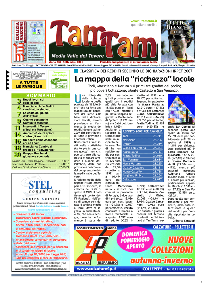 ����������������� ������������������ Anno XIX - Settembre 2008 Periodico Indipendente di informazione locale Redazione: Via I Maggio 2/D TODI (PG) - Tel. 075.8944115 - Fax 075.8944965 - Pubblicità: Stefano Toppetti 340.3130653 - E-mail: [email protected] - Stampa: Litograf Todi - € 0,25 copia - Gratuito CLASSIFICA DEI REDDITI SECONDO LE DICHIARAZIONI IRPEF 2007 POSTE ITALIANE S.P.A TASSA PAGATA - INVII SENZA INDIRIZZO AUT. DR/CBPA/CENTRO1/2089/ISI VALIDA DALL� 11/01/2007 La mappa della “ricchezza” locale � ������ ����������� 3 4 7 9 11 14 16 18 20 Todi, Marsciano e Deruta sui primi tre gradini del podio; più poveri Collazzone, Monte Castello e San Venanzo. SOMMARIO Nuovi lavori sul colle di Todi Marsciano: Alfio Todini candidato a sindaco La casta dei politici dell�Umbria Quanto costano le Comunità Montane Interventi: Il Tevere a Todi e a Marsciano? Ambiente/ Vicini spioni contro gli zozzoni Un poeta come Jacopone chi ce l�ha? Marsciano: Cambio di preside al “Salvatorelli” Gruppi/ Una band giovane e scomoda Notizie Utili – Dalla Regione – Taccuino ...... 6-8-15 Interventi - Lettere - Proteste ................... 11-12-13 Cultura - Sport - Compro e Vendo .......... 17-23-24 na fotografia della ricchezza locale: è quella scattata da “Il Sole 24 ore” che ha fatto una mappatura del benessere del Paese sulla base delle dichiarazioni fiscali, ovvero prendendo a riferimento la media dei redditi denunciati nel 2007 dai contribuenti di tutte le province e i comuni italiani. Nonostante i limiti insiti nelle statistiche (tanto più in una come questa), non ci si può sottrarre alla curiosità di andare a vedere i numeri dell’Umbria, delle due province e dei comuni del comprensorio della media valle del Tevere. Il reddito medio della regione risulta essere pari a 15.337 euro, in crescita del 3,2% rispetto al 1999 (il dato tiene già conto dell’inflazione). Nell’arco di tempo considerato è andata meglio a Terni, dove si segnala un aumento del 4,3%, che non a Perugia, dove la performance è stata del 2,8%. I due capoluo- spetto al 1999) e a ghi di provincia sono 10.470 per abitante. quelli con i redditi Seguono in graduatopiù alti: Perugia con ria Massa Martana: 18.578 euro e Terni 12.910 euro (+ 17,5%) con 17.325, mentre i e 9.085 per abitante; più bassi vengono re- Giano dell’Umbria: gistrati a Monteleone 12.813 euro (+16,9%) di Spoleto (8.729 eu- e 9.050 per abitante; ro) e a Calvi dell’Um- Fratta Todina: 12.428 bria (11.065). euro (+20,8%) e Andiamo a scoprire la REDDITO 2007 PER FAMIGLIA s i t u a z i o n e Todi 26.711 nelle muni- Marsciano 26.706 cipalità delDeruta 26.219 la zona. ToGiano dell’Umbria 24.383 di ha un reddito me- Acquasparta 24.127 dio per con- Fratta Todina 24.010 tribuente di San Venanzo 23.634 14.325 euro 23.265 (in crescita Massa Martana del 27,5% Gualdo Cattaneo 23.111 rispetto al Monte Castello 22.738 1999), pari 21.254 a 10.494 Avigliano Umbro 21.077 euro per Collazzone ciascun abitante. Marsciano, 8.749; C o l l a z z o n e: nella classifica dei 12.330 euro (+20,3%) comuni in provincia e 9.194; Monte Cadi Vi b i o: di Perugia, è due gra- stello dini più sotto: 13.986 12.069 (+24,9%) e euro per contribuen- 8.924; Gualdo Cattate (+21,7%) e 10.067 neo: 10.962 euro per residente. Deruta (+11,9%) e 8.038. conquista il bronzo a Per quanto riguarda i livello territoriale: è comuni del ternano a quota 13.747 euro ricadenti nell’hinterdi reddito (+26% ri- land di TamTam si se- Ognuno ha la faccia che ha, ma qualche volta si esagera. Totò gnala San Gemini (al secondo posto alle spalle di Terni) con 15.894 euro per contribuente (+21,2% rispetto al 1999) e 11.181 per abitante. Otto posizioni più in basso compare Acquasparta: 14.127 euro (+22,6%) e 10.052; a ridosso Montecastrilli (13.304 euro, +17%), mentre più staccati inseguono Avigliano Umbro (12.857 euro, +12,4%) e, ancora più in basso, praticamente appaiate, Baschi (12.538 euro, 27,2%) e San Venanzo (12.528 euro, +27,2%). Dopo quello per contribuente e per residente, altro dato interessante è quello del reddito per famiglia riportato in tabella. Gilberto Santucci Settembre 2008 Todi al 79,5%, Marsciano al 63,3% Il tasso degli ospedali entre è d’attualità il dibattito politico sul ridimensionamento del reparto pediatrico presso l’ospedale di Todi (mettendo con ciò a serio rischio anche il dipartimento per la cura dei disturbi alimentari), sono stati diffusi gli indici di utilizzo delle strutture ospedaliere riferiti al 2006, dai quali emerge che i nosocomi della Usl 2 sono quelli messi peggio dell’intera regione, con quello di Marsciano “maglia nera” con un tasso del 63,3%, il più basso in Umbria. Ma anche al Trasimeno si va dal 72,4% di Castiglione del lago al 68,2% di Città della Pieve. Migliore il risultato di Assisi (74,5%) e di Todi, che con un tasso di utilizzazione del 79,5% si avvicina alla media regionale che è dell’83%. Gli ultimi rilevamenti Istat, che si riferiscono ai dati ufficiali della Regione, pongono in testa in Umbria l’ospedale di Città di Castello, il cui tasso di utilizzazione è pari all’89,4%. Un gradino sotto si colloca l’Azienda ospedaliera di Perugia, che ha un indice pari a 88,2%. Nonostante il buon risultato, la posizione del polo unico di Perugia, in prospettiva, non è del tutto rosea poiché dal 2006 al 2007 ha visto scendere di 493 unità (da 5.428 a 4.935) le degenze di pazienti provenienti da altre regioni, perdendo quest’anno ulteriore mobilità extraregionale. Opposto il trend a Terni, dove gli arrivi da fuori Umbria risultano in costante crescita negli ultimi anni e non solo per l’alta specialità. Si ricoverano al “Santa Maria” pazienti provenienti soprattutto dal Lazio. A Terni l’indice del 2006 era comunque pari all’83,3%. Ilaria Bartoli IL “CORSERA” SULLA SOCIETÀ DEL WIMAX Dietro il velo di 