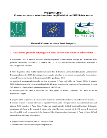 Progetto LIFE+ Conservazione e valorizzazione degli habitat del SIC Spina Verde Piano di Conservazione Post Progetto 1. Andamento generale del progetto e stato di fatto alla chiusura delle attività Il programma LIFE fa parte di una vasta serie di programmi e finanziamenti europei per l’attuazione delle politiche comunitarie (INTERREG, LEADER, etc…); LIFE+ è specificatamente dedicato alla protezione e allo sviluppo dell’ambiente. Il Parco Regionale Spina Verde, riconosciuto come Sito di Interesse Comunitario (SIC) dalla Commissione Europea nel dicembre 2009, ha predisposto un progetto articolato in più azioni, presentato alla Commissione stessa all’interno del Bando di finanziamento LIFE+ per l’anno 2010. Al termine di una dura selezione che ha visto impegnato il Parco e gli uffici tra l’agosto 2010 e il maggio 2011, la Commissione ha riconosciuto la validità del nostro progetto e ha concesso un finanziamento di circa 280.000 euro, a fronte di una spesa complessiva di 560.000 euro. La restante parte dei fondi è assicurata con fondi propri di bilancio, assicurati, tra l’altro, anche da Fondazione Cariplo. Il progetto LIFE ha permesso di valorizzare il patrimonio ambientale del Parco, elevandone la biodiversità. Il termine è ormai comunemente usato e significa “varietà della vita” presente in una determinata area del pianeta. Nello specifico il Parco Spina Verde è un piccolo gioiello di biodiversità nel territorio fortemente urbanizzato di Como e dei comuni di cintura alla città. Qui sono presenti più di 150 specie di vertebrati (uccelli, anfibi, rettili e mammiferi) che danno un’idea di quanto siano importanti il Parco e il suo SIC dal punto di vista faunistico ed ecologico. Il progetto è ufficialmente iniziato il 1 settembre 2011. All’interno dello stesso sono state previste più azioni. La fase propedeutica del progetto è stata relativamente lunga: le tempistiche per le gare pubbliche e le selezioni comparative per la scelta dei professionisti hanno richiesto un certo lasso di tempo tra la data di avvio del progetto (1 settembre 2011) e l’inizio effettivo della fase di progettazione e acquisizione autorizzazioni. In generale, all’inizio della primavera 2012, la fase autorizzativa risultava espletata; nel periodo estivo, durante il quale - per non causare interferenze al ciclo vegetativo e alle tempistiche di riproduzione delle specie faunistiche presenti nel SIC - non è stato possibile effettuare l’avvio delle azioni concrete, sono state espletate le operazioni di gara. Nel rispetto della vigente normativa europea e statale, il Parco si è mosso affinché fossero rispettati i principi di rotazione, proporzionalità ed economicità degli appalti. A luglio 2012 la fase di gara e di aggiudicazione delle azioni concrete era chiusa. Ai sensi della normativa europea sui ricorsi, i contratti sono stati siglati dopo il prescritto periodo di 45 giorni; tale “pausa” è stata comunque funzionale ad attendere, per l’avvio ufficiale dei cantieri, l’inizio della stagione silvana 20122013; in questo modo i lavori non hanno interferito con l’attività vegetativa delle piante e la riproduzione delle specie faunistiche presenti nel Parco. A dicembre 2012, gran parte delle azioni concrete erano avviate (alcune di esse già in avanzata fase di realizzazione e di conclusione). Tutte le azioni, sia quelle concrete che quelle di promozione e disseminazione, si sono concluse il 30.03.2013. Azioni C.1 – C.2. – C.3 Per analogia gli interventi, di tipo prettamente forestale, previsti per le azioni C1-C2-C3 sono stati accorpati in un unico progetto, al fine di razionalizzare l’attività amministrativa in fase di studio, progettazione ed esecuzione. Per quanto riguarda l’azione C1, era previsto di intervenire su un’area totale di 50 ettari, suddivisa su 5 valloni denominati Respaù, Monte Caprino 1, Monte Caprino 2, Monte Croce, Santa Marta (vedasi progetto esecutivo). Le aree occupate dai valloni, all’interno dell’habitat generale, hanno una superficie di circa 5,9 ettari. L’intervento si è svolto come da progetto, con l’impianto di oltre 1.000 nuove piante autoctone, scelte dalle liste dei piani forestali vigenti. Le aree complessivamente oggetto dell’intervento forestale previsto hanno coperto tutti i 5 valloni previsti, così come le superfici anticipate in fase di domanda di contributo, verificate e confermate in fase di progettazione esecutiva. L’azione ha altresì contributo alla creazione di 15 nuove pozze per la riproduzione degli anfibi. Rispetto al progetto originale, in fase di esecuzione, sono state dislocate differentemente, verificata la disponibilità e la presenza maggiore di acqua nei valloni “Respaù” e “Monte Caprino 1”. Ciò al fine di garantire la presenza di acqua costante nel periodo riproduttivo degli anfibi. È comunque rimasto inalterato, rispetto alla domanda di progetto, il numero delle pozze da realizzarsi. I rapporti del monitoraggio faunistico post-progetto commissionati dal Parco rilevano che le pozze sono già state popolate da Salamandra Salamadra, inserita tra le specie anfibie target di progetto. Nelle aree suddette non è stata ancora rilevata la presenza di Rana Latastei, vista la chiusura dei lavori al 30.03.2013: non è stato quindi possibile, per il primo anno, sfruttare il periodo riproduttivo migliore per la specie (febbraio-inizio marzo). Si segnala infine la riqualificazione di alcuni percorsi di accesso alle aree stesse, con la posa di una staccionata a protezione dell’habitat 9180 nel vallone “Monte Caprino 2”. Per quanto riguarda l’azione C2, la domanda di finanziamento prevedeva di intervenire su un area di poco più di 10 ettari, suddivisi sulle sommità degli habitat rocciosi del SIC Spina Verde. L’intervento è stato correttamente effettuato; l’obiettivo di riqualificare le aree sommitali, eliminando nel contempo principi di dissesto idrogeologico, è stato raggiunto. C