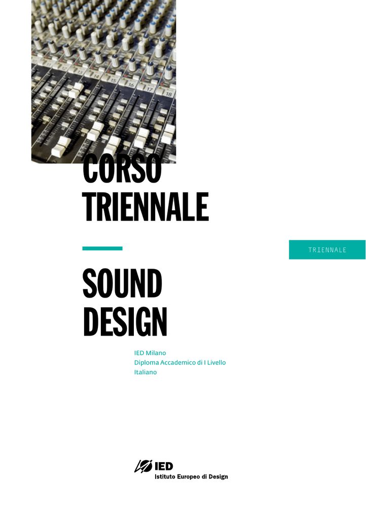 CORSO TRIENNALE — SOUND DESIGN IED Milano Diploma Accademico di I Livello Italiano TRIENNALE 2 - SOUND DESIGN | Visual Communication Diploma Accademico di I Livello IED MILANO IL SUONO È OVUNQUE. ARRICCHISCE LA PERCEZIONE, LA COMPLETA, NE SOTTOLINEA SFUMATURE E TIMBRI. IL SOUND DESIGNER È IL PROFESSIONISTA CHE ORCHESTRA IL SUONO NELLA COMUNICAZIONE. È IL REGISTA DELL’AUDIO. COMPONE SOUNDTRACK, EFFETTI E INSTALLAZIONI SONORE. LA SUA ARTE È DARE FORMA ALL’INVISIBILE. Sound Design www.ied.it/come-iscriversi Diploma Conferito* Indirizzo Coordinatore Frequenza Diploma accademico di I Livello in Nuove Tecnologie dell’Arte Sound Design Painè Cuadrelli Full Time Durata 3 anni Crediti 180 Lingua Italiano Inizio Corso Possibili Studi Superiori 13/10/2015 Diploma accademico di II Livello, Corsi Master, Corsi di Specializzazione e di Formazione Avanzata * Il corso ha valore riconosciuto dal MIUR come Diploma Accademico di I livello equipollente ai Diplomi di Laurea Universitari. 4 IED MILANO Diploma Accademico di I Livello - SOUND DESIGN | Visual Communication Prospettive Professionali — Fabrizio Cecchinelli, Dario Forlani - ITALIAN FEVER - Storia del ballo in Italia IL CONTESTO PROFESSIONALE Il Sound Designer è un “progettista di comunicazione sonora”, un professionista del suono in grado di rapportarsi con le molteplici forme di comunicazione, e di produrre audio utilizzando indifferentemente linguaggi musicali e strumenti di produzione - principalmente il computer, ma anche lo studio di registrazione, il mixer, etc. - per comporre soundtrack, oggetti sonori composti di musica, parlato, effetti sonori e manipolazioni elettroniche. Il sound designer può lavorare in diversi ambiti, dalla pubblicità all’audiovisivo (film, animazione), ai sistemi interattivi (video game, app, piattaforme digitali), ma anche in contesti come esposizioni museali (con installazioni sonore, multimediali e interattive), eventi (sfilate di moda, spettacoli teatrali, eventi commerciali) o progetti legati alla comunicazione. Il sound designer opera in stretta relazione con figure professionali creative e tecniche, come registi, animatori, motion graphic designer, stilisti, direttori creativi, sviluppatori software, designer, ingegneri del suono, artisti visivi, art director e curatori. Sound Designer, Postproduzione audio-video in agenzie di comunicazione, progettazione contenuti audio in eventi live per lo spettacolo e l’arte, web radio, case di produzione televisiva ed emittenti radiofoniche, broadcaster e studi di sviluppo software/applicativi per installazioni interattive, museali, app e video game. IL PERCORSO DI STUDI Nel corso triennale lo studente apprende le diverse strategie di indagine del suono legate all’analisi ambientale, comprendendo la ricerca di sperimentazioni multimediali: dal paesaggio sonoro alla Sound Composition; dall’analisi compositiva legata all’aspetto installativo, dall’interazione con le tecnologie alla Videoarte. Acquisisce inoltre gli strumenti metodologici e critici adeguati all’acquisizione di competenze dei linguaggi espressivi, delle tecniche e delle tecnologie più avanzate, attraverso la sperimentazione artistica dei linguaggi tecnologici e multimediali specifici, in particolare in relazione alle teorie legate alla percezione del suono, alle tecniche di audio e mixaggio, regia, ripresa e montaggio sonoro e in generale alle tecniche di lavorazione e di produzione del suono. Infine trasmette gli adeguati mezzi per conoscere e analizzare il quadro degli eventi storici alla base dell’attuale cultura sonora musicale, del cinema, del video, dello spettacolo e in generale delle teorie e dei linguaggi propri del mondo dei media. In ogni fase formativa, le competenze specifiche di settore sono accompagnate dall’adeguata conoscenza degli strumenti informatici e di comunicazione, dei sistemi socio-economici e aziendali, della cultura e dei linguaggi della comunicazione e dei contesti culturali e di consumo di riferimento, necessari per affrontare il futuro mondo professionale. — E. Piva IED MILANO Diploma Accademico di I Livello - SOUND DESIGN | Visual Communication — E. Piva 6 8 - SOUND DESIGN | Visual Communication Diploma Accademico di I Livello IED MILANO STRUTTURA DEL CORSO Un modello formativo che costruisce valore sul confronto, lo scambio, la relazione tra gli studenti, i docenti e le imprese. Il percorso formativo è articolato in sei semestri, per una durata di tre anni, ognuno dei quali con obiettivi specifici. Il primo anno propedeutico è finalizzato all’acquisizione degli strumenti tecnici, culturali e progettuali di base, alla gestione del flusso creativo e alla ricerca dell’identità. Le attività formative sono dedicate all’acquisizione della strumentazione tecnica fondamentale, di una corretta metodologia progettuale di base e di una solida preparazione culturale. Il secondo anno si configura come un momento di approfondimento, in cui il metodo, gli strumenti acquisiti e gli aspetti culturali vengono sperimentati concretamente, attraverso laboratori di progettazione assistita. Le discipline culturali, economiche e tecniche presenti nel piano di studi, aiutano lo studente ad approfondire e a integrare i contenuti e le fasi realizzative del processo progettuale, permettendogli di acquisire consapevolezza e competenza nelle specifiche aree professionali. Durante il terzo anno specializzante si affrontano argomenti culturali di complessità crescente e si acquisiscono gli ultimi strumenti per l’elaborazione e la comunicazione del progetto. La parte progettuale assume un ruolo preponderante e lo studente impara a gestire autonomamente lo sviluppo di un progetto. In questa fase didattica si inserisce il momento più rilevante del processo formativo, la scelta e lo sviluppo del Progetto di Tesi, in un contesto di simulazione professionale. Entro il terzo anno lo studente iscritto ai corsi erogati in lingua italiana o inglese dovrà dimos