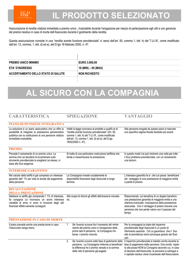 IL PRODOTTO SELEZIONATO Assicurazione di rendita vitalizia immediata a premio unico , rivalutabile durante l’erogazione per mezzo di partecipazione agli utili e con garanzia del premio residuo in caso di morte dell’Assicurato durante il godimento della rendita. Questa assicurazione consiste in una “rendita avente funzione previdenziale” a’ sensi dell’art. 50, comma 1, lett. h) del T.U.I.R., come modificato dall’art. 13, comma, 1, lett. d) ed e), del D.lgs 18 febbraio 2000, n. 47. PREMIO UNICO MINIMO EURO 3.000,00 ETA’ D’INGRESSO 18 (MIN) – 85 (MAX) ACCERTAMENTO DELLO STATO DI SALUTE NON RICHIESTO AL SICURO CON LA COMPAGNIA CARATTERISTICA SPIEGAZIONE VANTAGGIO Infatti la legge riconosce al prodotto a qualifi-ca di “rendita avente funzione previdenziale” (Art. 50, comma 1, lett. h) del T.U.I.R., come modificato dall’art. 13, comma 1, lett. d) ed e), del D.lgs 18/02/2000 n. 47). Alla pensione erogata da questo piano è riservato uno specifico regime fiscale illustrato più avanti. Si tratta di una particolare costruzione tariffaria che tende a massimizzare la prestazione. In questo modo Lei può risolvere una volta per tutte il Suo problema previdenziale, con un versamento una tantum. La Compagnia investe oculatamente le disponibilità finanziarie degli Assicurati a lungo termine. L’interesse garantito fa sì che Lei possa beneficiare del vantaggio di una prestazione di maggiore entità a parità di premio. PIANO DI PENSIONE INTEGRATIVA La soluzione è un piano assicurativo che Le offre la possibilità di integrare la prestazione pensionistica pubblica con la costituzione di una pensione vitalizia immediata rivalutabile. PREMIO Prevede il versamento di un premio unico. La somma che Lei deciderà di accantonare sullo strumento previdenziale la sceglierà Lei stesso, in base alle Sue esigenze. INTERESSE GARANTITO Nel calcolo della tariffa è già compreso un interesse garantito dell’ 1% per tutta la durata del pagamento della pensione. RIVALUTAZIONE DELLA PRESTAZIONE Sebbene la tariffa già comprenda l’ 1% di interesse, Allo scopo di ridurre gli effetti dell’erosione monetalla conpgnia Le riconosce un sovra interesse ria. variabile di anno in anno in funzione degli utili finanziari effetti-vamente conseguiti. Riassumendo, Lei beneficia di un doppio beneficio: una prestazione garantita di maggiore entità e una ulteriore eventuale rivalutazione della prestazione assicurata. Con il vantaggio di potere ricevere una pensione che non perde valore con il passare del tempo. PRESTAZIONE IN CASO DI MORTE Il piano prevede anche una presta-zione in caso l’Assicurato venga meno. 1. 2. Per la compagnia la tutela del risparmio previdenziale degli Assicurati è un punto di riferimento assoluto. Ciò Le garantisce che il Suo atto di previdenza verrà comunque goduto dai Suoi cari. Se l’evento occorre nella fase di godimento della Il risparmio previdenziale è tutelato anche durante la pensione, La Compagnia rimborsa ai beneficiari fase di pagamento della pensione. Una novità rispetla differenza fra il premio versato e la somma to alla prassi NON la Compgnia secondo cui, in caso delle rate di pensione già pagate. di decesso dell’Assicurato, la pensione si estingue e il capitale residuo viene incamerato dall’Assicuratore. Se l’evento occorre fra il momento del versamento del premio unico e l’erogazione della prima rata di pensione, la Compagnia rimborsa il premio ricevuto. AL SICURO CON LA COMPAGNIA CARATTERISTICA RATEAZIONE E DECORRENZA DELLA PENSIONE Il pagamento della pensione viene effettuato in rate mensili posticipate. La prima rata scade a un mese dalla data del contratto. SPIEGAZIONE VANTAGGIO La Compagnia è un grande erogatore di pensioni assicurative e dunque conosce perfettamente che le esigenze delle famiglie italiane si programmano su base men-sile. Con il vantaggio di potere ricevere una pensione che mese per mese integra quella dell’ente pubblico. Tale aspetto è ampiamente compensato dall’esenzione della pensione a ’imposizione IRPEF nella fase di erogazione. Il vantaggio fiscale è spostato alla fase di erogazione della pensione quando maggiore è la valenza del risparmio fiscale. Infatti i redditi finanziari discendenti dalle eventuali rivalutazioni a maturazione anno per anno sono soggetti a ritenuta d’imposta del 20%. Con il vantaggio di non fare cumulo con gli altri redditi, consentendo un vantaggio fiscale di tutto rilievo. REGIME FISCALE DEI PREMI Il premio di questa assicurazione non gode di alcun vantaggio fiscale. REGIME FISCALE DELLE PRESTAZIONI Le rate di pensione non formano reddito imponibile IRPEF. TUTELA DEL RISPARMIO Secondo l’art. 1923 C.C., le somme assicurate sono insequestrabili e impignorabili. In questo modo la legge protegge le prestazioni delle assicurazioni sulla vita. ASSICURATIVO GLI UTILI DELLA COMPAGNIA Utili erogati dal 1990 al 2013 31/12/1990 7,000% 31/12/1998 6,750% 31/12/2006 4,000% 31/12/1991 7,000% 31/12/1999 6,500% 31/12/2007 4,000% 31/12/1992 7,250% 31/12/2000 6,500% 31/12/2008 4,500% 31/12/1993 7,250% 31/12/2001 6,250% 31/12/2009 3,250% 31/12/1994 7,000% 31/12/2002 5,000% 31/12/2010 3,250% 31/12/1995 7,000% 31/12/2003 4,375% 31/12/2011 3,250% 31/12/1996 6,750% 31/12/2004 4,000% 31/12/2012 3,250% 31/12/1997 6,750% 31/12/2005 4,000% 31/12/2013 3,250%