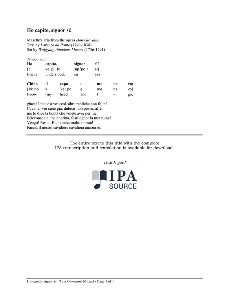 Ho capito, signor sì! Masetto's aria from the opera Don Giovanni Text by Lorenzo da Ponte (1749-1838) Set by Wolfgang Amadeus Mozart (1756-1791) To Giovanni Ho capito, [ ka.pi.to signor sì! I-have understood, sir yes! Chino il capo si.or e si] me ne vo; [ki.no il ka.po e me ne v] I-bow (my) head and I – go; giacché piace a voi così, altre repliche non fo, nò. Cavalier voi siete già, dubitar non posso, affé; me lo dice la bontà che volete aver per me. Bricconaccia, malandrina, fosti ognor la mia ruina! Vengo! Resta! È una cosa molto onesta! Faccia il nostro cavaliere cavaliera ancora te. The entire text to this title with the complete IPA transcription and translation is available for download. Thank you! Ho capito, signor sì! (Don Giovanni) Mozart - Page 1 of 1