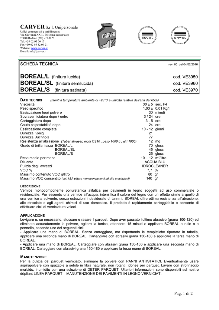 CARVER S.r.l. Unipersonale Uffici commerciali e stabilimento: Via Giovanni XXIII, 36 (zona industriale) 20090 Rodano (MI) - ITALY Tel. +39 02 95 00 171 Fax +39 02 95 32 09 21 Website: www.carver.it E-mail: [email protected] SCHEDA TECNICA rev. 00 del 04/02/2016 BOREAL/L (finitura lucida) BOREAL/SL (finitura semilucida) BOREAL/S (finitura satinata) DATI TECNICI cod. VE3950 cod. VE3960 cod. VE3970 (riferiti a temperatura ambiente di +23°C e umidità relativa dell’aria del 65%) Viscosità Peso specifico Essiccazione fuori polvere Sovraverniciatura dopo / entro Carteggiatura dopo Cauta calpestabilità dopo Essiccazione completa Durezza König Durezza Buchholz Resistenza all'abrasione (Taber abraser, mola CS10 , peso 1000 g , giri 1000) Grado di brillantezza BOREAL/L BOREAL/SL BOREAL/S Resa media per mano Diluente Pulizia degli attrezzi VOC % Massimo contenuto VOC g/litro Massimo VOC consentito (cat. i BA pitture monocomponenti ad alte prestazioni) 30 ± 5 sec. F4 1,03 ± 0,01 Kg/l 30 minuti 3 / 24 ore 3 - 5 ore 24 ore 10 - 12 giorni 21 77 12 mg 70 gloss 45 gloss 25 gloss 2 10 – 12 m /litro ACQUA BLU IDROCLEANER 7,7 % 80 g/l 140 g/l DESCRIZIONE Vernice monocomponente poliuretanica alifatica per pavimenti in legno soggetti ad uso commerciale o residenziale. Pur essendo una vernice all’acqua, intensifica il colore del legno con un effetto simile a quello di una vernice a solvente, senza estrazioni indesiderate di tannini. BOREAL offre ottima resistenza all’abrasione, alle strisciate e agli agenti chimici di uso domestico. Il prodotto è rapidamente carteggiabile e consente di effettuare cicli di verniciatura veloci. APPLICAZIONE Levigare e, se necessario, stuccare e rasare il parquet. Dopo aver passato l’ultimo abrasivo (grana 100-120) ed eliminato accuratamente la polvere, agitare la tanica, attendere 15 minuti e applicare BOREAL a rullo o a pennello, secondo uno dei seguenti cicli: - Applicare una mano di BOREAL. Senza carteggiare, ma rispettando le tempistiche riportate in tabella, applicare una seconda mano di BOREAL. Carteggiare con abrasivi grana 150-180 e applicare la terza mano di BOREAL. - Applicare una mano di BOREAL. Carteggiare con abrasivi grana 150-180 e applicare una seconda mano di BOREAL. Carteggiare con abrasivi grana 150-180 e applicare la terza mano di BOREAL. MANUTENZIONE Per la pulizia del parquet verniciato, eliminare la polvere con PANNI ANTISTATICI. Eventualmente usare aspirapolvere con spazzole a setole in fibra naturale, non rotanti, idonee per parquet. Lavare con strofinaccio morbido, inumidito con una soluzione di DETER PARQUET. Ulteriori informazioni sono disponibili sul nostro dépliant LINEA PARQUET – MANUTENZIONE DEI PAVIMENTI IN LEGNO VERNICIATI. Pag. 1 di 2 CARVER S.r.l. Unipersonale Uffici commerciali e stabilimento: Via Giovanni XXIII, 36 (zona industriale) 20090 Rodano (MI) - ITALY Tel. +39 02 95 00 171 Fax +39 02 95 32 09 21 Website: www.carver.it E-mail: [email protected] AVVERTENZE • • • • • • • • • Il prodotto è stato formulato con resine incompatibili con la maggior parte degli altri sistemi vernicianti all’acqua esistenti sul mercato. E’ quindi molto importante utilizzare rulli e pennelli dedicati ed evitare di mescolare BOREAL con altri prodotti. Si raccomanda di acclimatare ed applicare il prodotto ad una temperatura compresa tra +15°C e +35°C, con umidità relativa tra 35% e 70%. Verificare che il legno non abbia un’umidità superiore al 10%. Prima dell’uso agitare energicamente la tanica e attendere per 15 minuti. Durante i mesi caldi, per migliorare la distensione della vernice, è opportuno aggiungere circa il 5-10% di diluente ACQUA BLU o di acqua demineralizzata. Si consiglia comunque di non applicare il prodotto nelle ore più calde del giorno e di evitare assolutamente il sole battente sulla superficie appena verniciata. Rispettare sempre i tempi di carteggiabilità e di sovrapplicabilità prescritti. Dopo ogni carteggiatura eliminare accuratamente la polvere. Per carteggiare non usare mai abrasivi con grana superiore alla 180. Per la pulizia degli attrezzi utilizzare IDROCLEANER o, in mancanza di questo, acqua, meglio se tiepida. La superficie trattata è pedonabile con cautela dopo 24 ore e raggiunge le ottimali resistenze meccaniche dopo 10 - 12 giorni. TEME IL GELO! Non gettare eventuali residui nel terreno o nelle fognature! Il prodotto si conserva per 12 mesi, se immagazzinato in luogo fresco e asciutto, nel contenitore originale non aperto. N.B.: Le informazioni contenute nella presente scheda tecnica sono elaborate sulla base delle nostre migliori esperienze e conoscenze, e si intendono fornite senza alcuna garanzia, poiché le modalità e condizioni di impiego del prodotto sono al di fuori del nostro controllo. Pag. 2 di 2