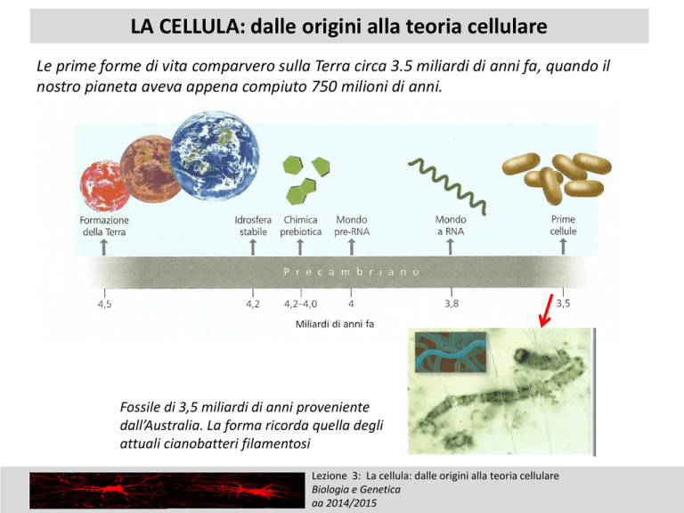 LA CELLULA: dalle origini alla teoria cellulare Le prime forme di vita comparvero sulla Terra circa 3.5 miliardi di anni fa, quando il nostro pianeta aveva appena compiuto 750 milioni di anni. Fossile di 3,5 miliardi di anni proveniente dall’Australia. La forma ricorda quella degli attuali cianobatteri filamentosi Lezione 3: La cellula: dalle origini alla teoria cellulare Biologia e Genetica aa 2014/2015 La comparsa delle prime cellule (protocellule) La vita (per come la conosciamo) è separata dall’ambiente in unità strutturalmente definite, le cellule Il contenuto interno della cellula è separata dall’esterno da una barriera, detta membrana Le prime cellule che «videro» il mondo: i Procarioti Dalle prime protocellule si evolvettero verosimilmente i primi Procarioti Nelle prime cellule il materiale genetico era disperso nel citoplasma, senza l’esistenza di una membrana che lo separasse a formare il nucleo La definizione di Procariote deriva dalle osservazioni microscopiche del XX secolo, quando i biologi furono in grado di descrivere due tipi fondamentali di organizzazione cellulare. Una più semplice, tipica delle cellule batteriche, e una più complessa che caratterizzava le cellule di tutti gli altri organismi (animali, piante, funghi, alghe e protozoi). Vennero così distinti Procarioti (dal greco pro- = “precedente” e Karion = “nucleo”) Eucarioti. (dal greco eu- = “autentico” e Karion = “nucleo”). La cellula procariotica I Procarioti oggi: Batteri e Archei Oggi, grazie all’avvento delle tecniche di biologia molecolare (comparazione delle sequenze di DNA, RNA e proteine), i Procarioti, che comprendono tutti i vari tipi di batteri, sono suddivisi in due grandi gruppi, gli Archaebacteria e gli Eubacteria (Carl Woese). Il gruppo Bacteria comprende la maggior parte degli organismi a singola cellula, privi di nucleo. Sono le forme che si incontrano più comunemente, i batteri. - Importantissimi per gli equilibri ecologici - Funzioni sia positive che negative per l’uomo Esempi: - Escherichia coli è un batterio che vive nell’intestino e che è essenziale per la corretta digestione del cibo; la sua presenza nelle acque superficiali (fiumi, laghi, mari) o nelle acque potabili, indica la presenza di un inquinamento di tipo fecale. - Streptococcus pneumoniae è il principale responsabile dell’insorgenza delle polmoniti L’ agente eziologico della meningite meningococcica è un batterio, Neisseria meningitidis Gli Archaea sono un gruppo di organismi a noi meno famigliari. Vivono in genere in ambienti estremi - i termoacidofili vivono nelle sorgenti sulfuree calde, con temperature fino a 100°C e gradi di acidità fino a pH 2; - i metanogeni convertono l’anidride carbonica in metano; - gli alofili possono crescere in condizioni saline estremamente Un particolare termoacidofilo, Thermus aquaticus, ha consentito la scoperta della PCR (Polimerase Chain Reaction), che consente di amplificare i frammenti di DNA. T. aquaticus contiene un enzima specifico (una DNA polimerasi) capace di lavorare a temperature estremamente alte. Questo enzima oggi utilizzato in tutti i laboratori di biologia molecolare è la Taq polimerasi. Forme e strutture delle cellule di Batteri e Archeobatteri I procarioti presentano diverse forme Le cellule procariotiche sono prive di organelli circondati da membrana La superficie è rivestita da una parete cellulare Alcuni batteri formano endospore Molti batteri sono mobili Origine delle cellule eucariotiche e teoria dell’endosimbiosi Nel 1905 il botanico russo Constantin Mereschkowsky ipotizzò l’origine endosimbiotica del nucleo e dei cloroplasti delle cellule vegetali. Nei decenni successivi tuttavia questa teoria non trovò più seguito. Solo negli anni ’60 riprese vigore con la pubblicazione del lavoro scientifico “On the origin of mitosing cells” della biologa americana Lynn Margulis, che riproponeva la teoria endosimbiotoca per spiegare la formazione degli organuli della cellula eucariote. Prima di essere pubblicato sul Journal of Theoretical Biology nel 1967, questo lavoro venne rifiutato da ben 15 riviste scientifiche. Come disse Richard Dawkins, uno dei più grandi studiosi di evoluzione del XX secolo, Lynn Margulis, con la teoria per cui una cellula eucariote è il risultato dell’unione simbiotica tra cellule procarioti primitive, trasformò un concetto totalmente rifiutato dagli scienziati del tempo in un’idea ortodossa per i contemporanei, contribuendo alla biologia evoluzionistica con una delle più grandi conquiste del XX secolo. Come si è arrivati alla formulazione della teoria cellulare? … un principio unificante della biologia Nel 1590 due olandesi costruttori di occhiali, Zacharias e Hans Janssen, misero a punto il primo microscopio ottico composto Nel 1665 il fisico inglese R. Hooke utilizzò il termine «cellulae» per indicare le cellette del sughero osservate con il suo microscopio Negli stessi anni un commerciante olandese – naturalista per passione – Anton Van Leeuwenhoek osservò con il suo microscopio e descrisse gli animalcules (verosimilmente protozoi) in alcune gocce di acqua stagnante Nel 1830 il chirurgo scozzese, botanico per passione, Robert Brown scoprì che tutte le cellule delle piante avevano all’interno una struttura circolare che chiamò nucleus (diminutivo del latino nux= noce). Scoprì quindi il nucleo Nel 1838 il botanico tedesco Matthias Schleiden affermò che tutti i tessuti delle piante erano costituiti da cellule e che qualsiasi pianta nasceva da una singola cellula Contemporaneamente, studiando i tessuti animali, lo zoologo tedesco Theodor Schwann giunse alle stesse conclusioni di Schleiden e formulò i principi basilari della teoria cellulare: 1. La cellula è l’unità base della struttura di tutti gli organismi (ovvero è l’unità fondamentale della vita) 2. Tutti gli organismi consistono di una o più cellule Tuttavia ai tempi di Schleiden e Schwann vigeva ancora l