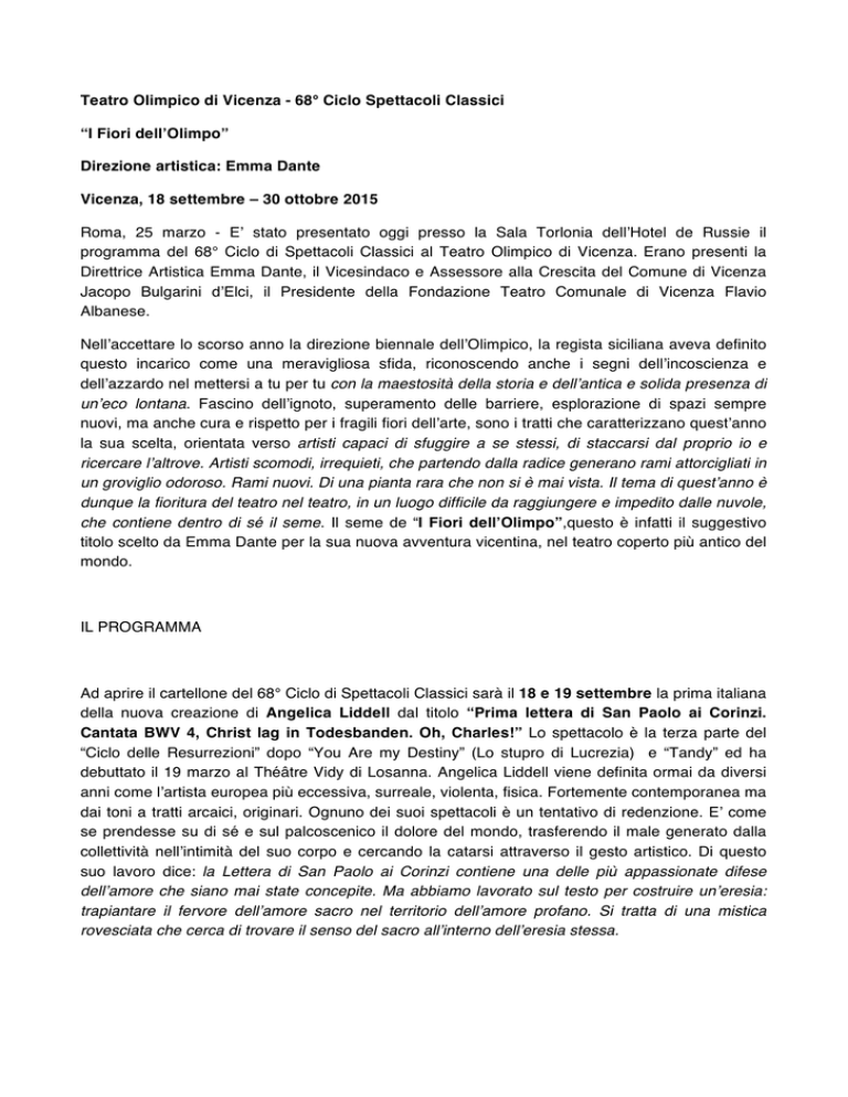 Teatro Olimpico di Vicenza - 68° Ciclo Spettacoli Classici “I Fiori dell’Olimpo” Direzione artistica: Emma Dante Vicenza, 18 settembre – 30 ottobre 2015 Roma, 25 marzo - E’ stato presentato oggi presso la Sala Torlonia dell’Hotel de Russie il programma del 68° Ciclo di Spettacoli Classici al Teatro Olimpico di Vicenza. Erano presenti la Direttrice Artistica Emma Dante, il Vicesindaco e Assessore alla Crescita del Comune di Vicenza Jacopo Bulgarini d’Elci, il Presidente della Fondazione Teatro Comunale di Vicenza Flavio Albanese. Nell’accettare lo scorso anno la direzione biennale dell’Olimpico, la regista siciliana aveva definito questo incarico come una meravigliosa sfida, riconoscendo anche i segni dell’incoscienza e dell’azzardo nel mettersi a tu per tu con la maestosità della storia e dell’antica e solida presenza di un’eco lontana. Fascino dell’ignoto, superamento delle barriere, esplorazione di spazi sempre nuovi, ma anche cura e rispetto per i fragili fiori dell’arte, sono i tratti che caratterizzano quest’anno la sua scelta, orientata verso artisti capaci di sfuggire a se stessi, di staccarsi dal proprio io e ricercare l’altrove. Artisti scomodi, irrequieti, che partendo dalla radice generano rami attorcigliati in un groviglio odoroso. Rami nuovi. Di una pianta rara che non si è mai vista. Il tema di quest’anno è dunque la fioritura del teatro nel teatro, in un luogo difficile da raggiungere e impedito dalle nuvole, che contiene dentro di sé il seme. Il seme de “I Fiori dell’Olimpo”,questo è infatti il suggestivo titolo scelto da Emma Dante per la sua nuova avventura vicentina, nel teatro coperto più antico del mondo. IL PROGRAMMA Ad aprire il cartellone del 68° Ciclo di Spettacoli Classici sarà il 18 e 19 settembre la prima italiana della nuova creazione di Angelica Liddell dal titolo “Prima lettera di San Paolo ai Corinzi. Cantata BWV 4, Christ lag in Todesbanden. Oh, Charles!” Lo spettacolo è la terza parte del “Ciclo delle Resurrezioni” dopo “You Are my Destiny” (Lo stupro di Lucrezia) e “Tandy” ed ha debuttato il 19 marzo al Théâtre Vidy di Losanna. Angelica Liddell viene definita ormai da diversi anni come l’artista europea più eccessiva, surreale, violenta, fisica. Fortemente contemporanea ma dai toni a tratti arcaici, originari. Ognuno dei suoi spettacoli è un tentativo di redenzione. E’ come se prendesse su di sé e sul palcoscenico il dolore del mondo, trasferendo il male generato dalla collettività nell’intimità del suo corpo e cercando la catarsi attraverso il gesto artistico. Di questo suo lavoro dice: la Lettera di San Paolo ai Corinzi contiene una delle più appassionate difese dell’amore che siano mai state concepite. Ma abbiamo lavorato sul testo per costruire un’eresia: trapiantare il fervore dell’amore sacro nel territorio dell’amore profano. Si tratta di una mistica rovesciata che cerca di trovare il senso del sacro all’interno dell’eresia stessa. Il 26 e 27 settembre Emma Dante presenterà al pubblico di Vicenza il lavoro degli allievi della scuola delle arti e dello spettacolo che dirige da un anno presso il Teatro Biondo di Palermo. I giovani si confronteranno con lo spazio scenico realizzato dallo Scamozzi nel 1585, rimasto intatto fino ad oggi, lavorando su “Odissea – movimento n. 1”, un testo liberamente tratto dal poema di Omero e incentrato sull’attesa del ritorno di Odisseo e sulla consapevolezza di Telemaco del necessario passaggio all’età adulta. L’Eroe è partito da 20 anni alla conquista di Troia. I Proci occupano la reggia di Itaca in attesa della resa di Penelope. Le giornate si susseguono tra banchetti, musica e schiamazzi mentre la speranza di veder tornare Odisseo si affievolisce sempre più. Un figlio, l’attesa del padre, il ritorno, l’origine. Tutto diventa metafora del viaggio di ogni essere umano verso la conoscenza. Quindi il 2 e 3 ottobre un’altra prima italiana: “Primal Matter” di Dimitris Papaioannou. Performer, artista visivo, disegnatore e soprattutto coreografo, Papaioannou è figura di punta della danza contemporanea greca. Si è fatto conoscere fuori dai confini nazionali quando nel 2004 gli fu affidata la cerimonia di apertura (un omaggio al Dio Apollo) e di chiusura (sul mito di Dioniso) dei Giochi Olimpici di Atene. Di grande impatto estetico, Primal Matter è una pièce per due danzatori. Il corpo umano viene qui usato come un campo di battaglia, afferma il coreografo. Tento di farlo a pezzi per poi rimontarlo di nuovo e portare alla luce le tematiche che circondano il mistero dell'esistenza. Il dialogo tra il corpo vestito e quello nudo stimola l'immaginazione visiva ... Volevo un nudo che fosse libero dalla vergogna della nudità come dal narcisismo della consapevolezza erotica. Un nudo precristiano, anche se i suoi movimenti in scena evocano spesso immagini religiose. E sempre il corpo è il protagonista scenico il 9 e 10 ottobre del nuovo allestimento di “Eumenidi” che Vincenzo Pirrotta ha pensato per Vicenza rispetto allo spettacolo da lui realizzato nel 2004 per la Biennale di Venezia. Allievo del maestro Mimmo Cuticchio, Vincenzo Pirrotta ha lavorato con i più grandi registi ed attori del teatro italiano. Dal 1996 conduce una personale ricerca sulle tradizioni popolari, innestando rituali arcaici al teatro di sperimentazione. In questa nuova versione per il Teatro Olimpico, protetto dall’Unesco per la sua stupefacente architettura palladiana, Pirrotta ha inserito i risultati di una sua ricerca sul blues applicato alle vocalità popolari. Alcune parti saranno così, come dice lui stesso, cuntate attraverso questa nuova forma di blues arcaico. Verranno anche utilizzati i modi gergali della zona di Alcamo, che è stata la culla del volgare italiano, mentre il “baccàghiu”, una sorta di argot della malavita siciliana, sarà il colore delle parole delle Erinni. Il 16 e 17 ottobre è la volta del reg