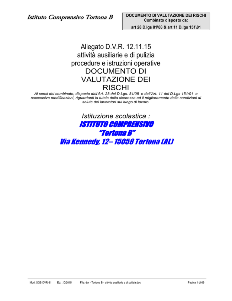 Istituto Comprensivo Tortona B DOCUMENTO DI VALUTAZIONE DEI RISCHI Combinato disposto da: art 28 D.lgs 81\08 & art 11 D.lgs 151\01 Allegato D.V.R. 12.11.15 attività ausiliarie e di pulizia procedure e istruzioni operative DOCUMENTO DI VALUTAZIONE DEI RISCHI Ai sensi del combinato, disposto dall’Art. 28 del D.Lgs. 81/08 e dell’Art. 11 del D.Lgs 151/01 e successive modificazioni, riguardanti la tutela della sicurezza ed il miglioramento delle condizioni di salute dei lavoratori sul luogo di lavoro. Istituzione scolastica : ISTITUTO COMPRENSIVO “Tortona B” Via Kennedy, 12– 15058 Tortona (AL) Mod. SGS-DVR-81 Ed: .10/2015 File: dvr - Tortona B - attività ausiliarie e di pulizia.doc Pagina 1 di 69 Istituto Comprensivo Tortona B DOCUMENTO DI VALUTAZIONE DEI RISCHI Combinato disposto da: art 28 D.lgs 81\08 & art 11 D.lgs 151\01 Sommario 1. 2. 3. 4. 5. Pulizia dei locali ........................................................................................................................................................ 3 1.1. Premessa ...................................................................................................................................................... 3 1.2. Indicazioni operative e frequenza delle attività .............................................................................................. 3 1.3. Disposizioni generali attività di pulizia............................................................................................................ 4 1.3.1. Disposizioni particolari per le pavimentazioni in vinilamianto .................................................................... 5 1.4. caratteristiche DPI utilizzati ........................................................................................................................... 6 1.5. Procedura di lavaggio .................................................................................................................................... 7 1.6. Sequenza di lavaggio .................................................................................................................................. 11 1.7. Rischi elettrici negli ambienti. ...................................................................................................................... 12 Scale Portatili .......................................................................................................................................................... 13 2.1. Campo di applicazione ................................................................................................................................ 13 2.2. Disposizioni generali ................................................................................................................................... 15 Movimentazione manuale dei carichi: ..................................................................................................................... 21 3.1. Attività di spinta e tiro: Definizioni ................................................................................................................ 21 3.2. Misure di Prevenzione e Protezione dai Rischi ............................................................................................ 21 3.3. Elementi di riferimento per l’individuazione di rischi ..................................................................................... 22 3.4. Modelli, procedure e criteri di valutazione .................................................................................................... 23 3.5. Attività eventuale del Medico Competente ................................................................................................... 25 3.6. Norme generali di sicurezza ........................................................................................................................ 25 3.7. Precauzioni operative .................................................................................................................................. 27 3.8. Analisi delle condizioni di lavoro .................................................................................................................. 28 3.9. Analisi degli elementi di riferimento per l’Individuazione di rischi ................................................................. 28 3.10. Attività di spinta e tiro .................................................................................................................................. 30 3.11. Metodologia di valutazione .......................................................................................................................... 31 Rischio chimico attività di pulizia ............................................................................................................................. 34 4.1. Classificazione sostanze pericolose -, Frasi H, Frasi P ............................................................................... 34 4.1.1. Tabelle di comparazione tra il precedente sistema di classificazione Europeo ed il nuovo sistema GHSCLP 34 4.2. Valutazione della durata di esposizione....................................................................................................... 37 4.3. Valutazione del livello di esposizione .......................................................................................................... 37 4.4. Risultati della valutazione del rischio chimico .............................................................................................. 38 4.4.1. New Fador Ammoniaca Marsiglia con detergente .................................................................................. 39 4.4.2. New Fador Ammoniaca profumata con detergente ................................................................................ 40 4.4.3. New Fador Candeggina gel igienizzante ................................................................................................ 41 4.4.4. New Fador Candeggina gel ....