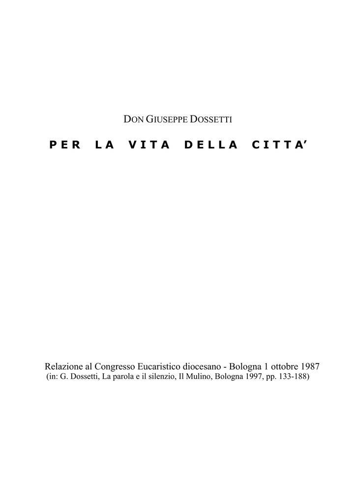 DON GIUSEPPE DOSSETTI PER LA VITA DELLA C I T T A’ Relazione al Congresso Eucaristico diocesano - Bologna 1 ottobre 1987 (in: G. Dossetti, La parola e il silenzio, Il Mulino, Bologna 1997, pp. 133-188) PREMESSA 1. Il salmo 80/81, 11: «Io sono Jahve, tuo Dio, che ti ho fatto uscire dalla terra d’Egitto. Spalanca la tua bocca ed io te la riempirò»: letto nella prospettiva della fede esodica. Nel salmo 80/81, al v. 11, Dio proclama a tutto il suo popolo: «Io sono il Signore, tuo Dio, che ti ho fatto uscire dalla terra d’Egitto. Spalanca la tua bocca ed io te la riempirò». Secoli di interpretazione ebraica hanno univocamente individuato il senso di queste parole. Già il Targum traduce: «Io il Signore <sono> il tuo Dio, che ti ha portato in alto dalla terra d’Egitto; apri la tua bocca nelle parole della Legge e ti riempirò di ogni bene». In pieno medioevo David ben Joseph Kimhi (Radaq) parafrasa: «Riconosci la mia esistenza e ricorda il bene che ti ho fatto quando ti ho fatto uscire dalla terra d’Egitto. Apri la tua bocca a chiedere e sazierò ogni tua domanda, se mi obbedirai non avrai più né fame né sete». Nel secolo scorso Samson ben Raphael Hirsch : «Io sono colui che ti ha portato non solo fuori, ma al di sopra della terra d’Egitto. Con il vostro esodo Egli ha voluto guidarvi al di sopra, a un livello spirituale e morale altro. Dice il Signore: se tu vuoi davvero combattere per raggiungere questo livello, allora apri la tua bocca, tu devi estendere i tuoi desideri tanto ampiamente quanto ti piace ed essere certo che Io li esaudirò. Allora tu non avrai più bisogno di far dipendere nessuna parte della tua vita - o di credere che essa dipenda - da un altro potere diverso da Me». Altrettanto dicono gli interpreti ebraici contemporanei. Normalmente i biblisti non ebraici danno rilievo in questo versetto al credo esodico e all’aprire la bocca per proclamare la Parola di Dio, e alla conseguente fedeltà all’alleanza, ma qualcuno accenna anche a un’intenzione di un significato più specifico, vedendo «come una continuità fra i cibi miracolosi del deserto e le messi feconde con cui la Palestina ricompenserà la fedeltà di Israele». E in questo senso il salmo avrebbe anche un rapporto diretto con la manna e quindi, in una lettura neotestamentaria, con l’Eucaristia. Ma anche se non si vuole giungere a questo, il salmo dice l’orizzonte in cui l’Eucaristia viene da noi considerata: cioè esclusivamente l’orizzonte della fede, e precisamente della fede in un Dio personale che dice «Io» e che ha compiuto un suo grande atto di liberazione, non solo esteriore (dal faraone), ma anche interiore e spirituale («dagli dèi dell’Egitto»: cfr. Es 12, 12). 2. L’orizzonte di fede di questa conversazione: non osta il pluralismo delle prospettive della città odierna. Non osta a questa mia impostazione l’attuale pluralismo della città. Anzi, proprio per questo, e a maggior ragione, mi pare che - specialmente in certi momenti più alti come questa conclusione di un congresso eucaristico - sia diritto e dovere del credente di esporre ciò che è proprio della sua fede, nel puro linguaggio della Rivelazione, senza cercare impraticabili concordismi. 4 E c’è anche un diritto del non credente di sentirsi esporre il messaggio cristiano puro ed integro, conservando poi evidentemente tutta la sua libertà di accettarlo o di rifiutarlo, non per quello che vorrebbe apparire, ma per quello che esso è. S. Pietro nella sua prima lettera dice che «dobbiamo rendere ragione della speranza che è in noi»: - con franchezza (e quindi senza riserve timide o scaltre) - con dolcezza e rispetto verso tutti gli uomini - con retta coscienza (1 Pt 3, 15-16) e perciò: - senza tendenzialità, in modo che sia universalmente valido per ogni cristiano, e non per qualche vocazione particolare (come sarebbe per esempio per quella monastica); - senza accentuazioni di momenti e di interpretazioni in senso o troppo escatologico profetico, o per contro in senso dell’impegno e della presenza responsabile nella storia, nel sociale e nel politico; - e infine senza negare valore al confronto, anzi cercandolo con passione infinita, ma fondandolo, ciascuno per la sua parte, nelle proprie radici più autentiche ed essenziali, e quindi conquistandosi per il resto spazi di tanto maggior libertà, per quelle convergenze etiche, da molti auspicate, per la salvezza anche storica della società e della civiltà. 5