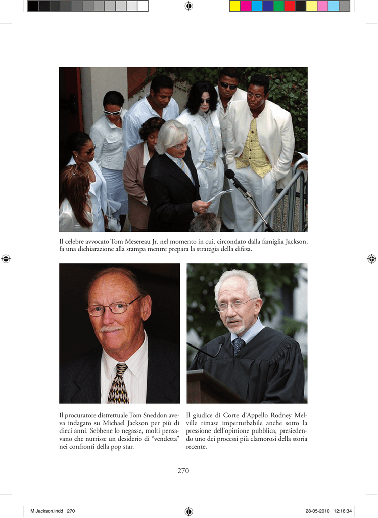 Il celebre avvocato Tom Mesereau Jr. nel momento in cui, circondato dalla famiglia Jackson, fa una dichiarazione alla stampa mentre prepara la strategia della difesa. Il procuratore distrettuale Tom Sneddon aveva indagato su Michael Jackson per più di dieci anni. Sebbene lo negasse, molti pensavano che nutrisse un desiderio di “vendetta” nei confronti della pop star. Il giudice di Corte d’Appello Rodney Melville rimase imperturbabile anche sotto la pressione dell’opinione pubblica, presiedendo uno dei processi più clamorosi della storia recente. 270 M.Jackson.indd 270 28-05-2010 12:16:34 Jackson accompagnato dalle guardie del corpo, dagli avvocati e dal padre Joe in quello che sarebbe diventato il famigerato “Giorno del Pigiama”. 271 M.Jackson.indd 271 28-05-2010 12:16:35 Quando Michael Jackson decise di cambiare avvocati, si rivolse a Johnnie Cochran. A quanto si dice, fu Cochran a ritenere che Tom Mesereau fosse l’uomo adatto. La star televisiva George Lopez dichiarò davanti alla giuria di essere stato amico di Gavin Arvizo e di essere andato a trovarlo in ospedale mentre si sottoponeva alla chemioterapia. Durante il controinterrogatorio, Lopez ammise che la sua amicizia con la famiglia Arvizo era finita quando il padre di Gavin era diventato avido e affamato di quattrini. Debbie Rowe, ex moglie di Jackson e madre di due dei suoi figli, testimoniò per l’accusa. Alla sbarra, si sciolse in lacrime parlando di quanto Michael fosse sempre stato un buon padre. Infuriato per le allusioni sessuali fatte dai media rispetto ai suoi rapporti con Jackson, Macaulay Culkin (protagonista di Mamma, ho perso l’aereo) nella sua testimonianza si disse felice di essere amico di Michael da tutta la vita. 272 M.Jackson.indd 272 28-05-2010 12:16:37 Larry King, anchorman della cnn, testimoniò in assenza della giuria. Il noto conduttore di talk show dichiarò che l’avvocato degli Arvizo gli aveva detto che la madre di Gavin era interessata solo al denaro. Il giudice non consentì che la sua testimonianza fosse messa agli atti. Jay Leno, superstar televisiva, andò alla sbarra e disse che Gavin Arvizo aveva telefonato alla redazione del suo programma (The Tonight Show) chiedendo di avere un colloquio a quattr’occhi con lui. Leno disse di aver richiamato Gavin e di avere parlato con lui al telefono, dicendo che gli era sembrato “eccessivamente loquace” e “attento alle parole”. L’attore comico Chris Tucker si rivelò un testimone chiave per la difesa. La star di Rush Hour era stato amico di Gavin e della sua famiglia, ma in seguito aveva messo in guardia Jackson nei loro confronti. In aula disse di ritenere che Gavin fosse “furbo”. Nancy Grace, conduttrice televisiva, diede un enorme impulso alla propria carriera usando il processo Jackson per lanciare il suo nuovo show sulla cnn. Molti ritengono che – essendo Grace a favore dell’accusa – la sua copertura del processo sia stata distorta e di parte. 273 M.Jackson.indd 273 28-05-2010 12:16:39 Il team della difesa di Jackson. Da sinistra: Tom Mesereau Jr., Robert Sanger, Susan Yu e Jesus Castillo. Qui stanno aspettando l’arrivo di Michael il giorno del verdetto. In seguito Tom Mesereau dichiarò alla stampa: “Giustizia è fatta.” Alcuni membri della giuria felici dopo la lettura del verdetto. In seguito due dei giurati dissero di aver votato per l’assoluzione dietro coercizione. Ma i ben informati ritennero che i due stessero solo cercando di ottenere un profitto dal processo, soprattutto quando i media rivelarono che entrambi stavano trattando con vari editori la possibilità di scrivere un memoriale. 274 M.Jackson.indd 274 28-05-2010 12:16:41