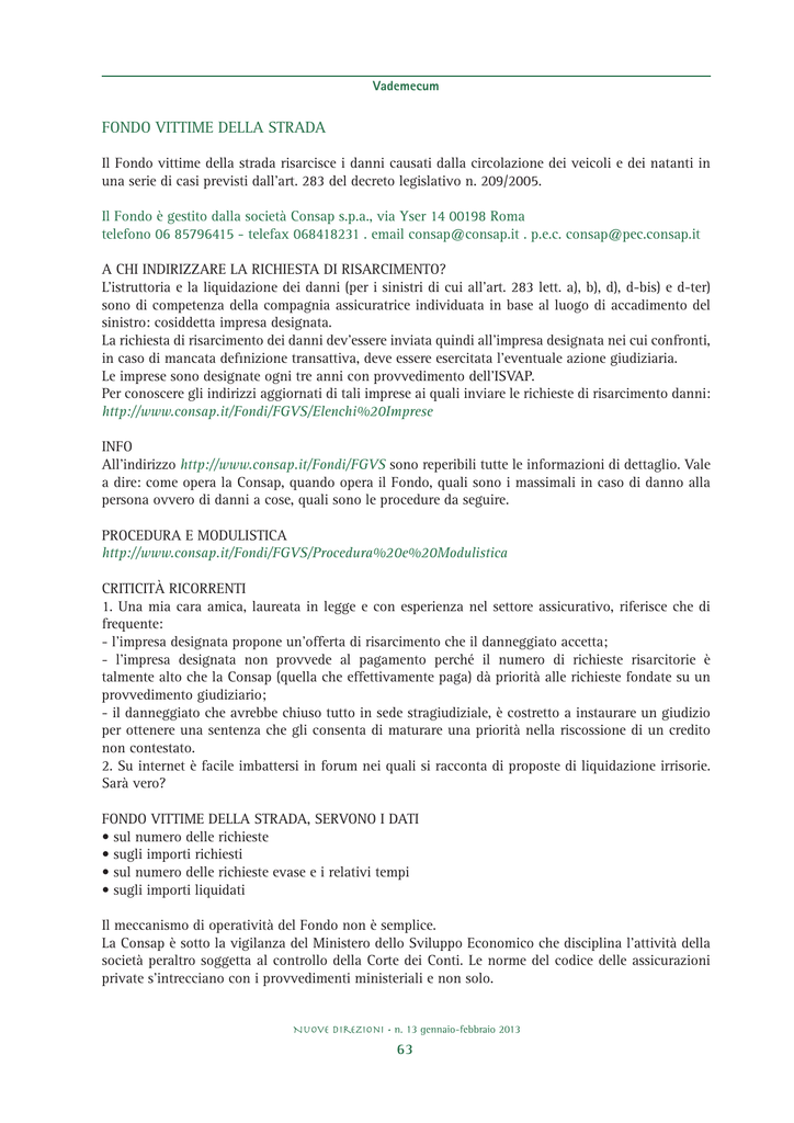 Vademecum FONDO VITTIME DELLA STRADA Il Fondo vittime della strada risarcisce i danni causati dalla circolazione dei veicoli e dei natanti in una serie di casi previsti dall’art. 283 del decreto legislativo n. 209/2005. Il Fondo è gestito dalla società Consap s.p.a., via Yser 14 00198 Roma telefono 06 85796415 - telefax 068418231 . email [email protected] . p.e.c. [email protected] A CHI INDIRIZZARE LA RICHIESTA DI RISARCIMENTO? L’istruttoria e la liquidazione dei danni (per i sinistri di cui all’art. 283 lett. a), b), d), d-bis) e d-ter) sono di competenza della compagnia assicuratrice individuata in base al luogo di accadimento del sinistro: cosiddetta impresa designata. La richiesta di risarcimento dei danni dev’essere inviata quindi all’impresa designata nei cui confronti, in caso di mancata definizione transattiva, deve essere esercitata l’eventuale azione giudiziaria. Le imprese sono designate ogni tre anni con provvedimento dell’ISVAP. Per conoscere gli indirizzi aggiornati di tali imprese ai quali inviare le richieste di risarcimento danni: http://www.consap.it/Fondi/FGVS/Elenchi%20Imprese INFO All’indirizzo http://www.consap.it/Fondi/FGVS sono reperibili tutte le informazioni di dettaglio. Vale a dire: come opera la Consap, quando opera il Fondo, quali sono i massimali in caso di danno alla persona ovvero di danni a cose, quali sono le procedure da seguire. PROCEDURA E MODULISTICA http://www.consap.it/Fondi/FGVS/Procedura%20e%20Modulistica CRITICITÀ RICORRENTI 1. Una mia cara amica, laureata in legge e con esperienza nel settore assicurativo, riferisce che di frequente: - l’impresa designata propone un’offerta di risarcimento che il danneggiato accetta; - l’impresa designata non provvede al pagamento perché il numero di richieste risarcitorie è talmente alto che la Consap (quella che effettivamente paga) dà priorità alle richieste fondate su un provvedimento giudiziario; - il danneggiato che avrebbe chiuso tutto in sede stragiudiziale, è costretto a instaurare un giudizio per ottenere una sentenza che gli consenta di maturare una priorità nella riscossione di un credito non contestato. 2. Su internet è facile imbattersi in forum nei quali si racconta di proposte di liquidazione irrisorie. Sarà vero? FONDO VITTIME DELLA STRADA, SERVONO I DATI sSULNUMERODELLERICHIESTE sSUGLIIMPORTIRICHIESTI sSULNUMERODELLERICHIESTEEVASEEIRELATIVITEMPI sSUGLIIMPORTILIQUIDATI Il meccanismo di operatività del Fondo non è semplice. La Consap è sotto la vigilanza del Ministero dello Sviluppo Economico che disciplina l’attività della società peraltro soggetta al controllo della Corte dei Conti. Le norme del codice delle assicurazioni private s’intrecciano con i provvedimenti ministeriali e non solo. 6]W^MLQZMbQWVQn. 13 gennaio-febbraio 2013 63