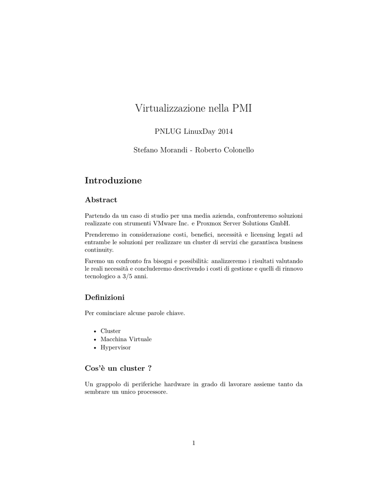 Virtualizzazione nella PMI PNLUG LinuxDay 2014 Stefano Morandi - Roberto Colonello Introduzione Abstract Partendo da un caso di studio per una media azienda, confronteremo soluzioni realizzate con strumenti VMware Inc. e Proxmox Server Solutions GmbH. Prenderemo in considerazione costi, benefici, necessità e licensing legati ad entrambe le soluzioni per realizzare un cluster di servizi che garantisca business continuity. Faremo un confronto fra bisogni e possibilità: analizzeremo i risultati valutando le reali necessità e concluderemo descrivendo i costi di gestione e quelli di rinnovo tecnologico a 3/5 anni. Definizioni Per cominciare alcune parole chiave. • Cluster • Macchina Virtuale • Hypervisor Cos’è un cluster ? Un grappolo di periferiche hardware in grado di lavorare assieme tanto da sembrare un unico processore. 1 Cos’è una Macchina Virtuale ? In informatica una macchina virtuale è una emulazione/copia di un particolare computer. Macchina Virtuale = Virtual Machine = VM • • • • compatibilità isolamento incapsulamento indipendenza hardware Cos’è un Hypervisor ? Un insieme di hardware, software e firmware in grado di “far correre” le macchine virtuali. Perchè virtualizzare ? Cenni storici della virtualizzazione (anni ’60-’70) Il software era legato all’hardware. 2 3 Al cambio dell’hardware cambiava anche il software. Utilizzi moderni • • • • massimizzare l’utilizzo dell’hardware continuità di servizi (business continuity) scalabilità sicurezza Ipotesi di lavoro Modello comparativo La comparazione fra le due soluzioni adotta i seguenti principi e semplificazioni : • • • • • identico hardware stesso storage condiviso networking uguale identico livello tecnico del partner di supporto stesso delta tempo Dotazione Hardware progetto 2012 Server N°2 PowerEdge R710 • • • • Processore Intel Xeon E5645 da 2,40GHz Ram 6 x 16GB Memory Dual Rank LV RDIMM 1333MHz Rete Intel Gigabit ET Quad Port Server Adapter Doppio alimentatore Storage NetAPP FAS2040-S2-R5 Totale di 7,2 TB. Il FAS2040 NetApp è una dispositivo iSCSI / FC SAN / NAS storage scalabile con capacità fino a 136TB 4 5 Network Switch HP 5406 • 1 Modulo 24 porte fibra • 5 Moduli 20 porte rame gigabit + 4 fibra • 288 Gbps routing/switching capacity • 214 million pps throughput Case history Caso reale per un azienda della provincia di Pordenone con 150 dipendenti, con i seguenti servizi virtualizzati : • • • • • • • • • 1 1 1 2 3 1 1 1 1 Domain controller File server Printer server Terminal Server DBserver Cad License server Data logger SCADA (supervisory control and data acquisition) Document development workflow 6 Post installazione Training Corso di formazione tecnica Ambiente di stage Cluster da usare per training / test. Costi di mantenimento Aggiornamento dell’intero cluster. Soluzione VMware VMware VMware Inc è una public company, fondata nel 1998 a Palo Alto, specializzata nella realizzazione di hypervisors. Quale versione ? Vmware vSphere ENTERPRISE Edition Si veda : http://www.vmware.com/products/vsphere/compare Versione Enterprise • • • • • • • High Availability Data Recovery vMotion Virtual Serial Port Concentrator Hot Add vShield Zones Faul Tolerance 7 Versione Enterprise • • • • • Storage API for Array Integration Multipathing Storage vMotion Distribuite Resources Scheduler Distribuited Power Management HA Riavvia le VM su un altro host in caso di guasto hardware ATTENZIONE : Riduce al minimo ma non annulla i tempi di inattività del sistema dopo un guasto. vMotion Permette la migrazione delle macchine fra gli host, permettendo manutenzioni e ridistribuzione dei carichi “a caldo”. HA:Automatico=vMotion:Manuale Data Recovery Data Recovery / Data Protection Salvataggio dei file che compongono la macchina virtuale. Virtual Serial Port Concentrator Hub di porte seriali. Hot Add Ampliare il cluster, senza interruzione di servizi (scalabilità). vShield Zones Firewall. 8 Fault Tolerance In caso di guasto il sistema reagisce per garantire la continuità dei servizi. Storage API for Array Integration (Multipathing) Storage vendor Application Programming Interface. Storage vMotion Spostare i file delle macchine virtuali su diversi repository. Distribuite Resources Scheduler Bilancia il carico. Distribuited Power Management Bilancia il consumo energetico. Costi Licenze • N°2 Vmware vSphere ENTERPRISE Edition (1CPU) e2.441 • N°2 Vmware Product support for vSphere Enterprise Edition (1CPU) per 1 anno e647 • Vmware vCenter Server FOUNDATION Edition for vSphere (Limitato a 3 CPU) e1.270 • Vmware Production Support/Subscription per vCenter Server Foundation per 1 anno e580 • Totale Licenze = e8.026 9 Training Corso base presso un ente certificato. • Vmware vSphere 5.5: Install, Configure, Manage circa e3.000 • Certificazione : Circa e200 per l’esame Ambiente di stage • Sistema di prova per poter testare nuovi servizi, configurazioni e migrazione. • Demo di 60 giorni. Mantenimento Visione a 5 anni(dal secondo). • N°2 vSphere Enterprise Edition (1CPU) per 1 anno e580 • N°1 vCenter Server Faundation per 1 anno e420 • Totale : e4640 + 1680 = e6.410 Proiezione a 5 anni Iniziale e 8.026 Mantenimento e 6.320 Formazione (2 moduli) e 6.000 – – Totale e 20.346 Soluzione ProxmoxVE ProxmoxVE We think software should be open source and easy-to-use – for better work and life proxmox team 10 Cosa offre • • • • • High Availability Live migration Live storage migration Live Backup Flexible Storage Cosa offre • • • • Firewall (cluster) Single-view for Mangagement REST web API Containers (!) Vantaggi Open Source - AGPL :-) Flessibilità • • • • Nella configurazione del cluster Gestione tramite Web Containers (OpenVZ/LXC) Snapshot (kvm + qcow2) Flessibilità • Nella configurazione dello storage • NFS/LVM/iSCSI (LUN) • Cluster FS supportati da PVE – GlusterFS 