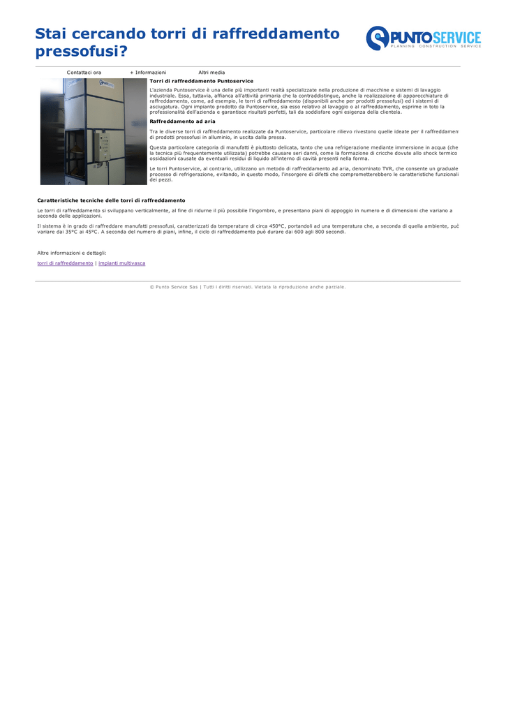 Stai cercando torri di raffreddamento pressofusi? C ontattaci ora + Informazioni Altri media Torri di raffreddamento Puntoservice L'azienda Puntoservice è una delle più importanti realtà specializzate nella produzione di macchine e sistemi di lavaggio industriale. Essa, tuttavia, affianca all'attività primaria che la contraddistingue, anche la realizzazione di apparecchiature di raffreddamento, come, ad esempio, le torri di raffreddamento (disponibili anche per prodotti pressofusi) ed i sistemi di asciugatura. Ogni impianto prodotto da Puntoservice, sia esso relativo al lavaggio o al raffreddamento, esprime in toto la professionalità dell'azienda e garantisce risultati perfetti, tali da soddisfare ogni esigenza della clientela. Raffreddamento ad aria Tra le diverse torri di raffreddamento realizzate da Puntoservice, particolare rilievo rivestono quelle ideate per il raffreddamento di prodotti pressofusi in alluminio, in uscita dalla pressa. Questa particolare categoria di manufatti è piuttosto delicata, tanto che una refrigerazione mediante immersione in acqua (che è la tecnica più frequentemente utilizzata) potrebbe causare seri danni, come la formazione di cricche dovute allo shock termico o ossidazioni causate da eventuali residui di liquido all'interno di cavità presenti nella forma. Le torri Puntoservice, al contrario, utilizzano un metodo di raffreddamento ad aria, denominato TVR, che consente un graduale processo di refrigerazione, evitando, in questo modo, l'insorgere di difetti che comprometterebbero le caratteristiche funzionali dei pezzi. Caratteristiche tecniche delle torri di raffreddamento Le torri di raffreddamento si sviluppano verticalmente, al fine di ridurne il più possibile l'ingombro, e presentano piani di appoggio in numero e di dimensioni che variano a seconda delle applicazioni. Il sistema è in grado di raffreddare manufatti pressofusi, caratterizzati da temperature di circa 450°C , portandoli ad una temperatura che, a seconda di quella ambiente, può variare dai 35°C ai 45°C . A seconda del numero di piani, infine, il ciclo di raffreddamento può durare dai 600 agli 800 secondi. Altre informazioni e dettagli: torri di raffreddamento | impianti multivasca © Punto Se rvice Sas | Tutti i diritti rise rvati. Vie tata la riproduzione anche parziale .