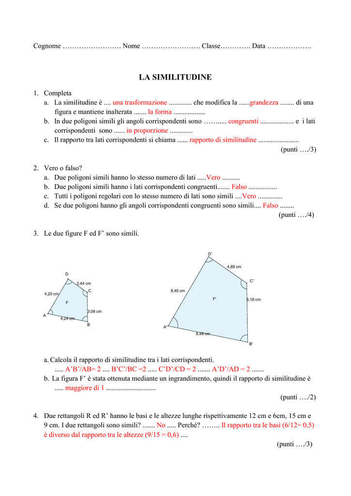 Cognome ……………………. Nome ……………………. Classe…………. Data ………………. LA SIMILITUDINE 1. Completa a. La similitudine è .... una trasformazione ............. che modifica la ......grandezza ........ di una figura e mantiene inalterata ....... la forma .................. b. In due poligoni simili gli angoli corrispondenti sono ……..... congruenti ................... e i lati corrispondenti sono ...... in proporzione ............. c. Il rapporto tra lati corrispondenti si chiama ...... rapporto di similitudine ....................... (punti …./3) 2. Vero o falso? a. Due poligoni simili hanno lo stesso numero di lati .....Vero .......... b. Due poligoni simili hanno i lati corrispondenti congruenti....... Falso ................ c. Tutti i poligoni regolari con lo stesso numero di lati sono simili ....Vero .............. d. Se due poligoni hanno gli angoli corrispondenti congruenti sono simili.... Falso ........ (punti …./4) 3. Le due figure F ed F’ sono simili. D' 4,88 cm D C' 2,44 cm C 4,20 cm 8,40 cm F' F 6,16 cm 3,08 cm A 4,24 cm B A' 8,48 cm B' a. Calcola il rapporto di similitudine tra i lati corrispondenti. ..... A’B’/AB= 2 .... B’C’/BC =2 ..... C’D’/CD = 2 ....... A’D’/AD = 2 ....... b. La figura F’ è stata ottenuta mediante un ingrandimento, quindi il rapporto di similitudine è ..... maggiore di 1 ............................ (punti …./2) 4. Due rettangoli R ed R’ hanno le basi e le altezze lunghe rispettivamente 12 cm e 6cm, 15 cm e 9 cm. I due rettangoli sono simili? ....... No ..... Perché? …….. Il rapporto tra le basi (6/12= 0,5) è diverso dal rapporto tra le altezze (9/15 = 0,6) .... (punti …./3) 5. Completa. a. Per il 1° criterio di similitudine, due triangoli sono simili se hanno …….…gli angoli………… ordinatamente congruenti. b. Per il 2° criterio di similitudine, due triangoli sono simili se hanno ………due lati ….…… in proporzione e l’angolo tra essi compreso …… congruente ……… c. Per il 3° criterio di similitudine, due triangoli sono simili se hanno i lati corrispondenti in … proporzione ...... (punti …./3) 6. Rispondi e giustifica il perché. a. Due triangoli isosceli con gli angoli al vertice congruenti sono simili?..........Sì.......... Perché ........anche gli angoli alla base saranno congruenti. Saranno simili per il 1° criterio........ b. Due triangoli rettangoli che hanno un angolo acuto congruente sono simili? ....Sì...... Perché .......avranno anche l’altro angolo acuto congruente. Saranno simili per il 1° criterio......... c. Due triangoli isoceli aventi un angolo alla base di 70° sono simili?.....Sì....... Perché......... ........avranno anche l’angolo al vertice congruente. Saranno simili per il 1° criterio........... d. Due triangoli equilateri sono sempre simili ...Sì.... Perché...il rapporto tra i lati corrispondenti, essendo tutti congruenti, si mantiene costante. Saranno simili per il 3° criterio......... (punti …./4) 7. Di due triangoli ABC e A’B’C’ hai le seguenti informazioni: AB = 15 cm A’B’ = 10 cm AC = 12 cm A’C’ = 8 cm = ’= 48° I due triangoli sono simili? ....... Sì ....... Se sì, per quale criterio di similitudine?................... .................. per il 2° criterio A’B’/AB = A’C’/AC = 2/3 .......................................... (punti …./3) 8. Osserva il disegno nel quale sono rappresentati due triangoli isosceli. C' 46 ° C 67 ° A B A' B' I due triangoli sono simili? ...Sì..... Giustifica la risposta....Nel primo triangolo ogni angolo alla base misurerà 67° e l’angolo al vertice 46° (180° - 2x 67° = 46°), nel secondo triangolo gli angoli alla base misureranno 67° (180° - 46° : 2 = 67°) quindi i due triangoli saranno simili per il 1° criterio) .................................. (punti …./3)