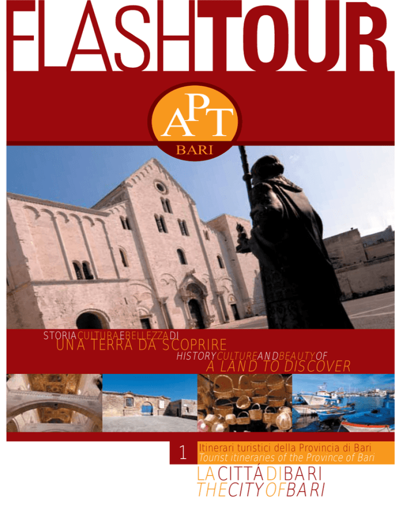 P AT BARI STORIACULTURAEBELLEZZADI UNA TERRA DA SCOPRIRE HISTORYCULTUREANDBEAUTYOF A LAND TO DISCOVER 1 Itinerari turistici della Provincia di Bari Tourist itineraries of the Province of Bari LACITTÁDIBARI THECITYOFBARI Itinerari turistici Tourist itineraries della Provincia of the Province di Bari of Bari BARI CITTÁ DA SCOPRIRE BARI CITY TO DISCOVER La FLASHTOUR Puglia è stata una terra vissuta e visitata da numerosi popoli. Arrivavano dal mare e scorgevano una lunga striscia verde piena di luce, profumi e gente ospitale. Greci, Romani, Bizantini, Arabi, Normanni, Svevi e Aragonesi: popoli e culture che hanno lasciato tangibili segni del loro passaggio. I tempi e i viaggiatori oggi sono diversi, ma queste terre, ricche di fascino e cultura, accolgono ancora con grande entusiasmo nuove idee che si fondono con antiche tradizioni. Chi arriva in Puglia trova sempre qualcosa di famigliare in cui riconoscersi. Questa breve guida propone le strade, che tra passato e presente, conducono il viaggiatore alla ricerca di qualcosa di unico e raro, fuori dai tempi e luoghi comuni. Per il visitatore di oggi Bari è la porta di accesso per questi “percorsi della riscoperta”. A pulia has had many invaders from different civilizations. They arrived from the sea to a land full of light, scents and hospitable people. Greeks, Romans, Byzantines, Normans, Swabians and Aragonese: people and cultures which have left their marks in these lands. Times and travellers are different nowadays, but in our land, rich in charm and culture, new ideas and ancient traditions live in harmony. Everyone arriving in Apulia finds something familiar so that he feels at home. This short guide suggests different itineraries between past and present, in places rich in traditions and history. Bari is the point of departure for these itineraries through Apulia for today’s visitor. La Cattedrale di Bari vista dal Castello Svevo The Cathedral of Bari. View from the Swabian Castle 1 LACITTÁDIBARI THECITYOFBARI UNA PANORAMICA A SCENIC TOUR SUL CAPOLUOGO OF THE CITY Il Lungomare di Bari Bari è una città di mare con il nucleo antico che si affaccia direttamente sul Lungomare, il più lungo d’Italia. Seguendo il mare verso Sud si scoprono gli splendidi palazzi umbertini e tra questi il Teatro Kursaal Santalucia, esempio di stile Liberty. Proseguendo si incontrano il Palazzo della Provincia con la sua Pinacoteca ed i palazzi monumentali in stile littorio come l’Albergo delle Nazioni. Paralleli al mare si sviluppano i quartieri di Madonella e Japigia. Continuando ancora verso Sud si raggiunge Torre a Mare, caratteristico borgo di pescatori che deve il suo nome ad una antica torre facente parte del sistema di avvistamento che corre lungo tutta la costa pugliese. Lungomare - il Fortino Il Lungomare a Nord, con la stazione marittima ed il porto permette di raggiungere la Fiera del Levante (www.fieradellevante.it - Tel. 080.5366111) sede di manifestazioni e fiere specializzate, come la Campionaria di Settembre, Orolevante, Modalevante ed Expolevante. Proseguendo lungo la SS. 16 si arriva alle frazioni di Palese e S. Spirito, con i porticcioli ed i numerosi locali, dove trascorrere gradevoli serate. La particolarità di questi piccoli borghi è di aver conservato una propria 2 FLASHTOUR The sea front Bari is a seaside town and the old town overlooks the sea front which is the longest in Italy. Proceeding along the seafront, we suggest you to go southwards where you can discover the splendid buildings built in the reign ofUmberto Ist, such as the Kursaal Santalucia Theatre in Liberty style. Following the sea front you come to the Palace of the Provincial Council with its Picture Gallery, and the monumental palaces built during the Fascist epoch such as the Albergo delle Nazioni. Along the sea stretch two of the city’s Quarters: Madonnella and Japigia. The road south along the sea leads to Torre a Mare, a small fishing town , whose name comes from an ancient Angevin watch – tower, like many others along all the Apulian coast. Following the sea front norThe sea front - The Fort thwards, you can find the Fiera del Levante (Tel. 080.536.61.11 www.fieradellevante.it). This is the seat of important trade exhibitions such as the trade fair (in September), Orolevante, Modalevante and Expolevante. Following the S.S.16 you reach Palese and S. Spirito, two pleasant small villages with small harbours and many places where you can spend pleasant evenings. They are worth visiting because they have preserved their own identity, so picturesque and different from that of the main city. FLASHTOUR LACITTÁDIBARI THECITYOFBARI UNA PANORAMICA A SCENIC TOUR SUL CAPOLUOGO OF THE CITY identità, semplice e popolare, così diversa da quella della città. La città moderna, appena al di fuori del borgo antico, fu fondata nel 1813 da Gioacchino Murat, che pose la prima pietra all’incrocio tra Corso Vittorio Emanuele e Corso Cavour, che costituiscono due dei lati del quartiere Murattiano. Via Quintino Sella lo separa dal quartiere Libertà e la Ferrovia lo delimita a Sud: Al di là di questa sorgono i quartieri residenziali di San Pasquale, Picone e Carrassi. In quest’ultimo si trovano la Chiesa Russa Ortodossa di San Nicola con le sue cupole verdi ed il parco di Largo 2 Giugno. Proseguendo verso l’interno troviamo il moderno quartiere di Poggiofranco. L’ampia tangenziale che corre da Nord a Sud, permette il collegamento con i quartieri San Paolo e Stanic. La Vecchia Bari, racchiude la storia, l’anima di questa città. In origine era protetta da una cinta muraria della quale rimane solo la parte sul mare, “la Muraglia” lambita dalle acque del mare sino agli anni Trenta. Molto suggestiva è la visione che si ha su via Venezia. Partendo da Piazza del Ferrarese e percorrendo le mura, ci si affaccia su uno degli scorci più belli di Bari: il piccolo porticciolo, le palme, il colonnato traiano, il Teatro Margherita, il Circolo Canottieri Barion e
