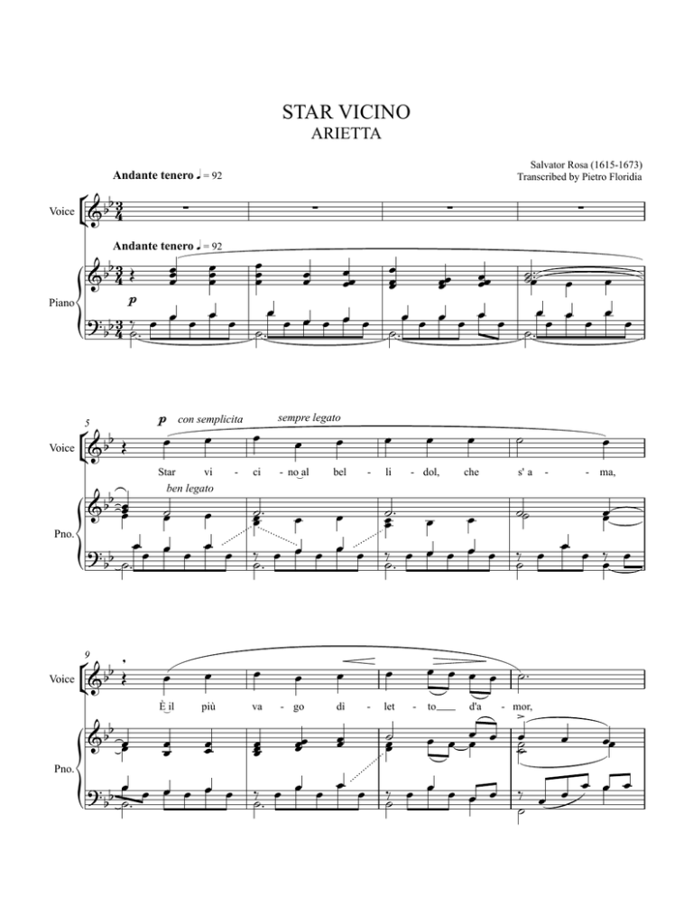 STAR VICINO ARIETTA Salvator Rosa (1615-1673) Transcribed by Pietro Floridia Andante tenero q = 92 Voice Andante tenero q = 92 Piano Pno. p con semplicita Star vi ben legato 9 Voice Pno. p 5 Voice - sempre legato ci - no_al - li - dol, s' a È_il più va - go dì - let - to che d'a bel - - ma, - mor, 2 13 Voice è_il più va Pno. - il più va 21 Voice Pno. pp pp più - go di È_il più va - - va - go di - let - let - to d'a - - - - to d'a - - Pno. go, il 17 Voice mor - mor - - - 3 25 Voice go, Pno. il 34 ta poco rall. pp p - let d'a - - mor! a tempo to a tempo p È d'a mp Star lon ben legato - no dal ben che si bra - ma, - mo - re_il più È d'a - mo Voice 39 Pno. va Voice Pno. di più Pno. - go 29 Voice poco rall. vi - vo do - lor, - re il più vi - vo, il più 4 Voice 44 Pno. vi - vo do Pno. - lor, è d'a pp mo pp d'a vi do Pno. - re_il più meno mosso, rallentando è d'a - mor ppp più vi - vo do - - mor, 53 Voice - re_il rall. ppp È - Ossia lor, Voice - vo col canto - lor! a tempo morendo