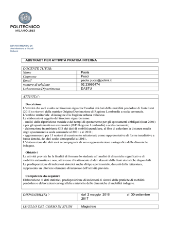 DIPARTIMENTO DI Architettura e Studi Urbani ABSTRACT PER ATTIVITÀ PRATICA INTERNA DOCENTE TUTOR: Nome Cognome Email numero di telefono Laboratorio/Dipartimento Paola Pucci [email protected] 02 23995474 DASTU ATTIVITA’: Descrizione L’attività che sarà svolta nel tirocinio riguarda l’analisi dei dati della mobilità pendolare di fonte Istat (2011) e ricavati della matrice Origine/Destinazione di Regione Lombardia a scala comunale. L’ambito territoriale di indagine è la Regione urbana milanese. Le elaborazioni oggetto del tirocinio riguarderanno: - analisi della ripartizione modale e dei tempi di spostamento per gli spostamenti obbligati (Istat 2001) e per gli spostamenti non sistematici (O/D Regione Lombardia) a scala comunale; - elaborazione in ambiente GIS dei dati di mobilità pendolare, al fine di calcolare la distanza media degli spostamenti a scala comunale al 2001 e al 2011; - aggiornamento per 15 sezioni di censimento selezionate come rappresentative di forme insediative a bassa densità, dei dati socio-demografici al 2011. L’elaborazione dei dati sarà accompagnata da una rappresentazione cartografica delle dinamiche indagate. Obiettivi La attività prevista ha la finalità di formare lo studente all’analisi di dinamiche significative di mobilità sistematica e non, attraverso il trattamento di dati desunti dalle fonti statistiche disponibili. La predisposizione di indicatori sintetici anche di tipo sperimentale, desunti dalla letteratura, rappresenta un ulteriore elemento di interesse dell’attività prevista. Competenze da acquisire Elaborazione di dati statistici, predisposizione di indicatori di sintesi delle pratiche di mobilità pendolare e elaborazioni cartografiche sintetiche delle dinamiche di mobilità indagate. DISPONIBILITA’: dal 2 maggio 2016 2017 LIVELLO DEL CORSO DI STUDI Magistrale al 30 settembre DEL CANDIDATO: CORSO DI STUDI D’INTERESSE: X Architetture X Pianificazione Urbana Ingegneria Edile Gestione del Costruito …. LUOGO DI EFFETTUAZIONE DURATA IN ORE/MESI MODALITA’ DI EFFETTUAZIONE COMPETENZE LINGUISTICHE RICHIESTE COMPETENZE SOFTWARE RICHIESTE ALTRE COMPETENZE TECNICHE RICHIESTE DASTU Politecnico di Milano 150 ore part-time Italiano e inglese GIS, Excel, Access