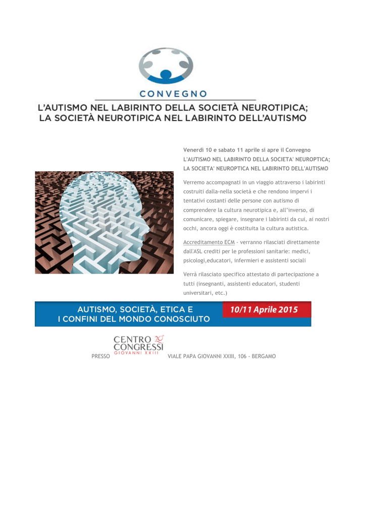 Venerdì 10 e sabato 11 aprile si apre il Convegno L'AUTISMO NEL LABIRINTO DELLA SOCIETA' NEUROPTICA; LA SOCIETA' NEUROPTICA NEL LABIRINTO DELL'AUTISMO Verremo accompagnati in un viaggio attraverso i labirinti costruiti dalla-nella società e che rendono impervi i tentativi costanti delle persone con autismo di comprendere la cultura neurotipica e, all’inverso, di comunicare, spiegare, insegnare i labirinti da cui, ai nostri occhi, ancora oggi è costituita la cultura autistica. Accreditamento ECM - verranno rilasciati direttamente dall'ASL crediti per le professioni sanitarie: medici, psicologi,educatori, infermieri e assistenti sociali Verrà rilasciato specifico attestato di partecipazione a tutti (insegnanti, assistenti educatori, studenti universitari, etc.) PRESSO VIALE PAPA GIOVANNI XXIII, 106 - BERGAMO Il convegno Al di là dei metodi, dei modelli, delle scuole di pensiero, delle ricette preconfezionate e, ancor più, al di là degli imbonitori e dei miracle workers,esiste una battaglia continua che le famiglie, gli operatori e, soprattutto, le persone con autismo sono chiamate a combattere giornalmente. Oggi sappiamo sull’autismo molto più di quanto sapessimo trenta, venti o anche solo 10 anni fa. Eppure, parole e concetti quali integrazione, rispetto, adattamento, individualizzazione rimangono spesso lontani dalla pratica e dall’esperienza quotidiana. I relatori presenti a questo convegno hanno dedicato la propria vita a promuovere la cultura dell’autismo che significa innanzitutto comprendere l’autismo, capirne le esigenze, intuirne le potenzialità e i talenti, evidenziarne i diritti. Verremo accompagnati in un viaggio attraverso i labirinti costruiti dalla-nella società e che rendono impervi i tentativi costanti delle persone con autismo di comprendere la cultura neurotipica e, all’inverso, di comunicare, spiegare, insegnare i labirinti da cui, ai nostri occhi, ancora oggi è costituita la cultura autistica. Nel corso della seconda giornata, i relatori saranno a disposizione per un microfono aperto condotto da Flavia Caretto che porrà loro stimolanti quesiti e offrirà la possibilità al pubblico di fare altrettanto. PROGRAMMA CONVEGNO PROGRAMMA CONVEGNO Venerdì 10 aprile h. 8,00 Registrazione partecipanti h. 9.00 Introduzione e apertura dei lavori h. 9.15 Intervento ASL di Bergamo -Dott. Renato Bresciani- "La funzione dell'ASL nella promozione del dialogoconfronto fra Servizi e Associazionismo familiare" h. 9.30 Olga Bogdashina -L’autismo e i confini del mondo conosciuto: (iper)sensibilità, linguaggio e realtà costruita h.11.45 Theo Peeters - Autismo e società: le persone con autismo dovrebbero essere integrate… mentre è la società che dovrebbe esserlo (prima parte) h. 13.00 Pausa pranzo h. 14.00 Theo Peeters - Autismo e Società (seconda parte) h. 15.00 Intervento dell’Università di Bergamo h. 15.30 Hilde DeClercq -Autismo e aspetti etici h 17.45 Conclusione e chiusura dei lavori h. 18.00 Congedo Sabato 11 aprile h. 8,00 Registrazione partecipanti h. 9.00 introduzione e apertura dei lavori, Flavia Caretto h. 9.15 Luisa Di Biagio – intervento “Amanti, Madri, Professioniste: la diagnosi di autismo nell’universo femminile h.10.45 Microfono Aperto condotto da Flavia Caretto con la presenza di Hilde DeClercq, Olga Bogdashina, Luisa Di Biagio, Enza Crivelli, Theo Peeters h. 13.00 chiusura dei lavori e congedo RELATORI RELATORI I relatori invitati, considerati fra le massime autorità mondiali specializzate nei disturbi delle spettro autistico saranno: Flavia Caretto, psicologa, psicoterapeuta di formazione comportamentale e cognitiva. Lavora con persone autistiche da oltre vent'anni, è stata responsabile del Centro Sperimentale per l'Autismo di Roma e ha lavorato presso il Servizio N.P.I. al Policlinico di Roma Tor Vergata. Attualmente è consulente per il Centro di Riferimento per l'Autismo dell' Aquila. E' presidente e fondatrice dell'Associazione CulturAutismo. Theo Peeters, neurolinguista belga specializzato nei disturbi dello spettro autistico. E' considerato una delle massime autorità mondiali in questo campo; le sue numerose pubblicazioni, i suoi corsi di formazione e le conferenze appassionanti che tiene in ogni parte del mondo ne fanno uno degli esperti di autismo più competenti ed empatici. Egli mette in particolare l'accento sull'importanza di comprendere la "cultura dell'autismo" e di sviluppare il massimo grado di empatia nei confronti degli individui che si collocano nello spettro. E' il fondatore dell'Opleidingscentrum Autisme (centro di formazione per l'Autismo) ad Anversa, in Belgio ed è autore di numerosi saggi sull'autismo, tradotti in molte lingue. Hilde De Clercq, linguista e autrice di libri e di articoli sull’autismo. E' madre di una persona con autismo e tiene conferenze e corsi di formazione in Europa e altrove su diversi argomenti come la comunicazione, il modo di pensare delle persone con autismo, la sindrome di Asperger, la collaborazione fra genitori e professionisti, etc. E' nella direzione del Centro di Formazione per l’Autismo di Anversa; collabora con l’Università di Birmingham (UK) e con il programma di Stato Teacch nella Carolina del Nord (USA). Olga Bogdashina, è Master in educazione sull’autismo e PhD in linguistica. Ha svolto un lavoro approfondito nel campo dell’autismo come insegnante e ricercatrice, con un interesse particolare verso i problemi comunicativi e di percezione sensoriale. Dal 1994 è direttrice del primo Centro Diurno per bambini autistici in Ucraina e presidente della Autism Society dell’Ucraina. Insegna e tiene conferenze in tutto il mondo. È consulente dei Servizi per Adulti con Autismo a Doncaster (UK). Ha un figlio autistico adolescente. Luisa Di Biagio, etologa e psicologa autistica sana, autrice di diversi libri, scritti con gli occhi di una persona Asperger Enza Crivelli, pedagogista clinica e responsabile pr l'autismo del polo distaccato di neuropsichiatria "Il Tub