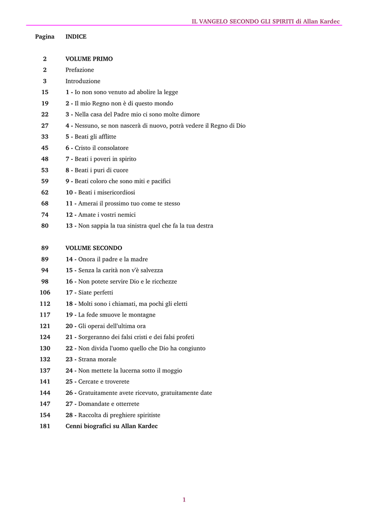IL VANGELO SECONDO GLI SPIRITI di Allan Kardec Pagina INDICE 2 VOLUME PRIMO 2 Prefazione 3 Introduzione 15 1 Io non sono venuto ad abolire la legge 19 2 Il mio Regno non è di questo mondo 22 3 Nella casa del Padre mio ci sono molte dimore 27 4 Nessuno, se non nascerà di nuovo, potrà vedere il Regno di Dio 33 5 Beati gli afflitte 45 6 Cristo il consolatore 48 7 Beati i poveri in spirito 53 8 Beati i puri di cuore 59 9 Beati coloro che sono miti e pacifici 62 10 Beati i misericordiosi 68 11 Amerai il prossimo tuo come te stesso 74 12 Amate i vostri nemici 80 13 Non sappia la tua sinistra quel che fa la tua destra 89 VOLUME SECONDO 89 14 Onora il padre e la madre 94 15 Senza la carità non v’è salvezza 98 16 Non potete servire Dio e le ricchezze 106 17 Siate perfetti 112 18 Molti sono i chiamati, ma pochi gli eletti 117 19 La fede smuove le montagne 121 20 Gli operai dell’ultima ora 124 21 Sorgeranno dei falsi cristi e dei falsi profeti 130 22 Non divida l’uomo quello che Dio ha congiunto 132 23 Strana morale 137 24 Non mettete la lucerna sotto il moggio 141 25 Cercate e troverete 144 26 Gratuitamente avete ricevuto, gratuitamente date 147 27 Domandate e otterrete 154 28 Raccolta di preghiere spiritiste 181 Cenni biografici su Allan Kardec 1 IL VANGELO SECONDO GLI SPIRITI di Allan Kardec VOLUME PRIMO Non esiste altra fede incrollabile se non quella che può affrontare la ragione faccia a faccia, in tutte le epoche dell’umanità. PREFAZIONE Gli Spiriti del Signore, che sono le virtù dei cieli, come un esercito immenso che muove appena ne ha avuto l’ordine, si effondono su tutta la superficie della terra. Simili a stelle che discendono dal cielo, vengono ad illuminare la strada e ad aprire gli occhi a coloro che non vedono. In verità vi dico, sono giunti i tempi in cui tutte le cose debbono essere ristabilite nel loro vero senso per dissipare le tenebre, confondere gli orgogliosi e glorificare i giusti. Le grandi voci del cielo risuonano come squilli di tromba e i cori degli angeli si radunano. Uomini, noi vi invitiamo al divino concerto. Che le vostre mani afferrino la cetra; che le vostre voci si uniscano e vibrino da un capo all’altro dell’universo, in un inno sacro. Uomini, fratelli che amiamo: vi siamo vicini. Amatevi anche voi gli uni gli altri, e, facendo la volontà del Padre che è in cielo, dite dal fondo del vostro cuore: “Signore! Signore!”, e potrete entrare nel regno dei cieli (*). (Lo SPIRITO DI VERITA’) (*) Questa istruzione, trasmessa per via medianica, compendia in pari tempo il vero carattere dello Spiritismo e lo scopo di quest’opera: per tale ragione è posta qui come prefazione. 2 IL VANGELO SECONDO GLI SPIRITI di Allan Kardec INTRODUZIONE I SCOPO DI QUEST’OPERA Le materie contenute nei Vangeli possono essere divise in cinque parti: gli atti ordinari della vita di Cristo, i miracoli, le predizioni, le parole che hanno servito alla fondazione dei dogmi della Chiesa e l’insegnamento morale. Se le prime quattro parti sono state oggetto di controversie, l’ultima è rimasta sempre incensurabile. L’incredulità stessa s’inchina davanti a questo codice divino; questo è il terreno su cui tutti i culti possono incontrarsi, la bandiera sotto cui tutti possono rifugiarsi, quali che siano le loro credenze, perché non è stata mai oggetto di dispute religiose. D’altronde, discutendola, le sette si sarebbero condannate da loro, poiché la maggior parte di esse ha dato maggior importanza alla parte mistica che non alla parte morale, questa esigendo la riforma di se stessa. Per gli uomini, particolarmente, essa è una regola di condotta che coinvolge tutte le circostanze della vita privata e pubblica, il principio di tutti i rapporti sociali fondati sulla giustizia più rigorosa; è infine, e soprattutto, la via infallibile della felicità a venire, un lembo del velo alzato sulla vita futura. Ed è questa parte che costituisce l’oggetto esclusivo di quest’opera. Il mondo intero ammira la morale evangelica; tutti ne proclamano la sublimità e la necessità, ma molti lo fanno soltanto per fiducia a quanto hanno sentito dire, o facendo fede a qualcuna delle massime che sono divenute proverbiali: pochi la conoscono a fondo, meno ancora sono coloro che la comprendono e sanno dedurne le conseguenze. La ragione di ciò è da cercarsi in gran parte nelle difficoltà che presenta la lettura del Vangelo, incomprensibile per la maggior parte degli uomini. La forma allegorica, il voluto misticismo del linguaggio, fanno sì che i più lo leggono per scarico di coscienza e per dovere, come leggono le preghiere senza capirle, e quindi senza frutto. I precetti morali, sparsi qua e là, confusi nella massa degli altri racconti, scivolano via senza che ci si renda conto di essi; diventa così impossibile afferrarne l’insieme e farli oggetto di una lettura e una meditazione particolari. E’ vero che si sono scritti trattati dì morale evangelica, ma il loro adattamento in stile letterario moderno toglie ad essi quella primitiva ingenuità che ne fece in pari tempo il fascino e l’autenticità. Altrettanto avviene per le massime separate, ridotte alla loro più semplice espressione proverbiale: divengono soltanto degli aforismi che, a causa della eliminazione dei fatti concomitanti e delle circostanze in cui sono stati pronunciati, perdono gran parte del loro valore. Per ovviare a questo inconveniente, abbiamo riunito in quest’opera gli articoli che possono costituire, parlando con proprietà, un codice etico universale, senza distinzioni di culto. Nelle citazioni abbiamo conservato tutto ciò che era necessario per seguire lo sviluppo del pensiero, sfrondando solo ciò che era estraneo al soggetto. Inoltre abbiamo rispettato la traduzione originale di Sacy (1) e la sua divisione in versetti. (1) Nella traduzione italiana abbiamo riprodotto integralmente il testo di “Il Santo Vangelo di N.S. Gesù Cristo”, delle “Edizioni Paoline” (6a edizione, 58